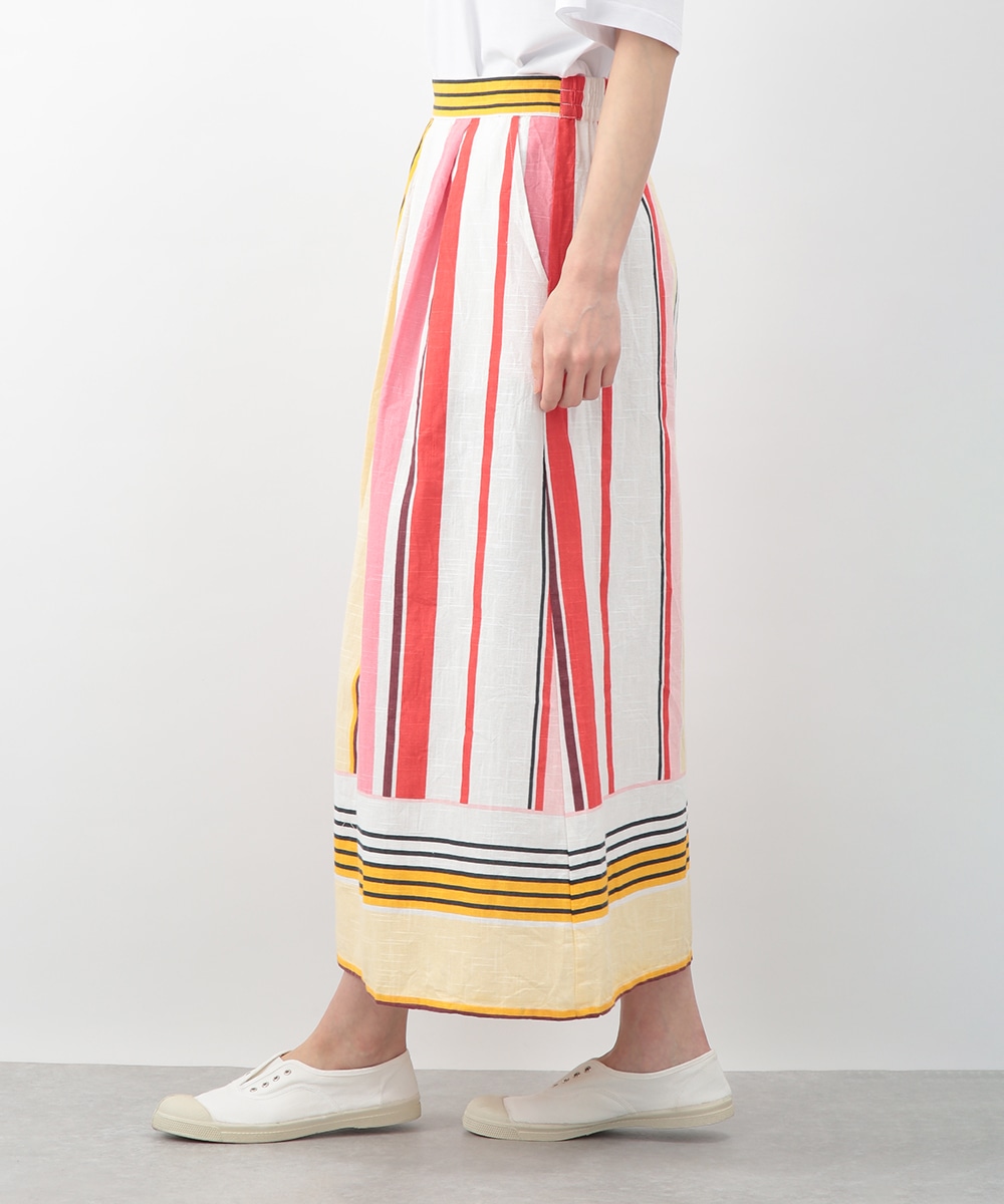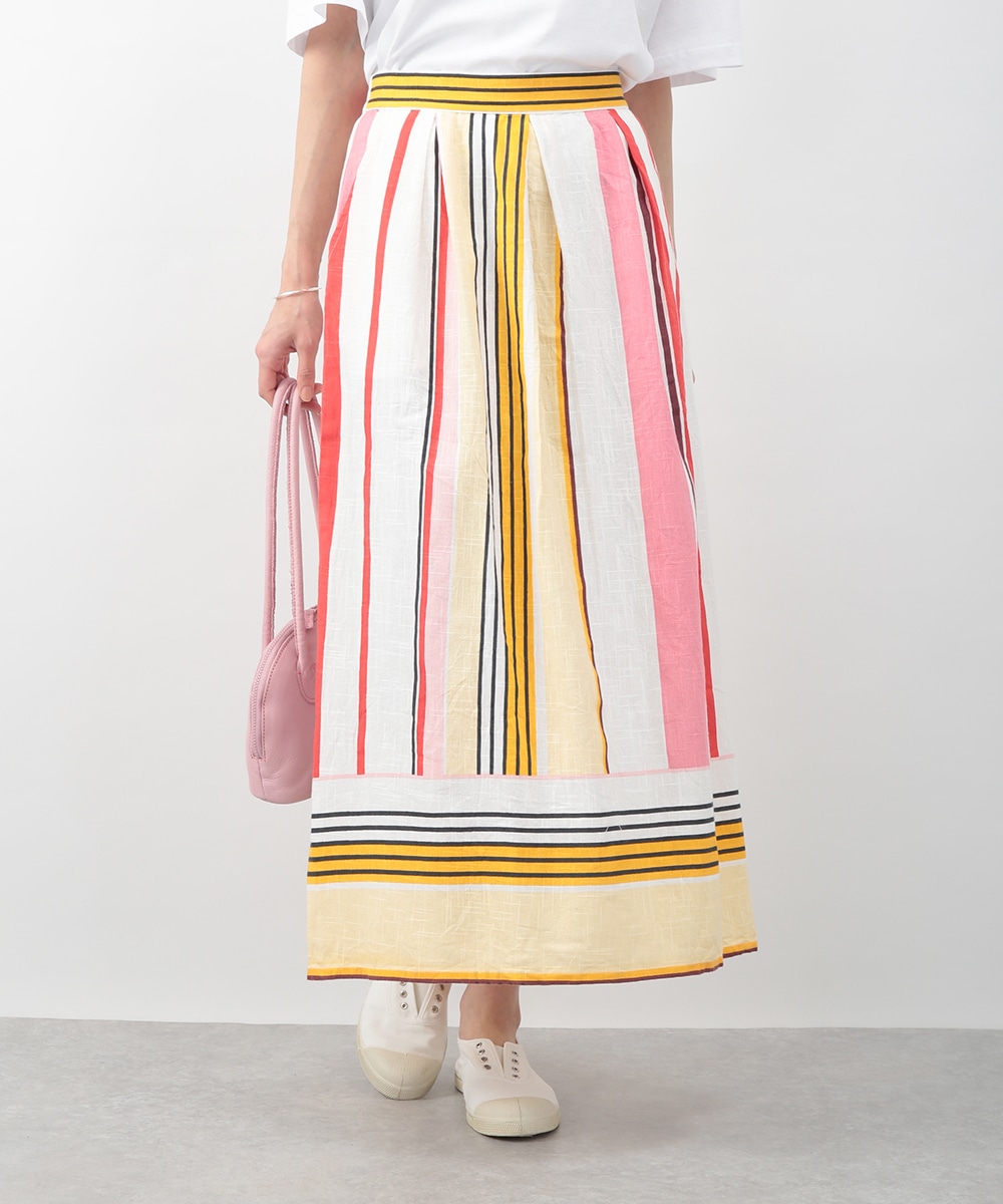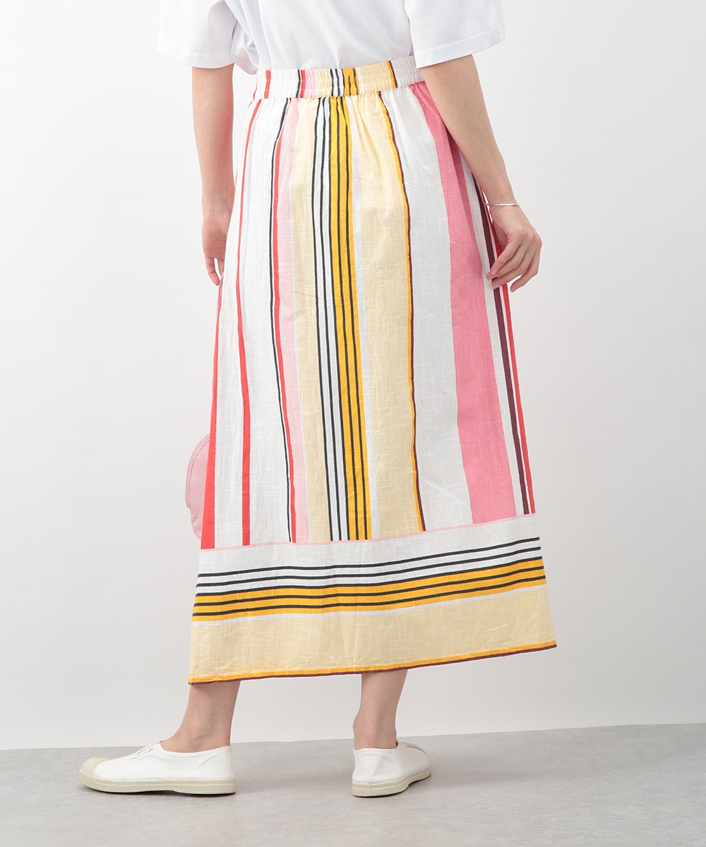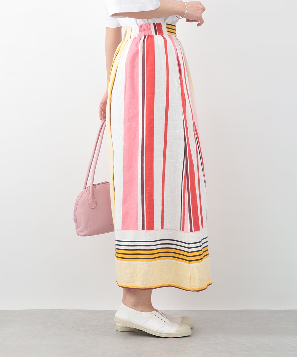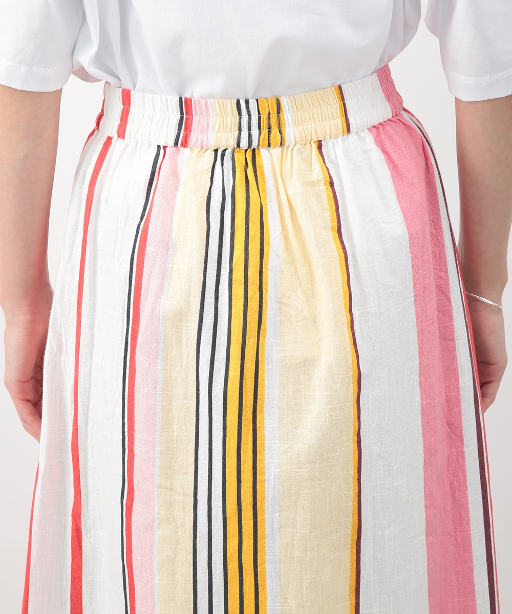 カラフルなマルチストライプが目を引くロングスカート。華やかな配色ながら、しっかりとしたコットンリネン素材が甘さを抑え、着こなしにほどよい抜け感を添えてくれます。ウエストはゴム仕様で穿き心地も快適。シンプルなトップスと合わせるだけでもバランスが取りやすく、季節感のあるスタイルを楽しめる一枚です。