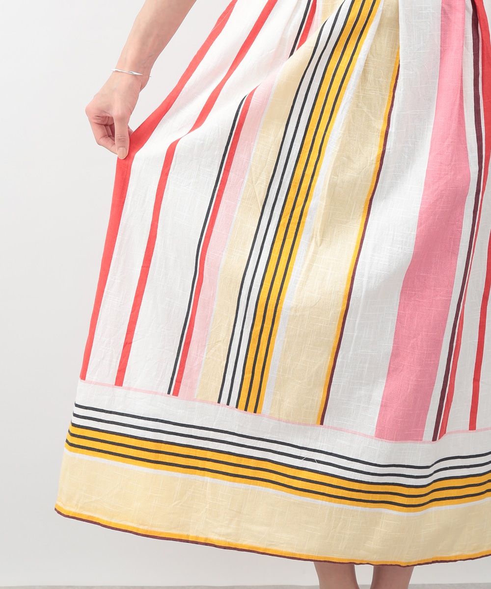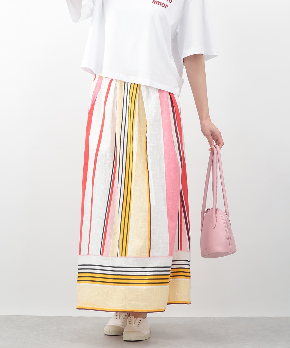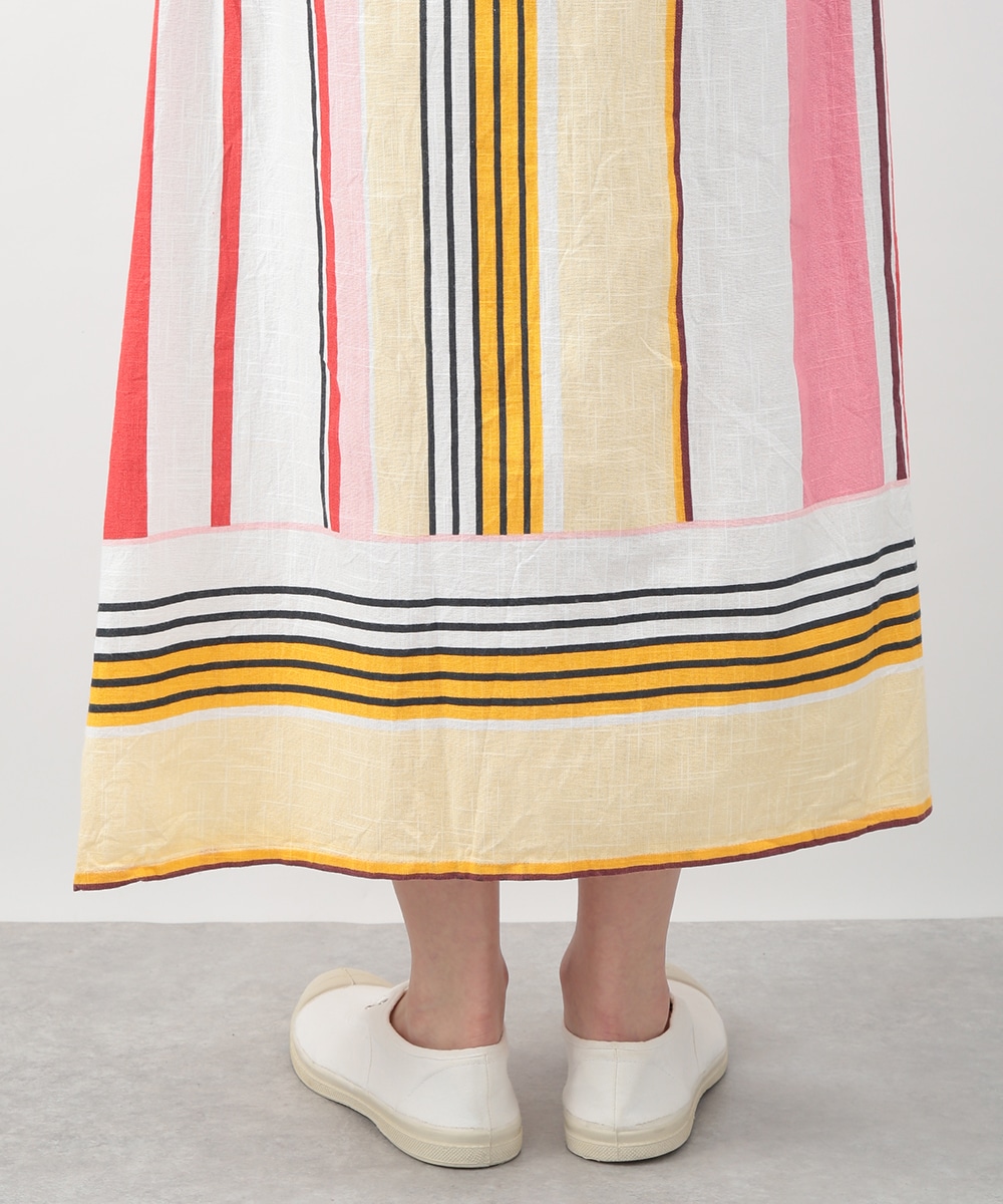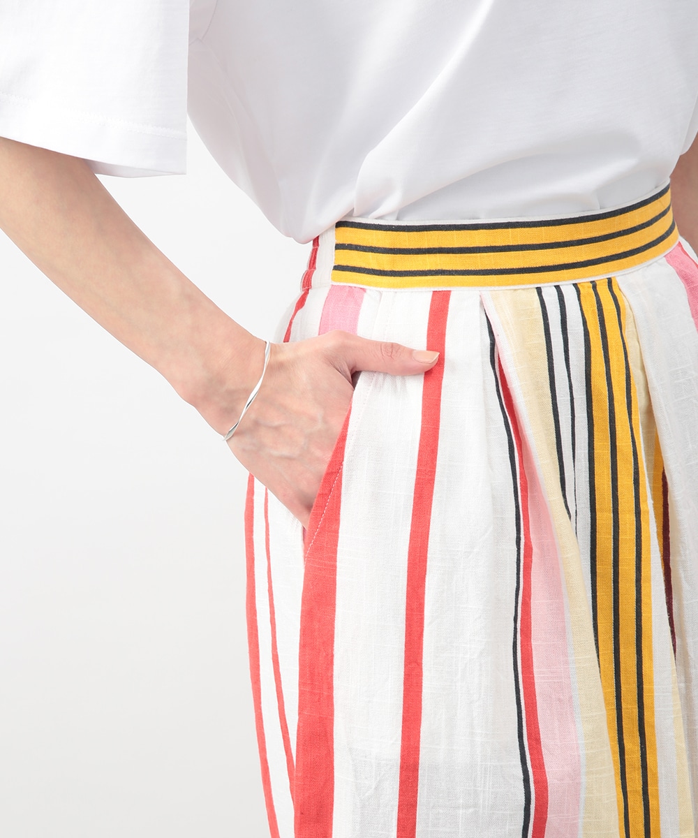 カラフルなマルチストライプが目を引くロングスカート。華やかな配色ながら、しっかりとしたコットンリネン素材が甘さを抑え、着こなしにほどよい抜け感を添えてくれます。ウエストはゴム仕様で穿き心地も快適。シンプルなトップスと合わせるだけでもバランスが取りやすく、季節感のあるスタイルを楽しめる一枚です。