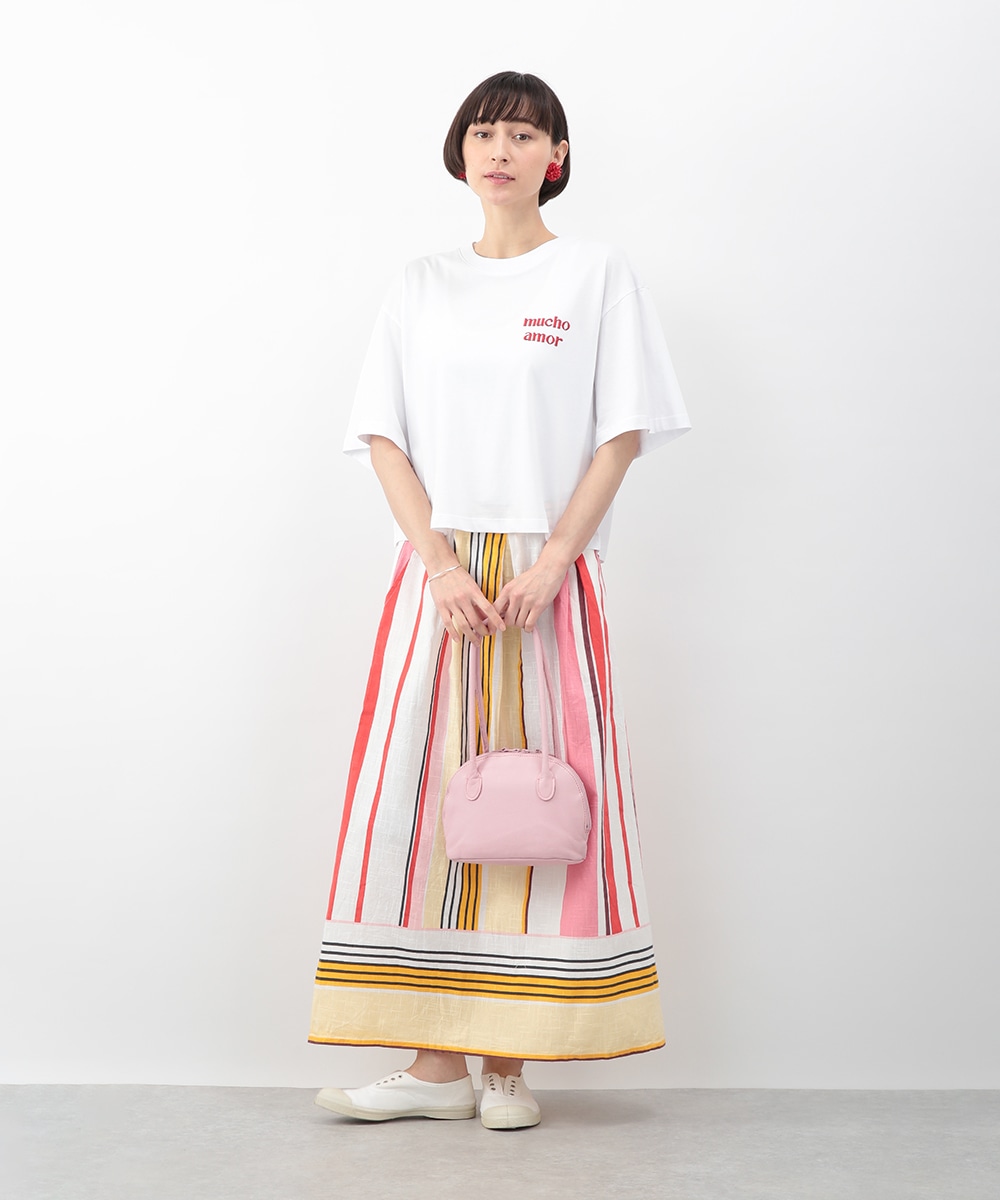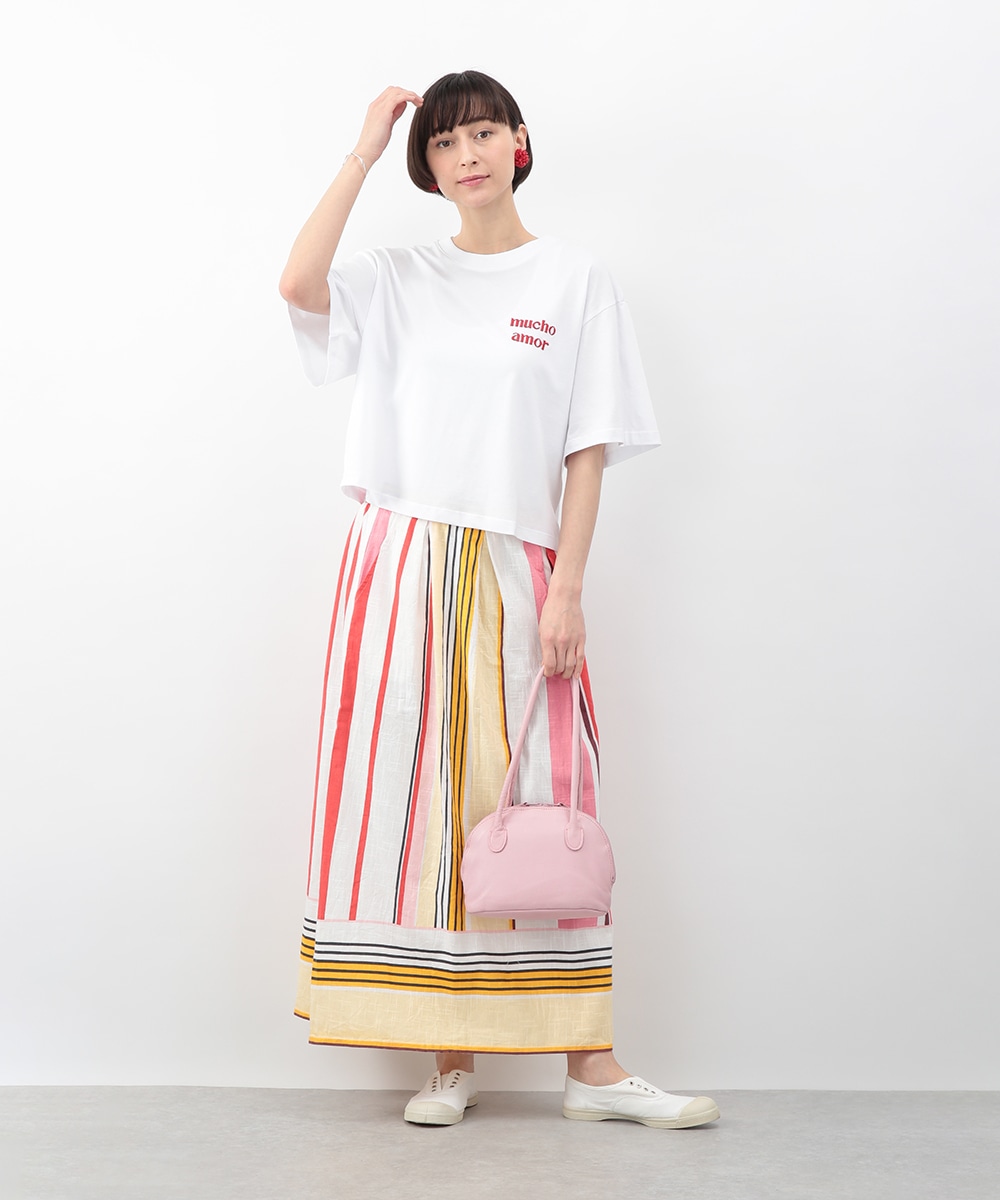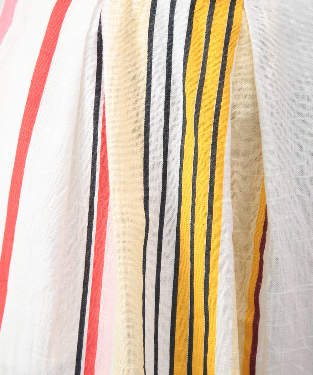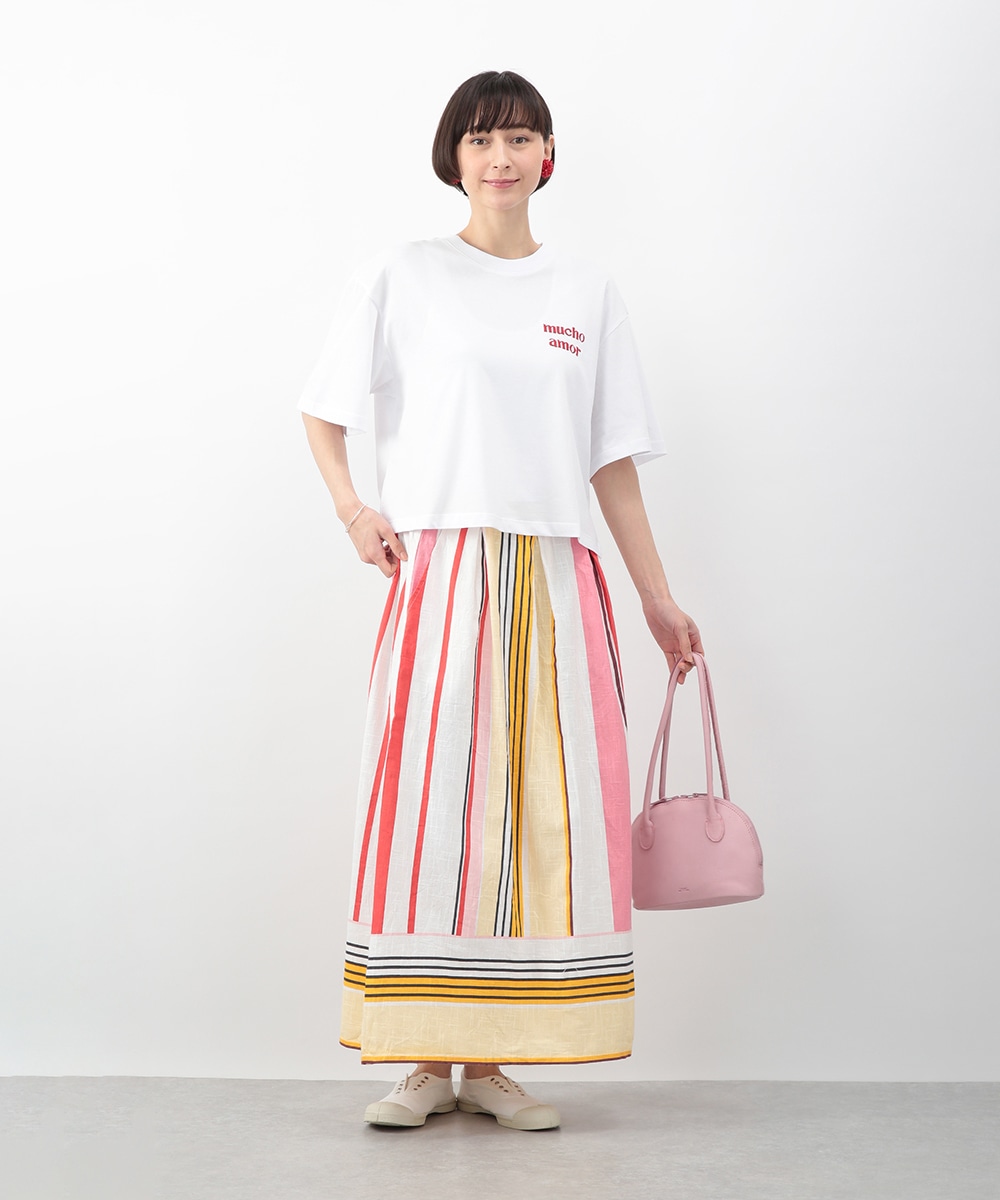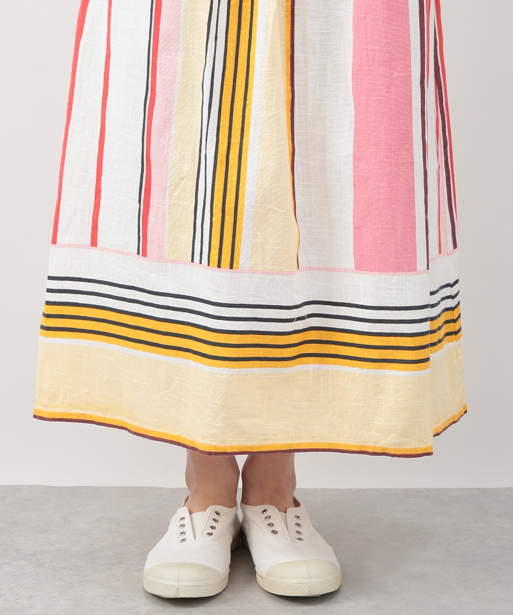 カラフルなマルチストライプが目を引くロングスカート。華やかな配色ながら、しっかりとしたコットンリネン素材が甘さを抑え、着こなしにほどよい抜け感を添えてくれます。ウエストはゴム仕様で穿き心地も快適。シンプルなトップスと合わせるだけでもバランスが取りやすく、季節感のあるスタイルを楽しめる一枚です。