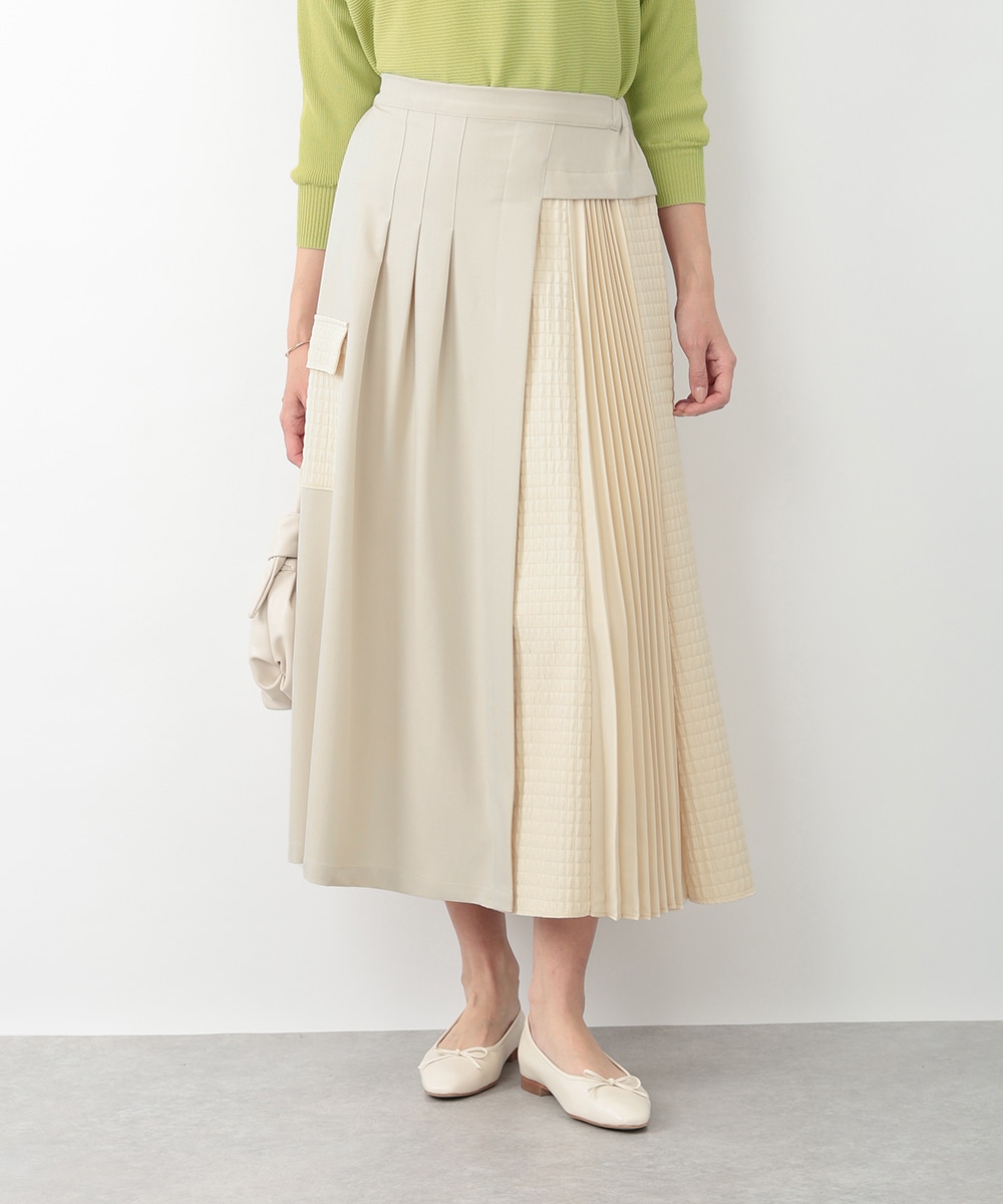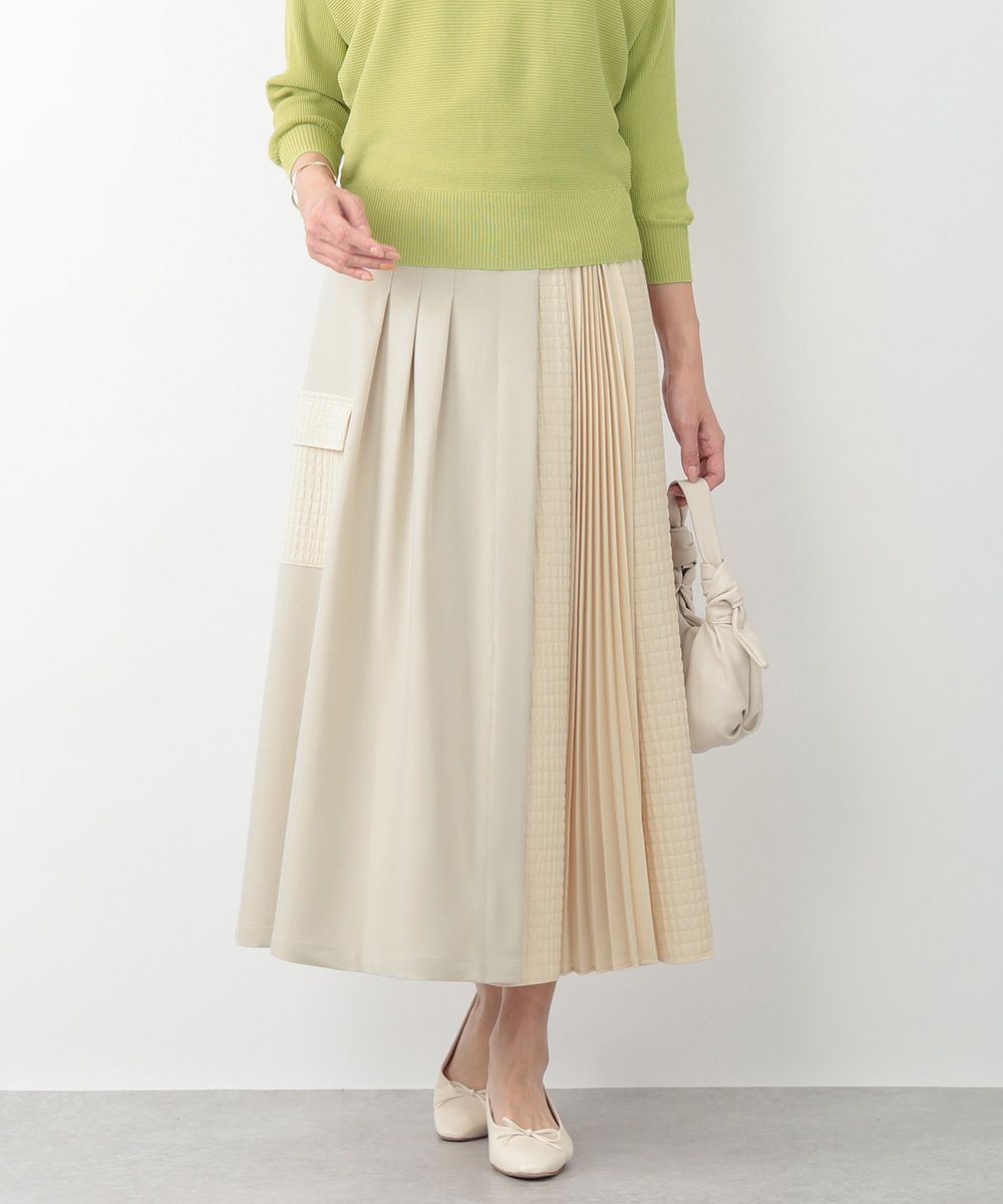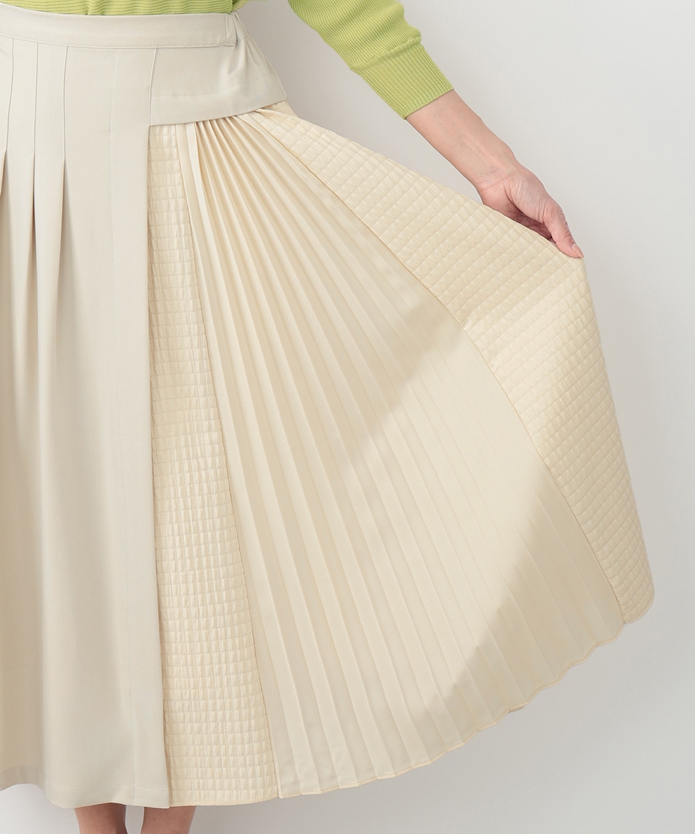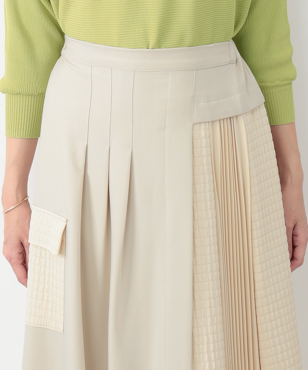 表面感のあるキルト調の異素材切り替えで、表情豊かに仕上げたプリーツスカート。裾に向かってなだらかに広がるシルエットが、スタイリングに立体感をプラスします。サイドに施されたフラップポケットのディテールがポイント。シンプルなトップスと合わせたバランスの良い着こなしがおすすめです。