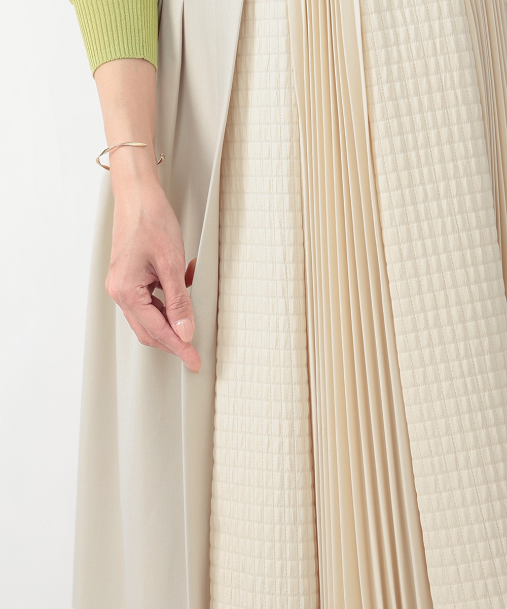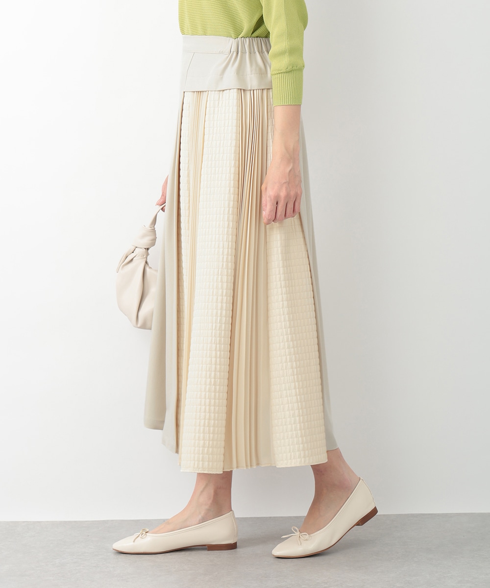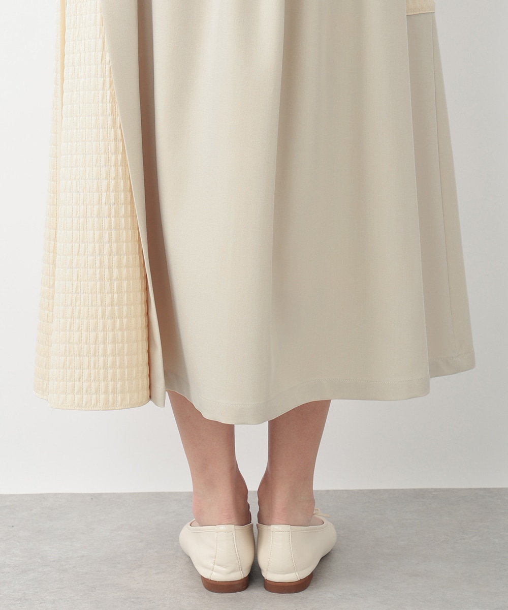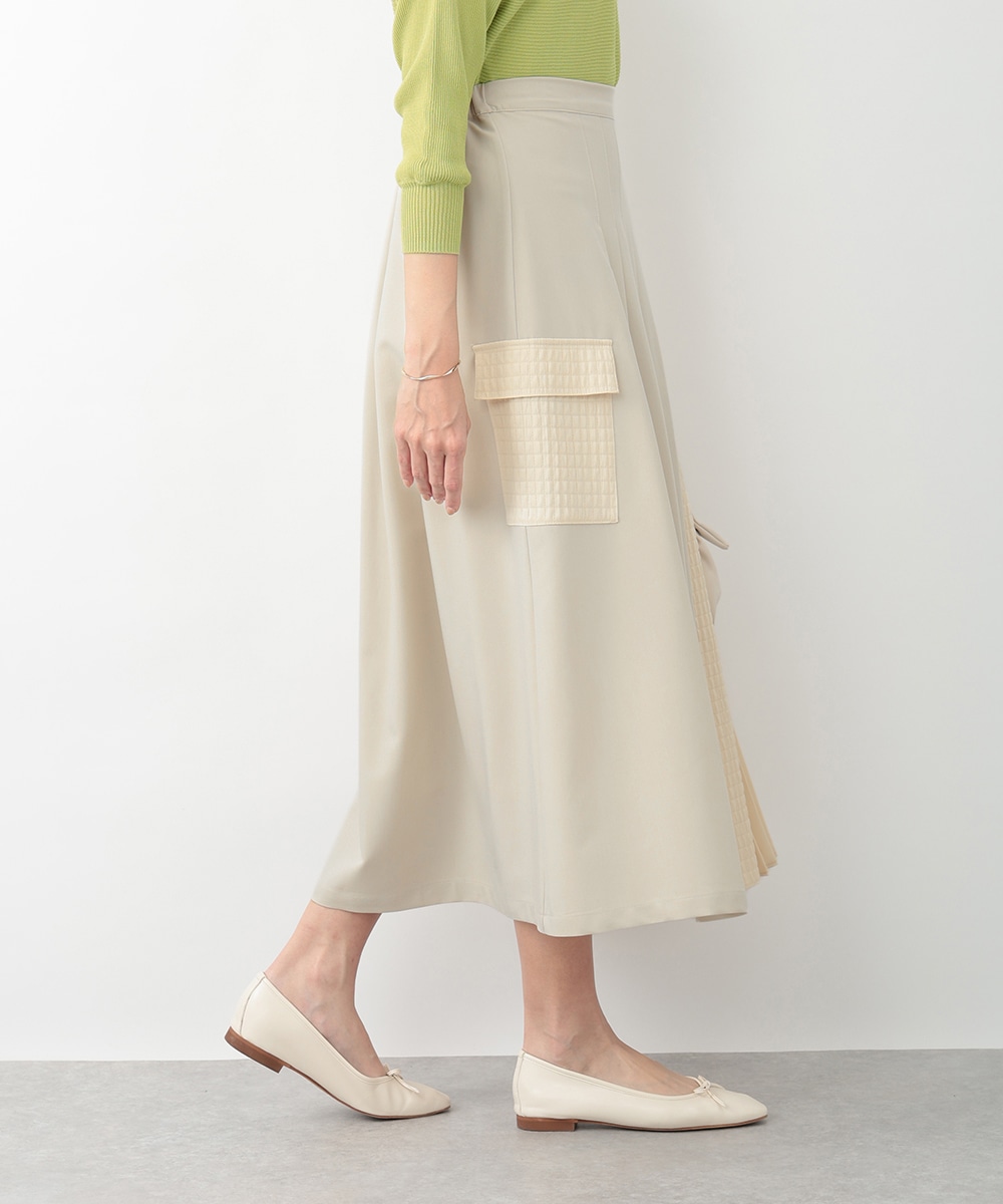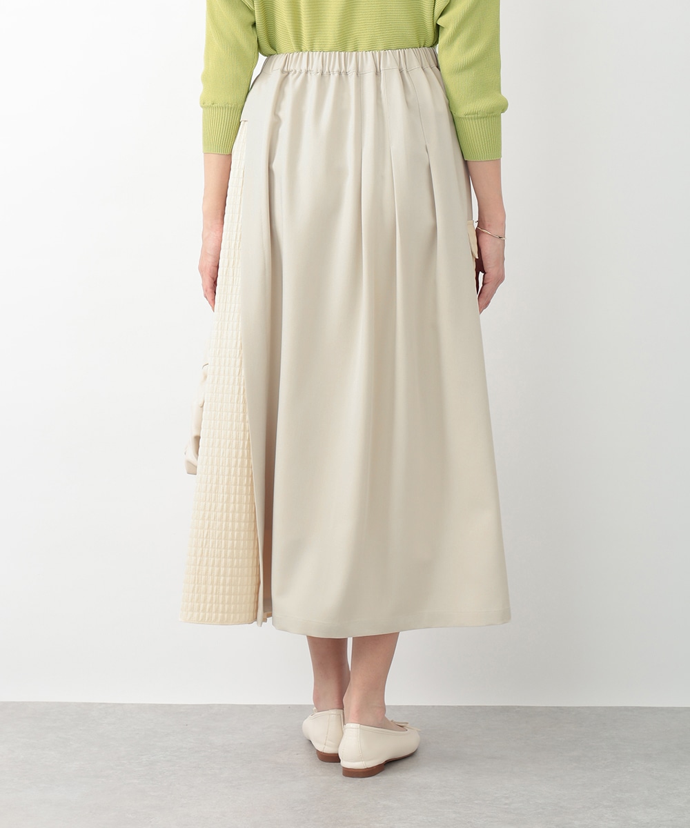 表面感のあるキルト調の異素材切り替えで、表情豊かに仕上げたプリーツスカート。裾に向かってなだらかに広がるシルエットが、スタイリングに立体感をプラスします。サイドに施されたフラップポケットのディテールがポイント。シンプルなトップスと合わせたバランスの良い着こなしがおすすめです。