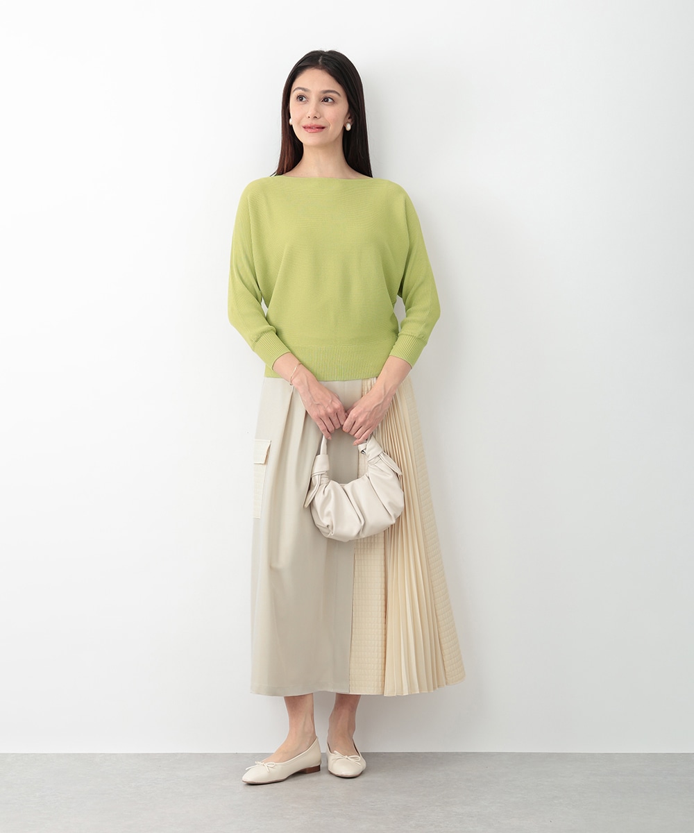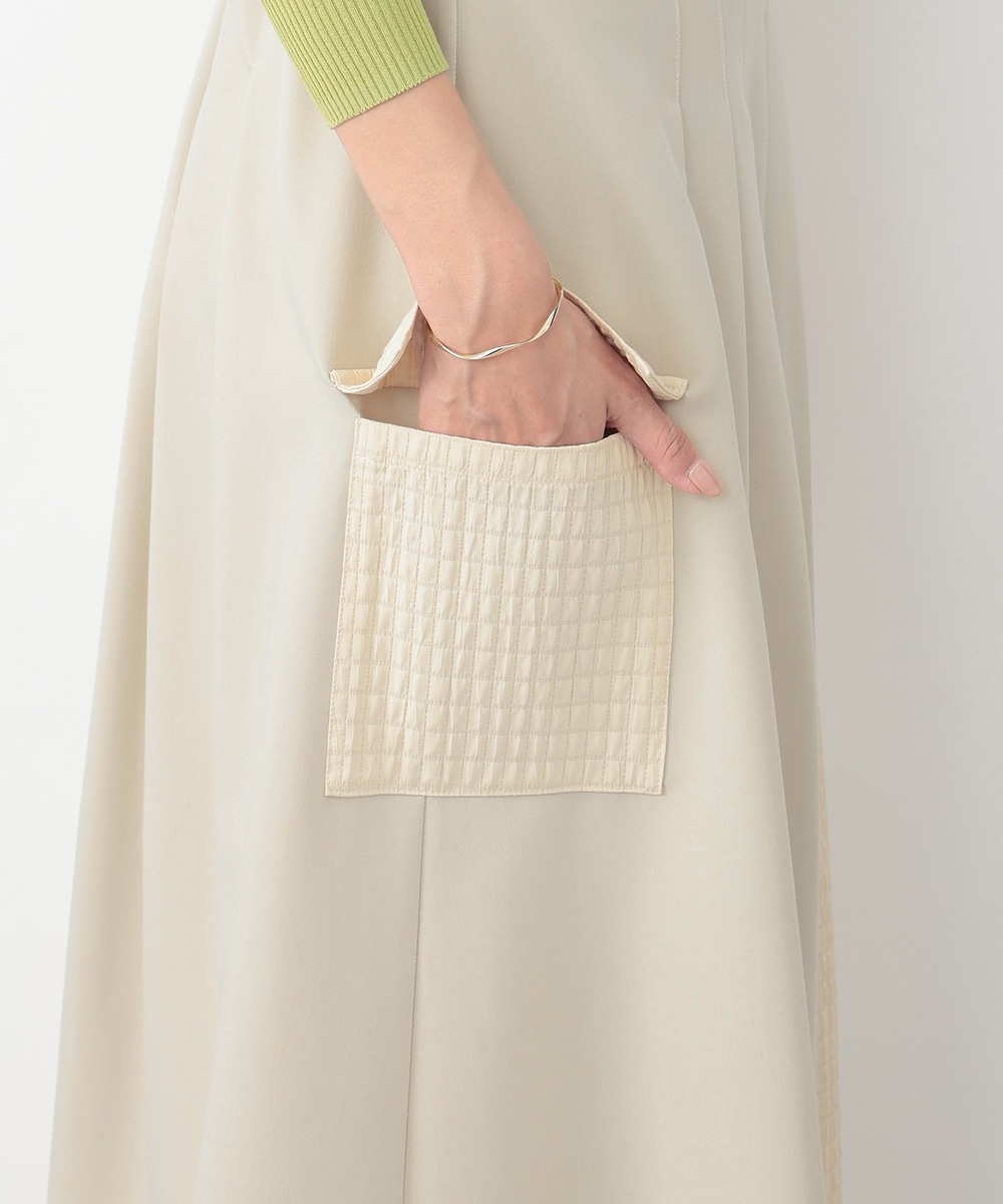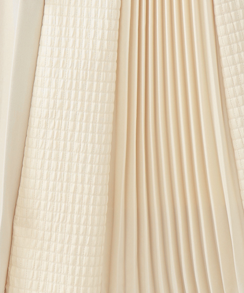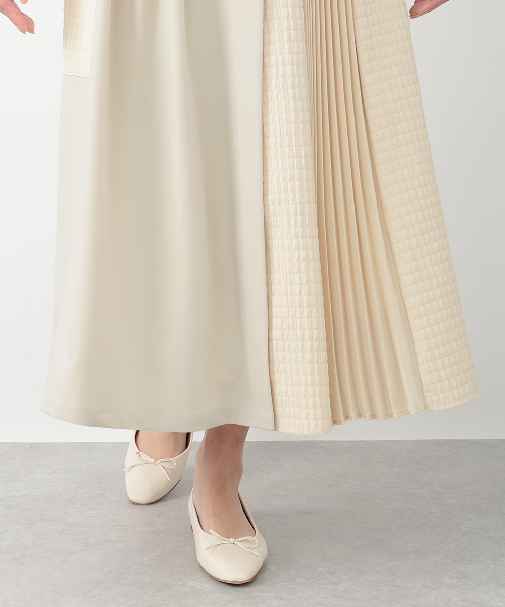 表面感のあるキルト調の異素材切り替えで、表情豊かに仕上げたプリーツスカート。裾に向かってなだらかに広がるシルエットが、スタイリングに立体感をプラスします。サイドに施されたフラップポケットのディテールがポイント。シンプルなトップスと合わせたバランスの良い着こなしがおすすめです。