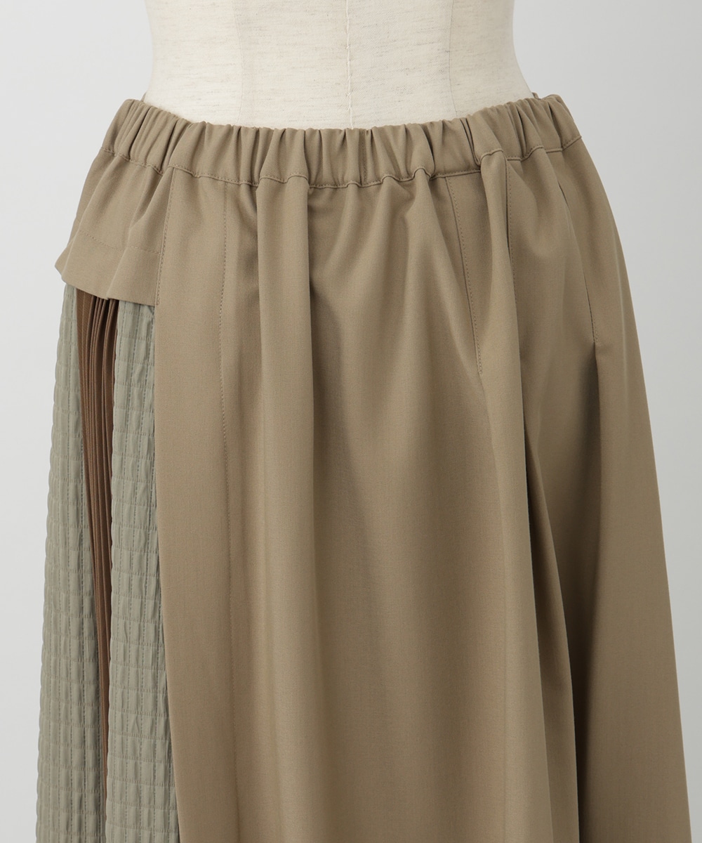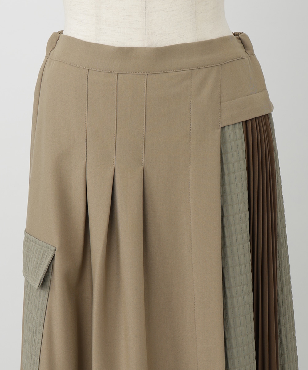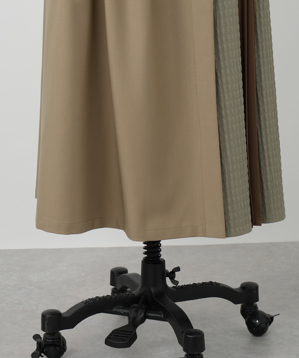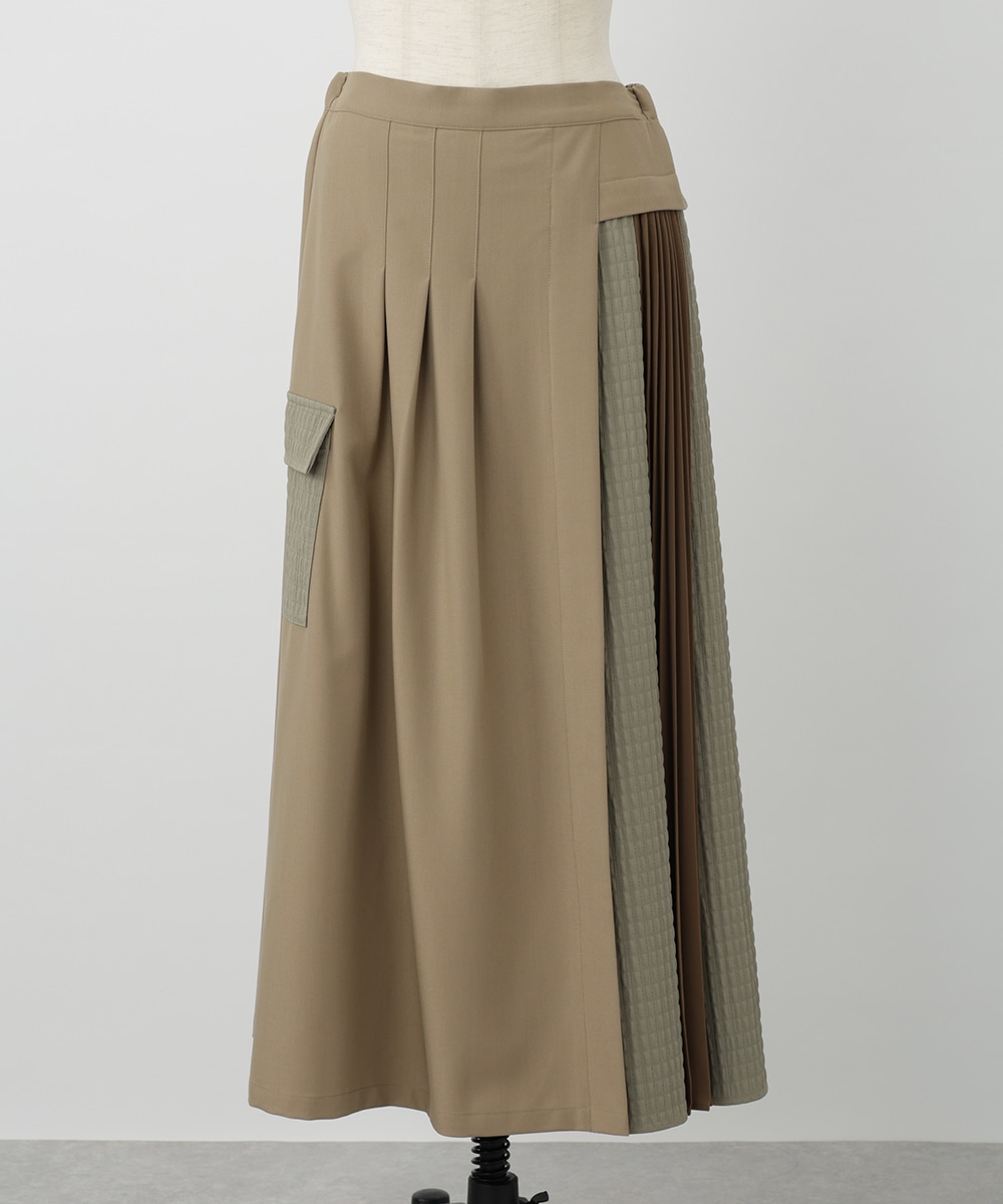 表面感のあるキルト調の異素材切り替えで、表情豊かに仕上げたプリーツスカート。裾に向かってなだらかに広がるシルエットが、スタイリングに立体感をプラスします。サイドに施されたフラップポケットのディテールがポイント。シンプルなトップスと合わせたバランスの良い着こなしがおすすめです。