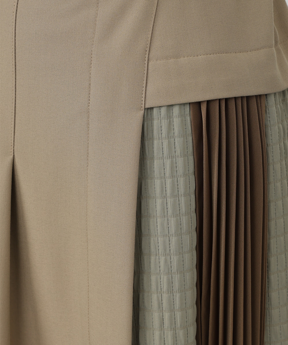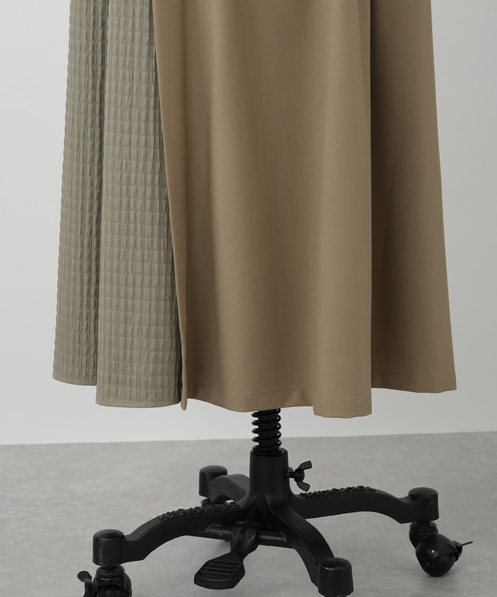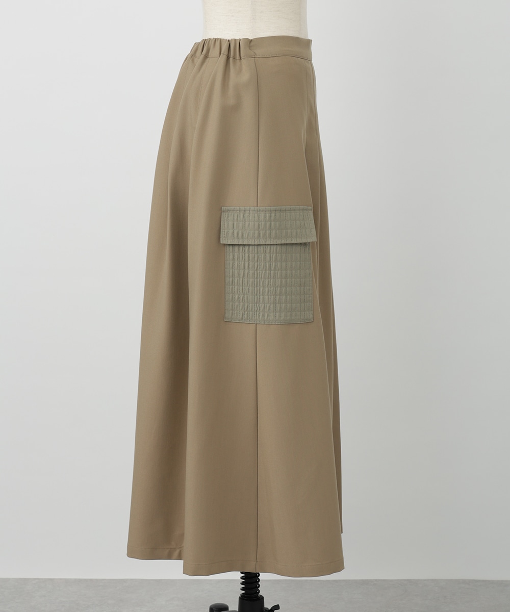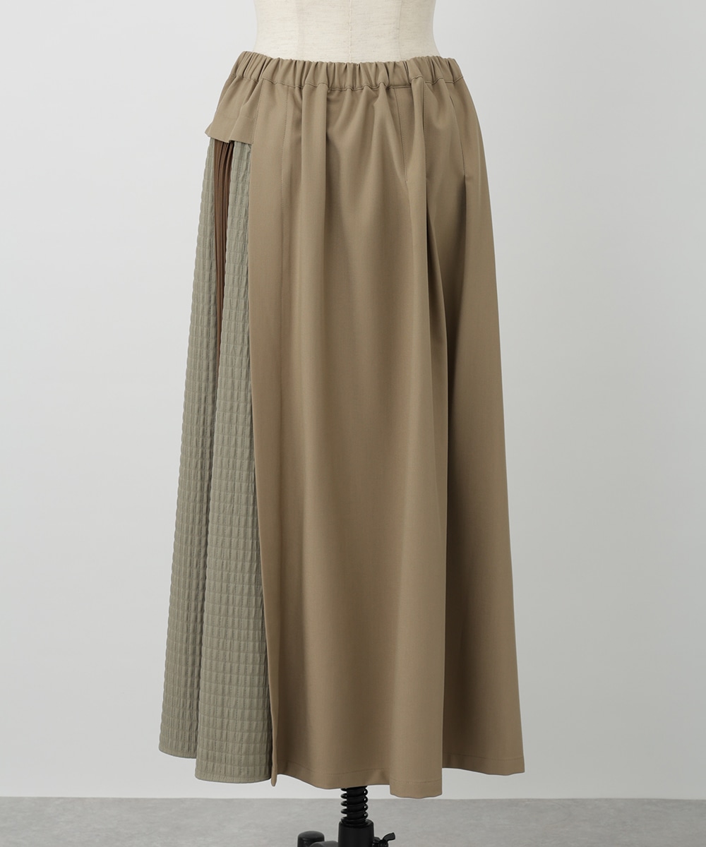 表面感のあるキルト調の異素材切り替えで、表情豊かに仕上げたプリーツスカート。裾に向かってなだらかに広がるシルエットが、スタイリングに立体感をプラスします。サイドに施されたフラップポケットのディテールがポイント。シンプルなトップスと合わせたバランスの良い着こなしがおすすめです。