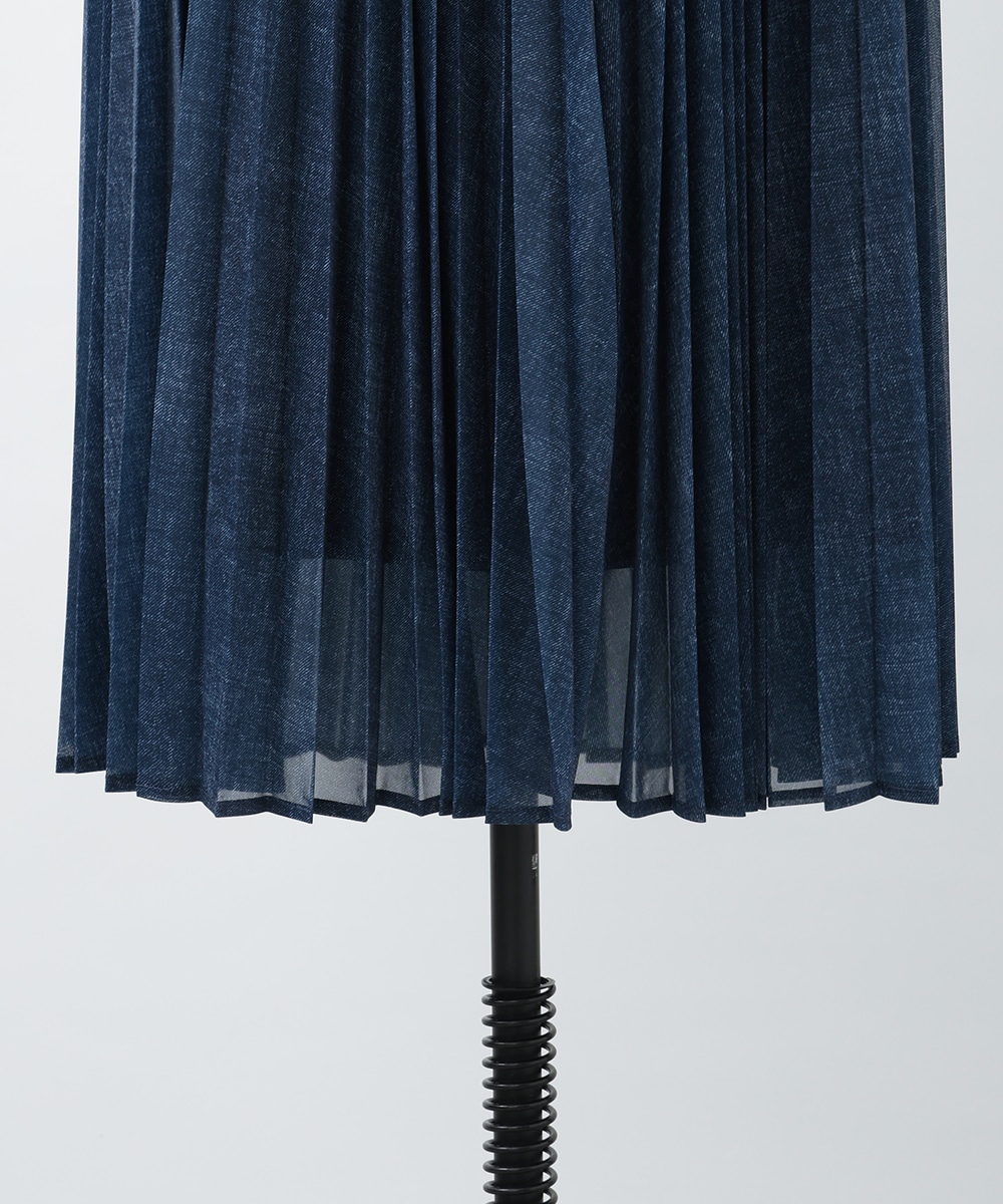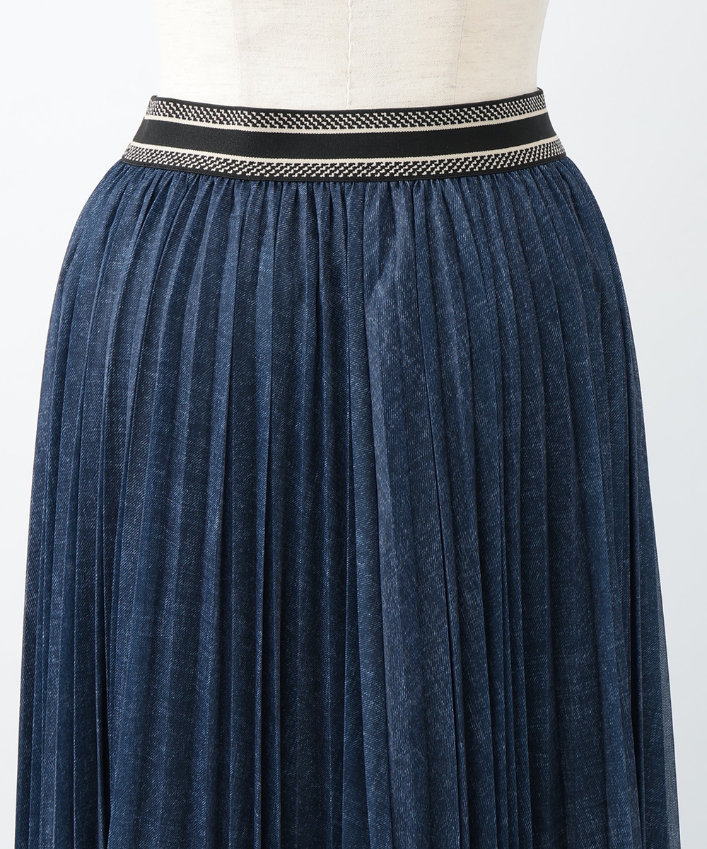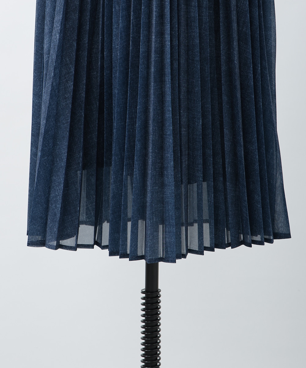 軽やかな透け感を楽しめるシアーデニム生地を使用したスカート。プリーツ加工を施して上品に仕上げたカジュアルになりすぎないデザイン。ウエストの配色ラインがアクセントになるため、トップスをタックインしたスタイリングもおすすめ。暖かい季節のお出かけスタイルに大活躍するアイテムです。