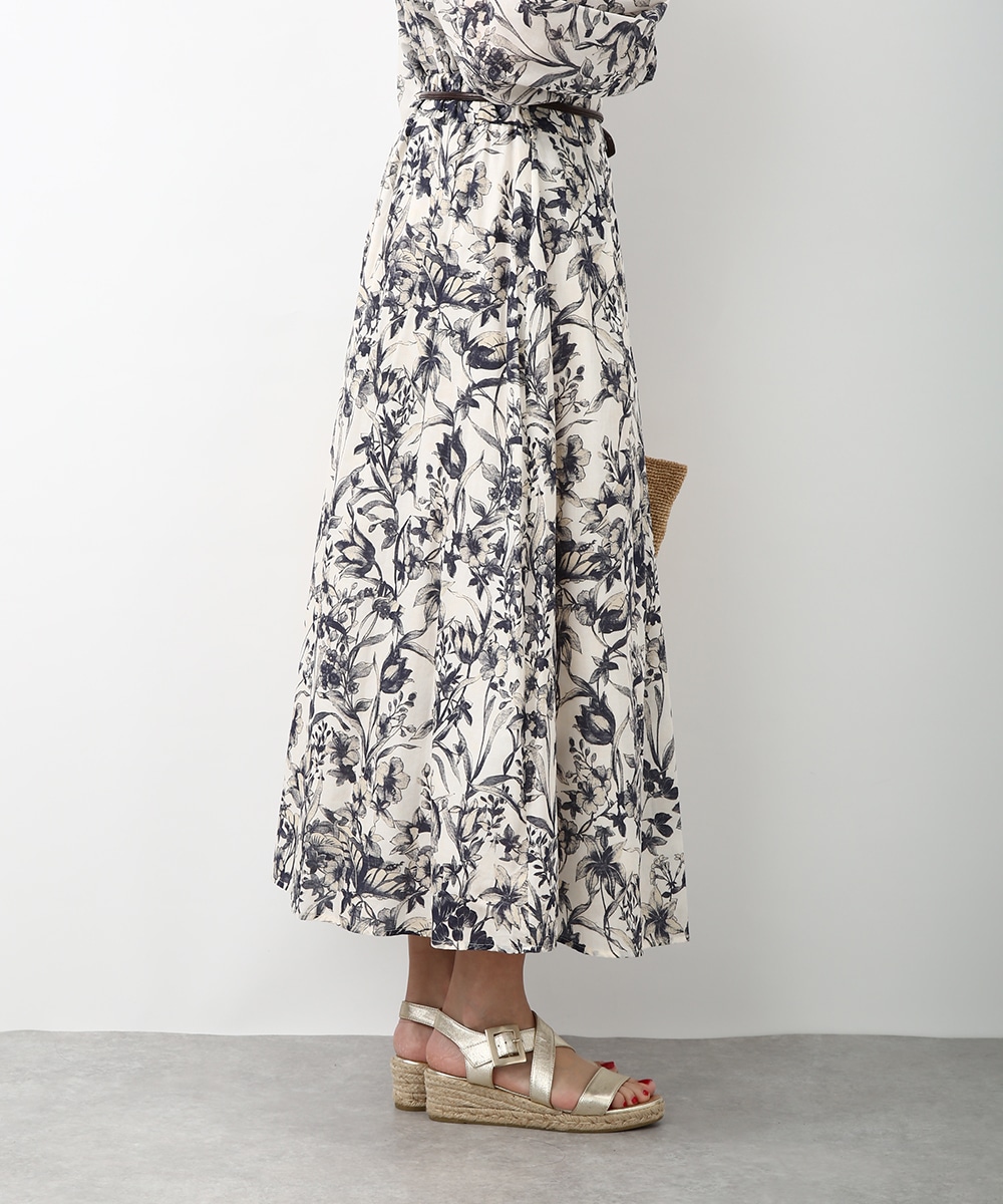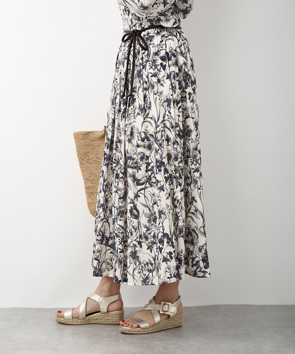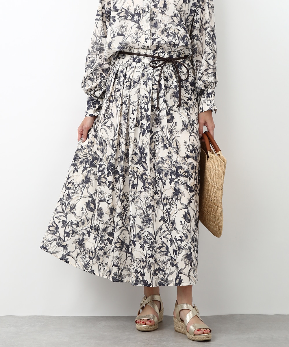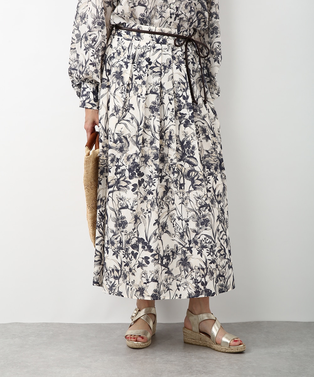 細やかなボタニカル柄が広がるスカート。揺れ感のあるラインで軽やかさがあり、スタイリングに奥行きをプラスしてくれる一枚です。同素材のブラウスと合わせて統一感のある着こなしにし、足元はストラップサンダルで抜けをつくるとバランスよくまとまります。かごバッグを合わせて季節感のあるスタイルに仕上げるのもおすすめです。