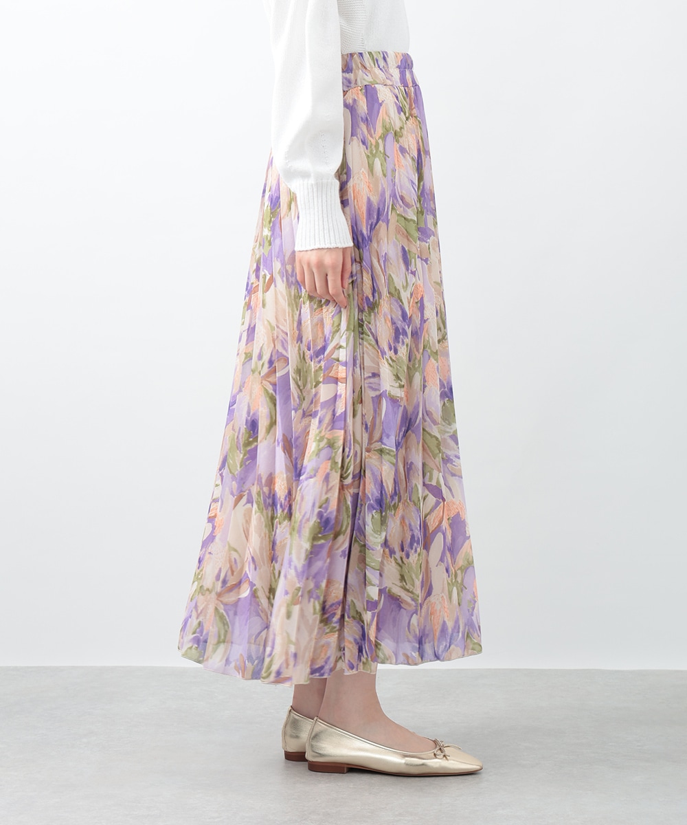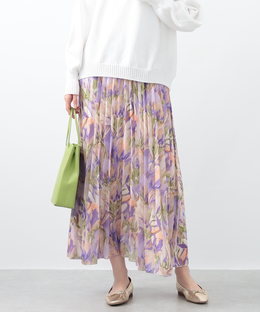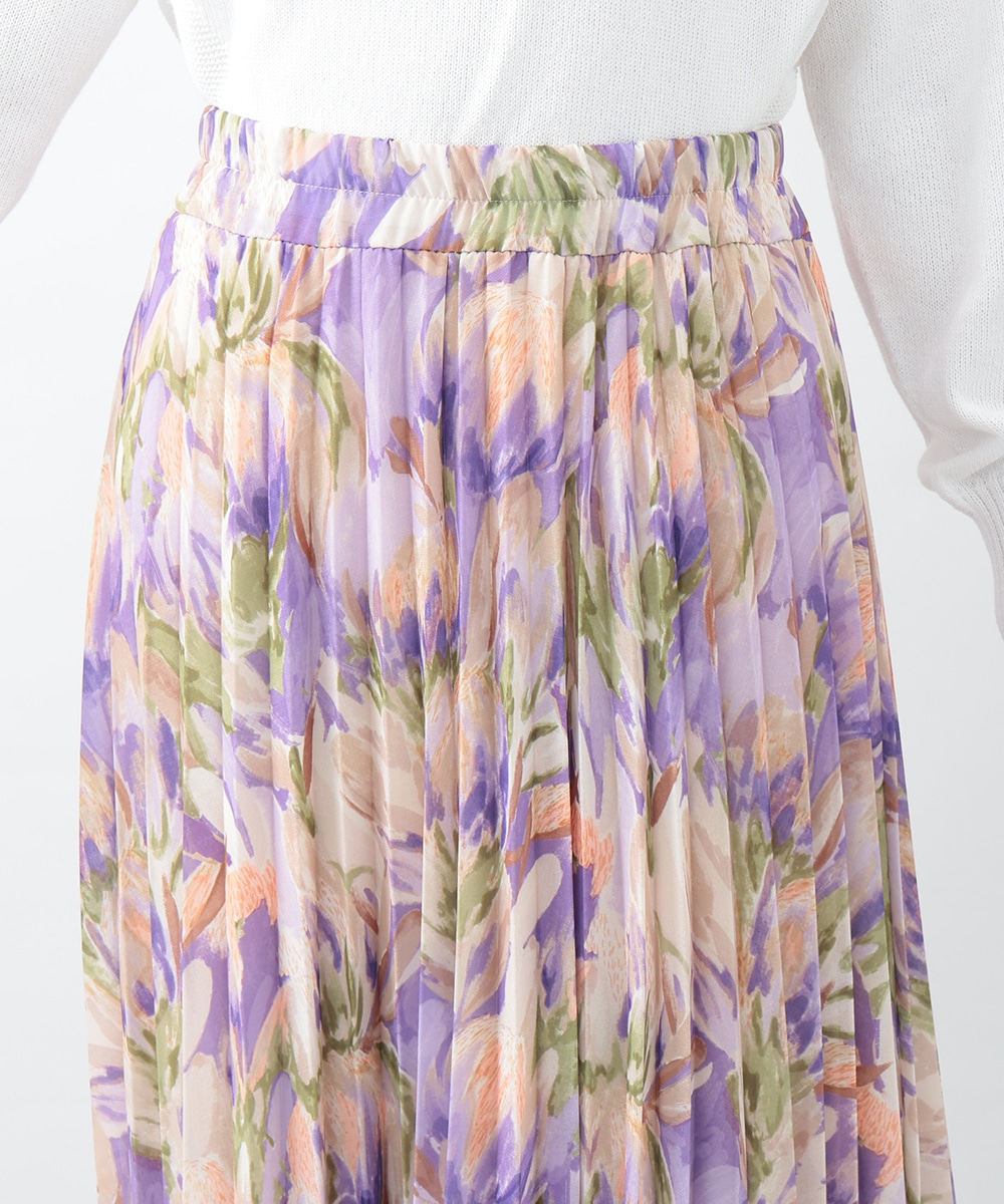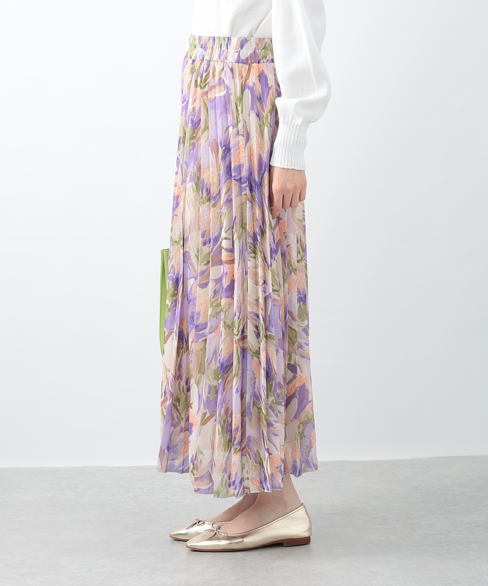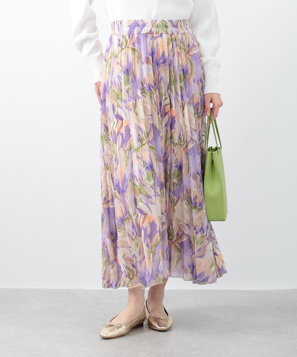 アコーディオンプリーツが華やかな雰囲気を放つスカート。ぼかしフラワープリントでやさしい印象を与え、気品のあるスタイリングを楽しめます。タックインスタイルも楽しめるウエストゴム仕様がポイント。フラットシューズやパンプスと合わせた女性らしいコーディネートがおすすめです。