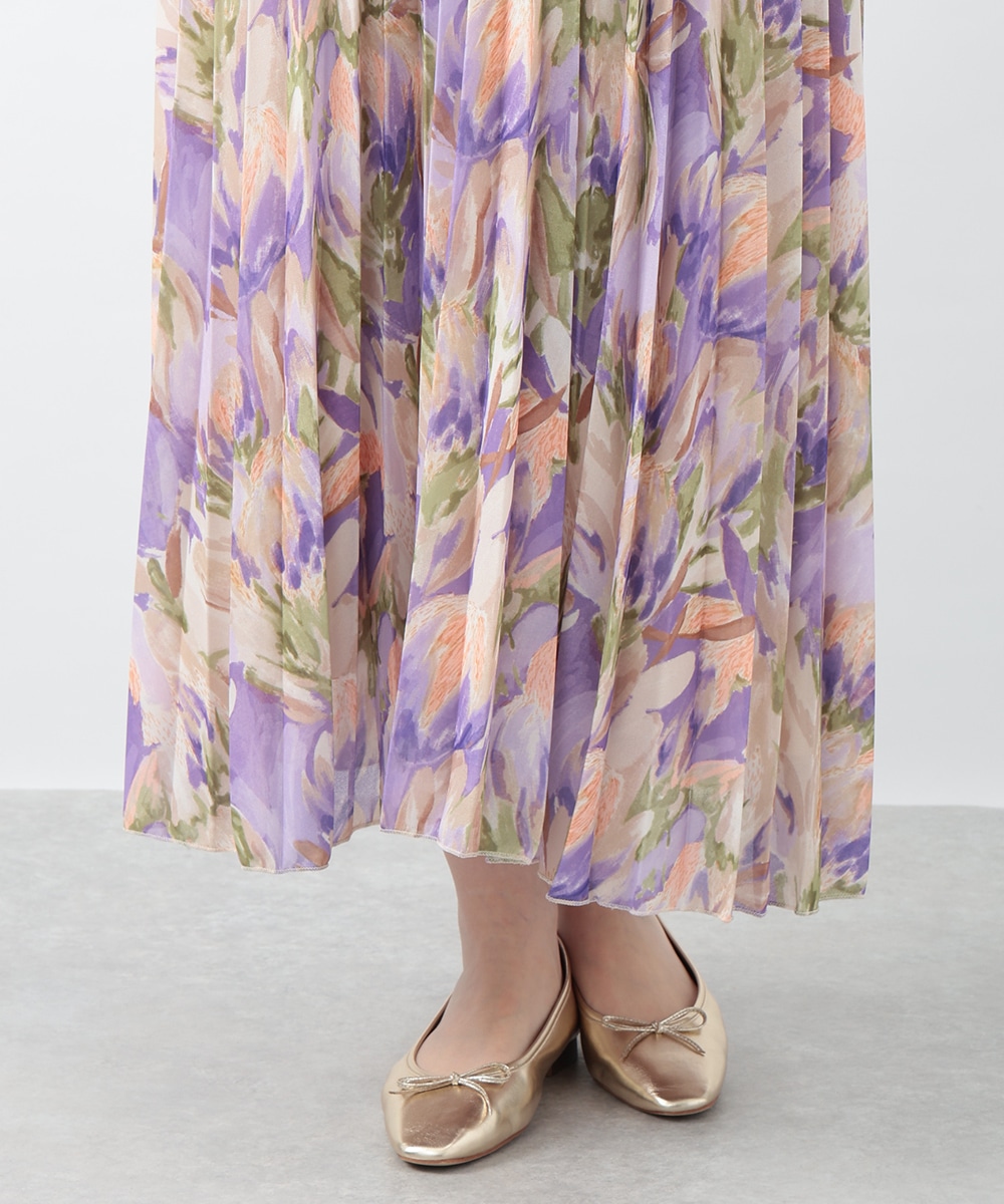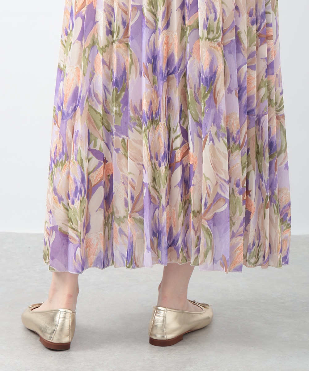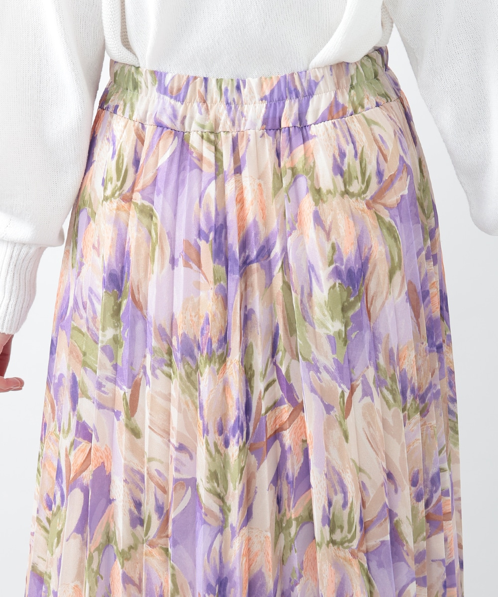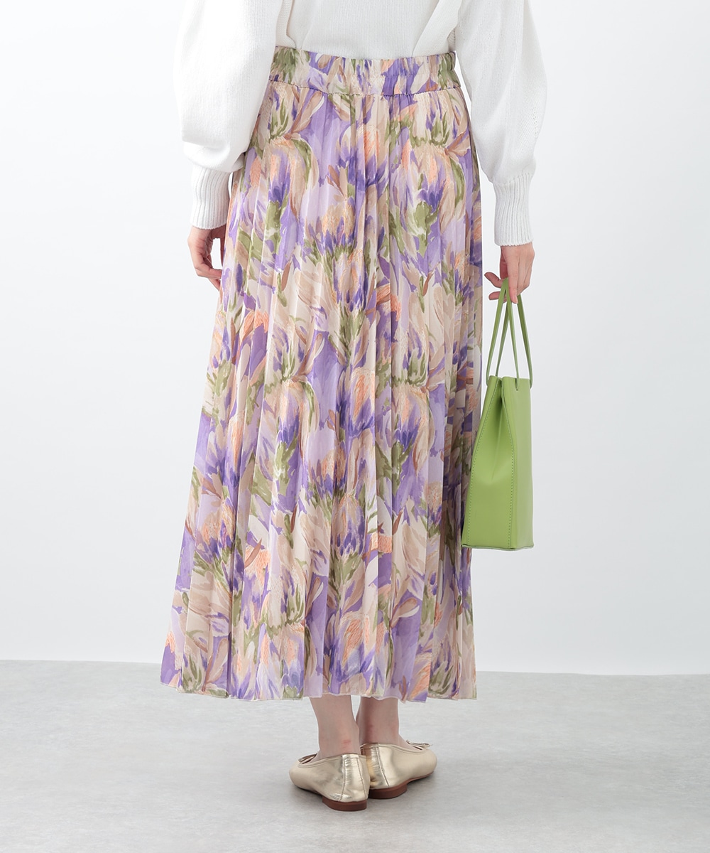 アコーディオンプリーツが華やかな雰囲気を放つスカート。ぼかしフラワープリントでやさしい印象を与え、気品のあるスタイリングを楽しめます。タックインスタイルも楽しめるウエストゴム仕様がポイント。フラットシューズやパンプスと合わせた女性らしいコーディネートがおすすめです。