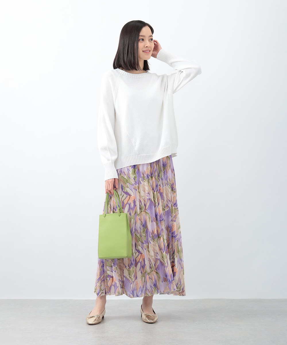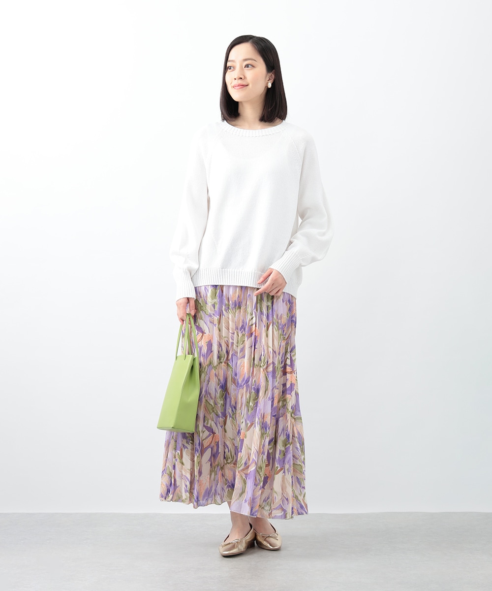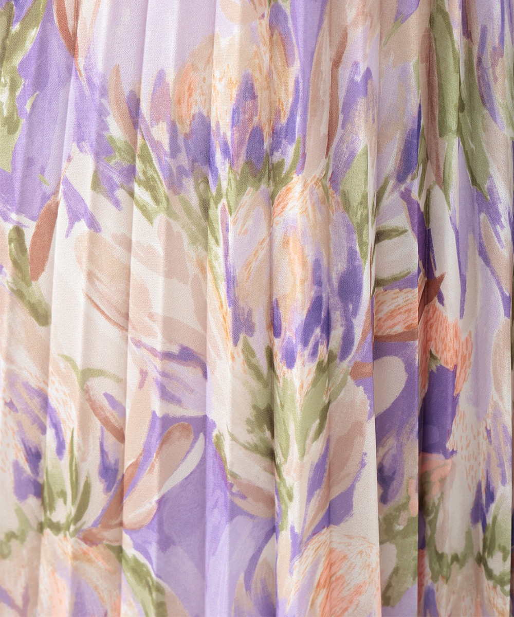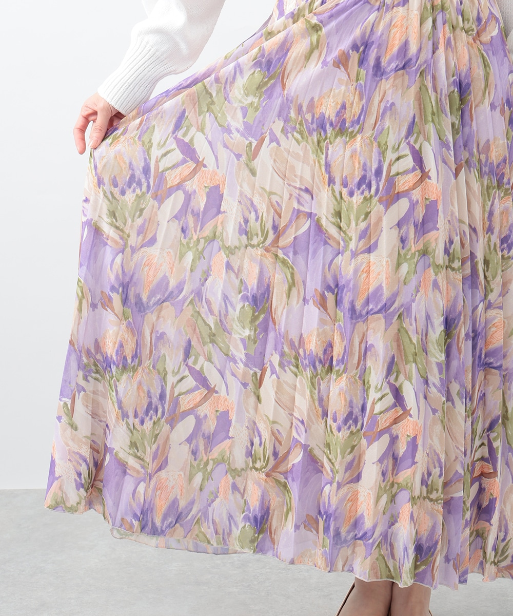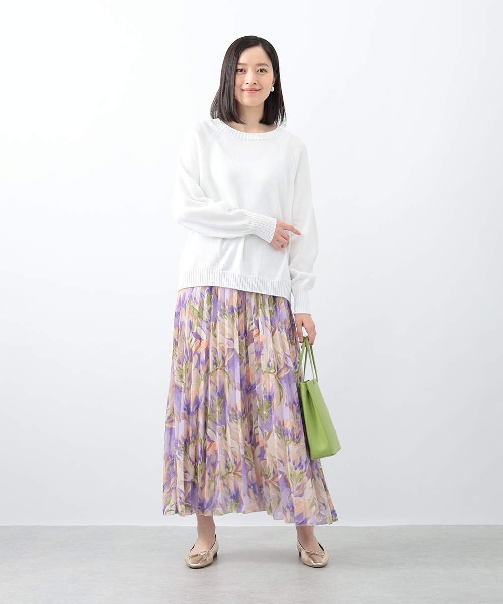 アコーディオンプリーツが華やかな雰囲気を放つスカート。ぼかしフラワープリントでやさしい印象を与え、気品のあるスタイリングを楽しめます。タックインスタイルも楽しめるウエストゴム仕様がポイント。フラットシューズやパンプスと合わせた女性らしいコーディネートがおすすめです。