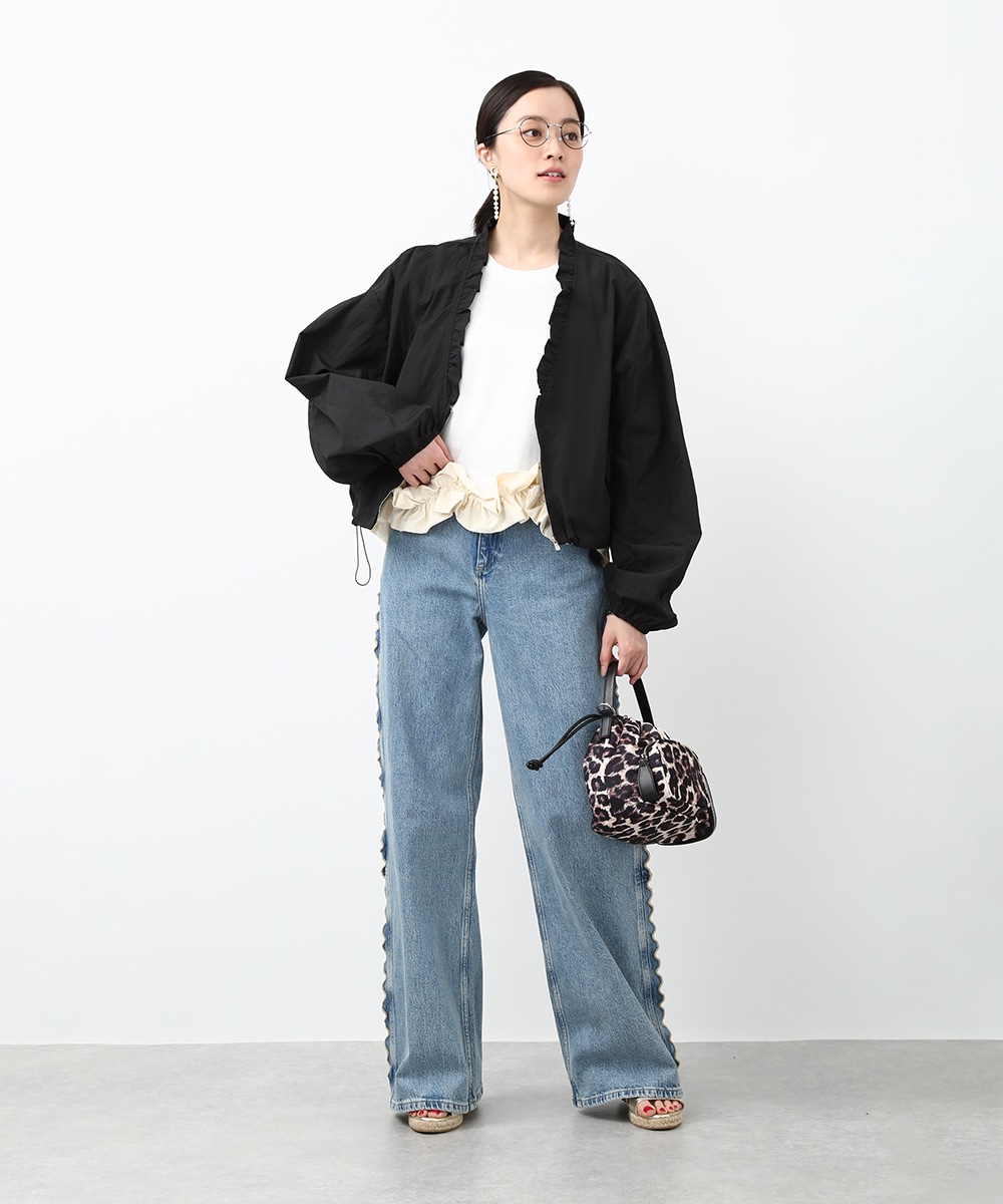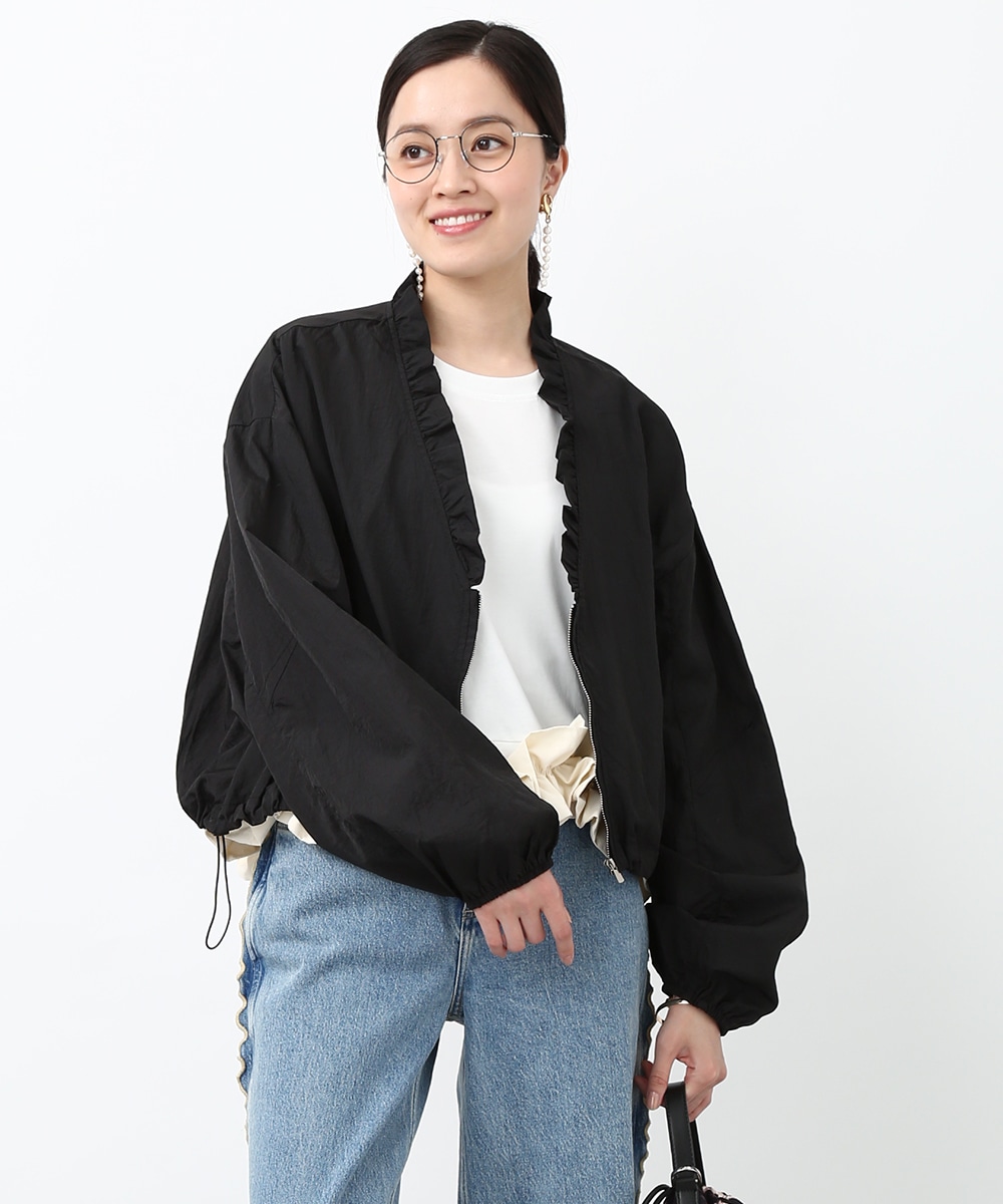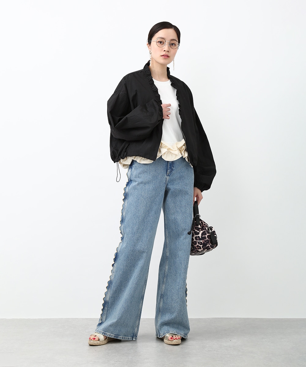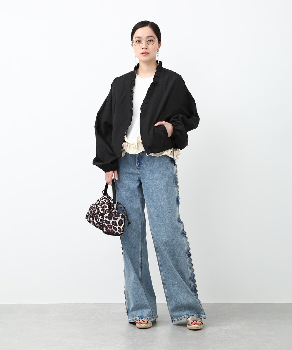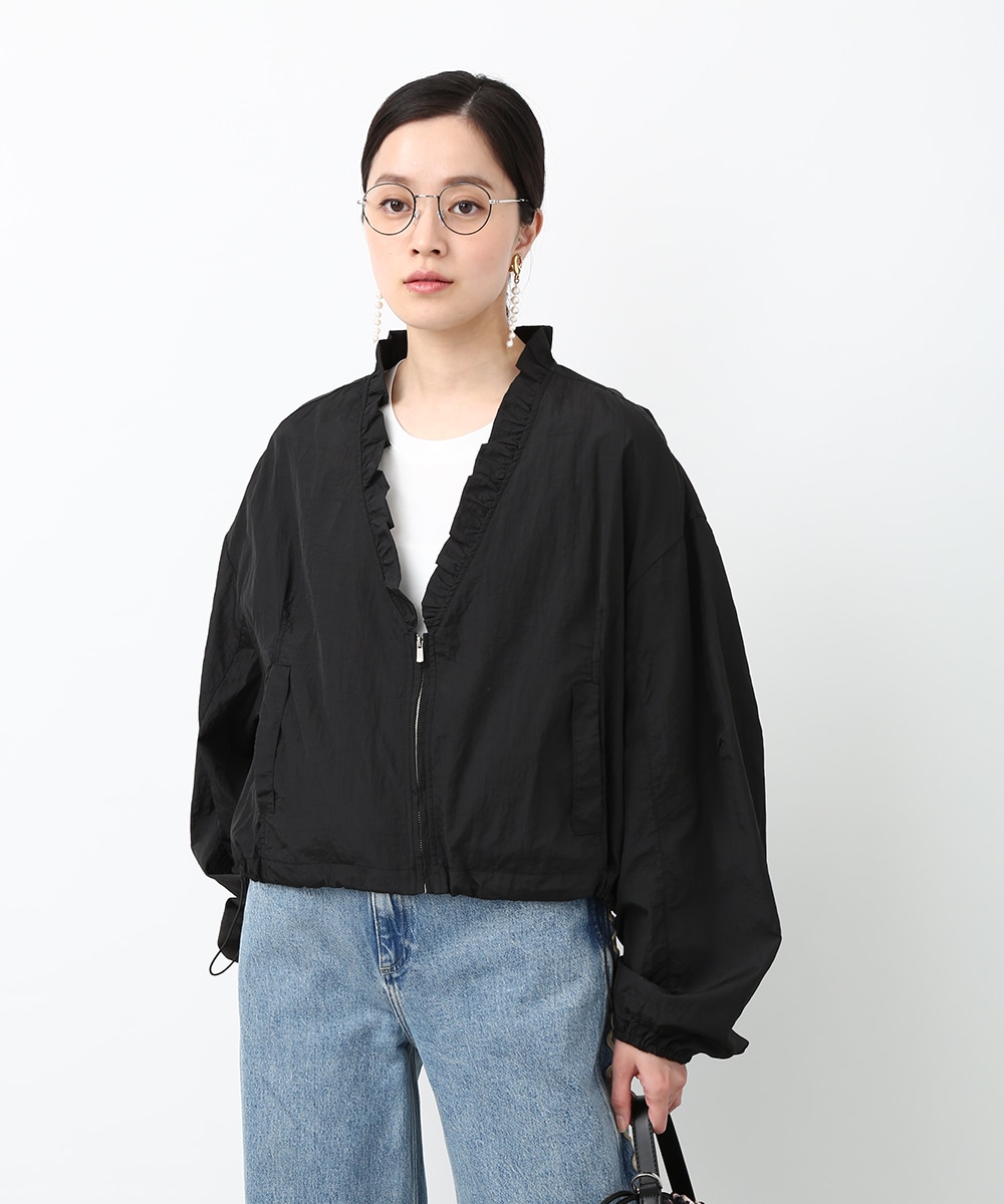 Vネックにあしらったプチフリルがアクセントになるコンパクトブルゾン。軽やかな素材感で、カーディガンのように気軽に羽織れる1着です。デザインカットソーを合わせてラフにまとめつつ、華奢なネックレスや小ぶりのピアスを添えることで、顔まわりに抜け感を出したスタイリングもおすすめです。