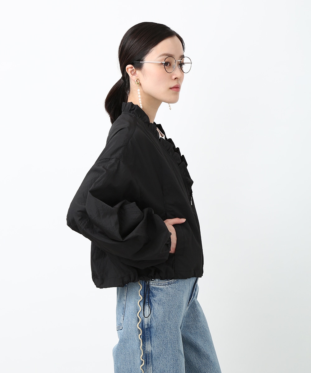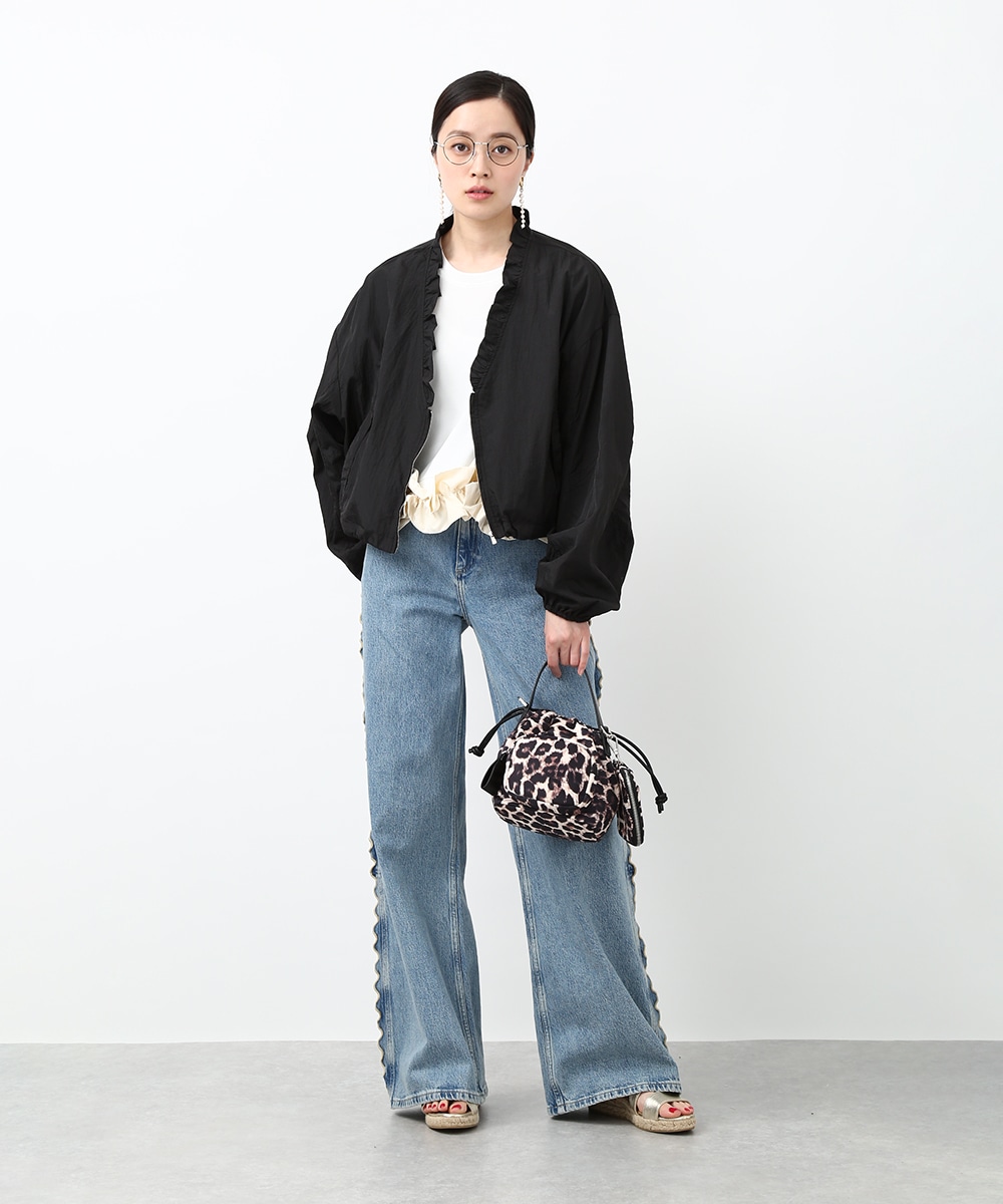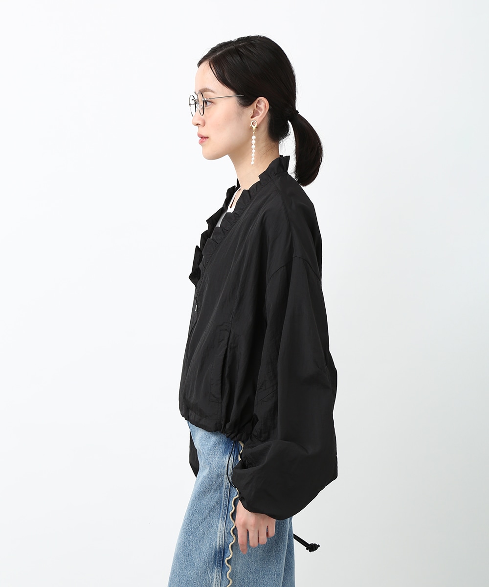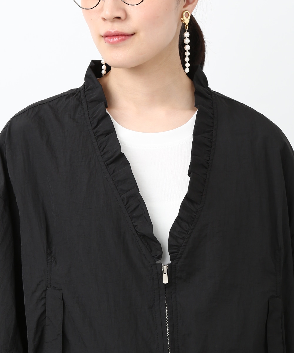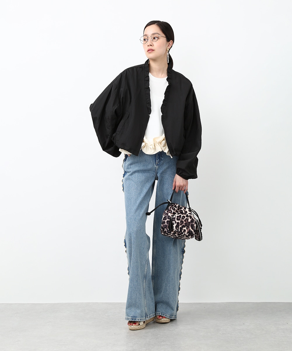 Vネックにあしらったプチフリルがアクセントになるコンパクトブルゾン。軽やかな素材感で、カーディガンのように気軽に羽織れる1着です。デザインカットソーを合わせてラフにまとめつつ、華奢なネックレスや小ぶりのピアスを添えることで、顔まわりに抜け感を出したスタイリングもおすすめです。