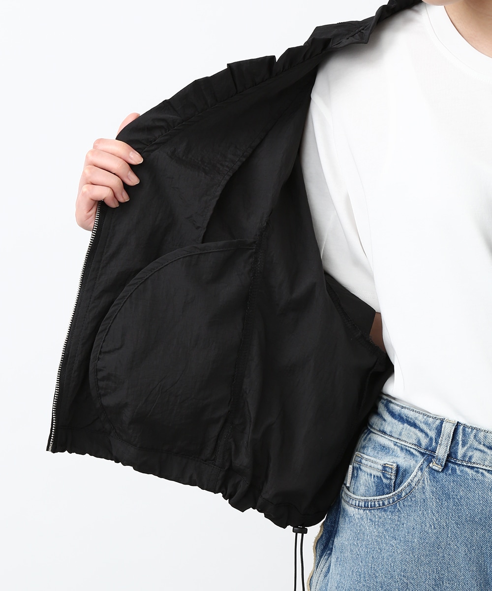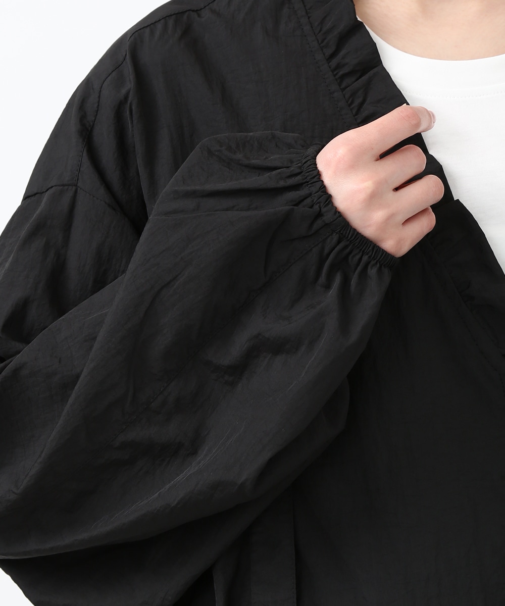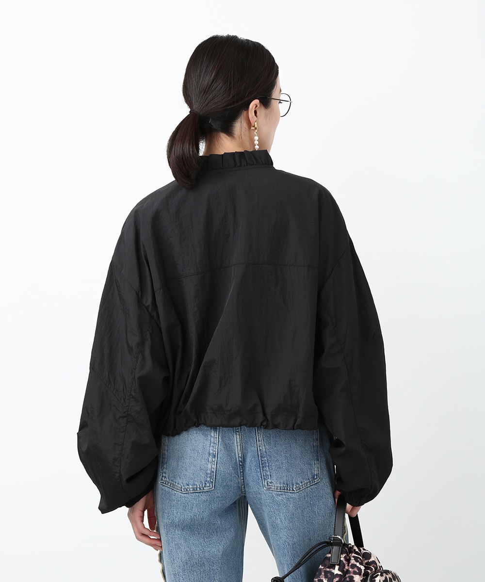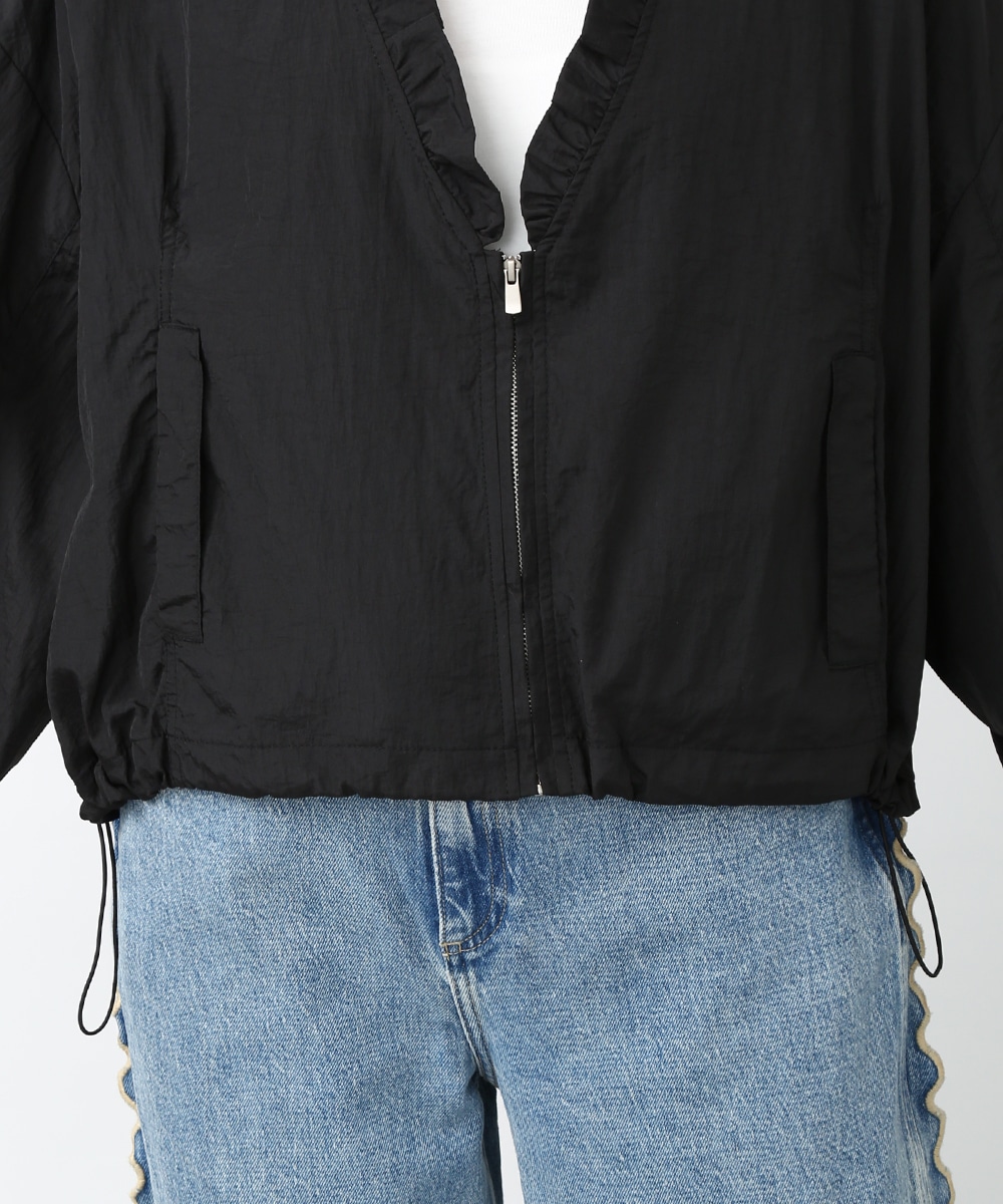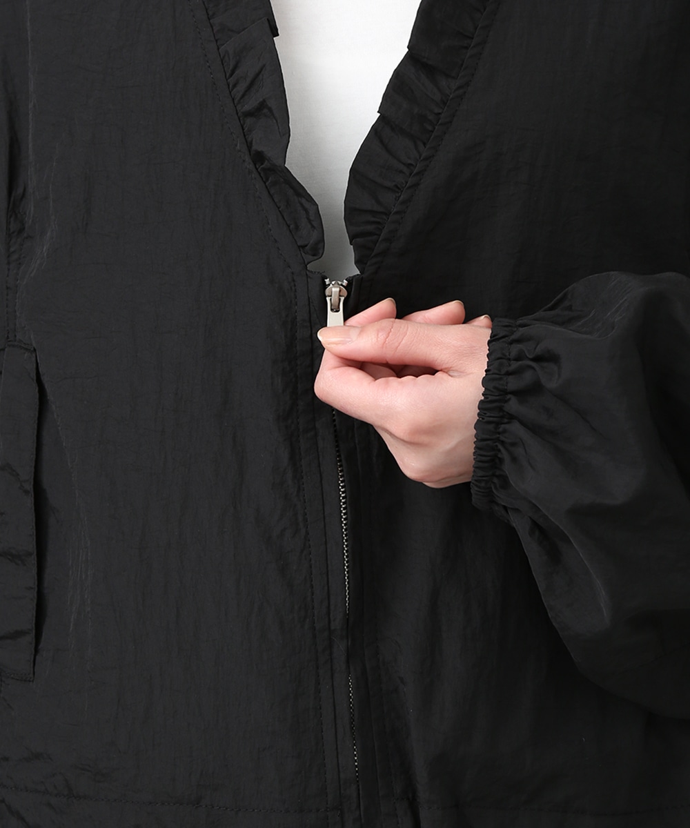 Vネックにあしらったプチフリルがアクセントになるコンパクトブルゾン。軽やかな素材感で、カーディガンのように気軽に羽織れる1着です。デザインカットソーを合わせてラフにまとめつつ、華奢なネックレスや小ぶりのピアスを添えることで、顔まわりに抜け感を出したスタイリングもおすすめです。