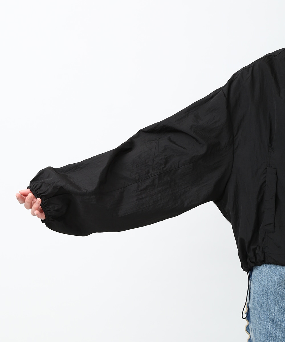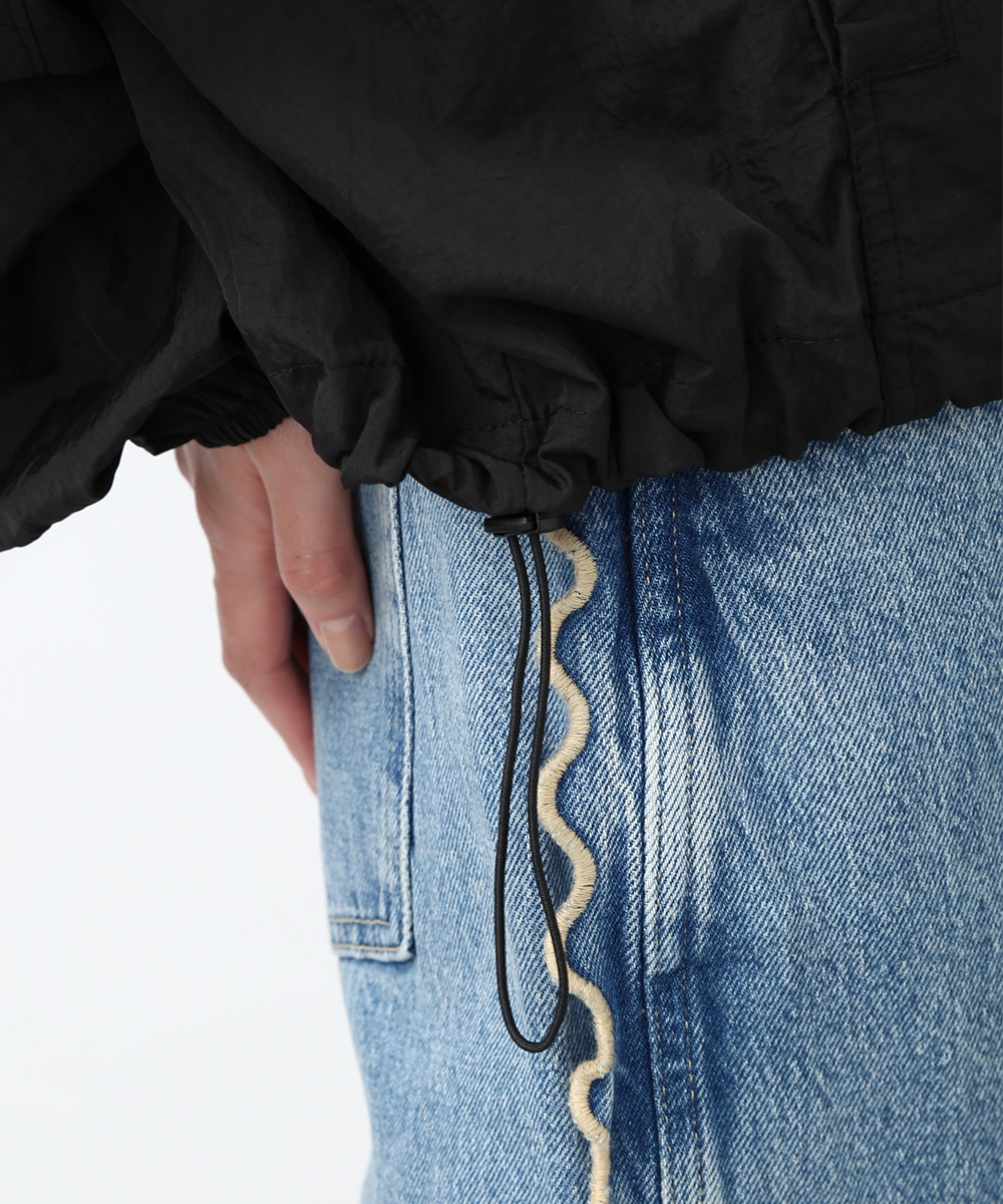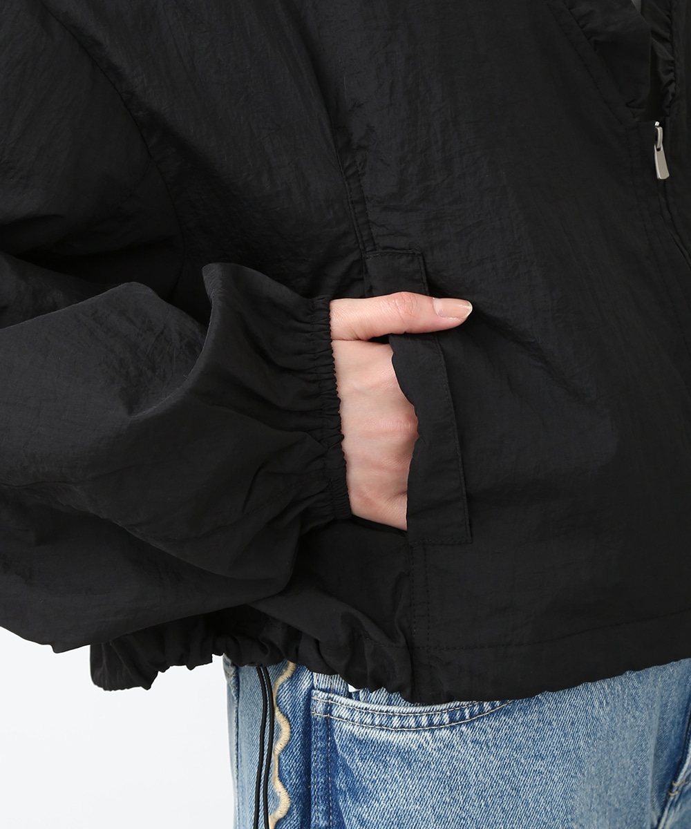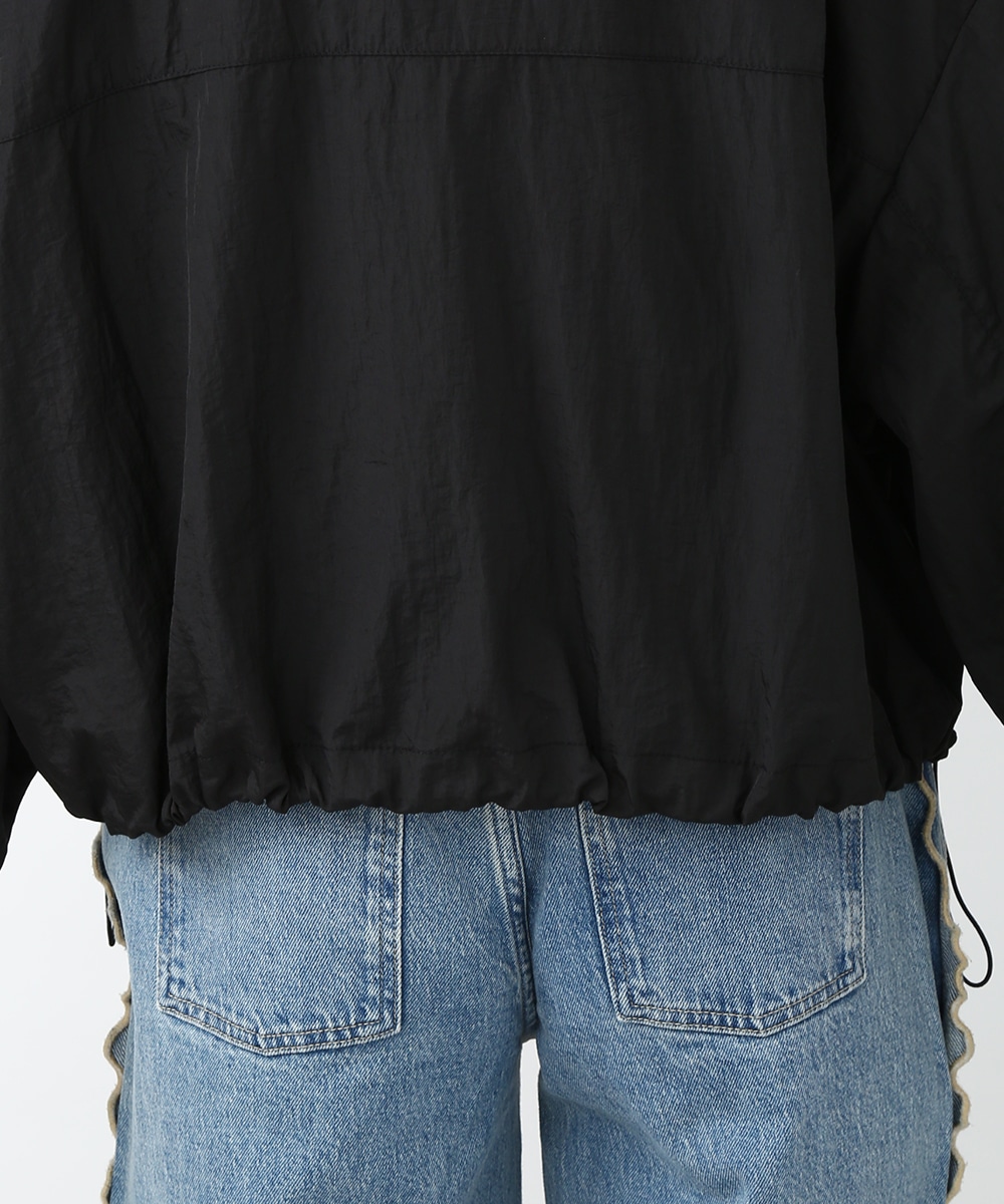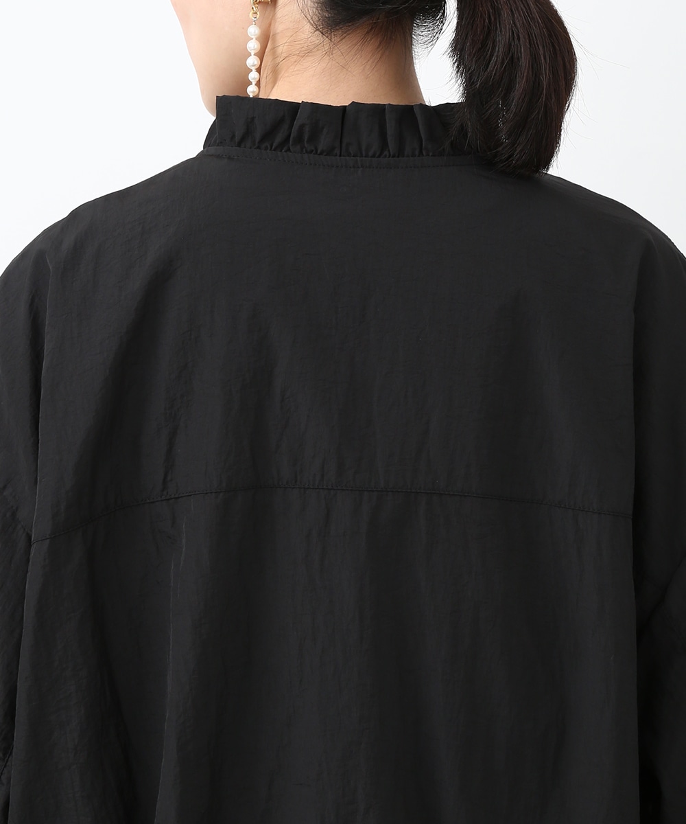 Vネックにあしらったプチフリルがアクセントになるコンパクトブルゾン。軽やかな素材感で、カーディガンのように気軽に羽織れる1着です。デザインカットソーを合わせてラフにまとめつつ、華奢なネックレスや小ぶりのピアスを添えることで、顔まわりに抜け感を出したスタイリングもおすすめです。