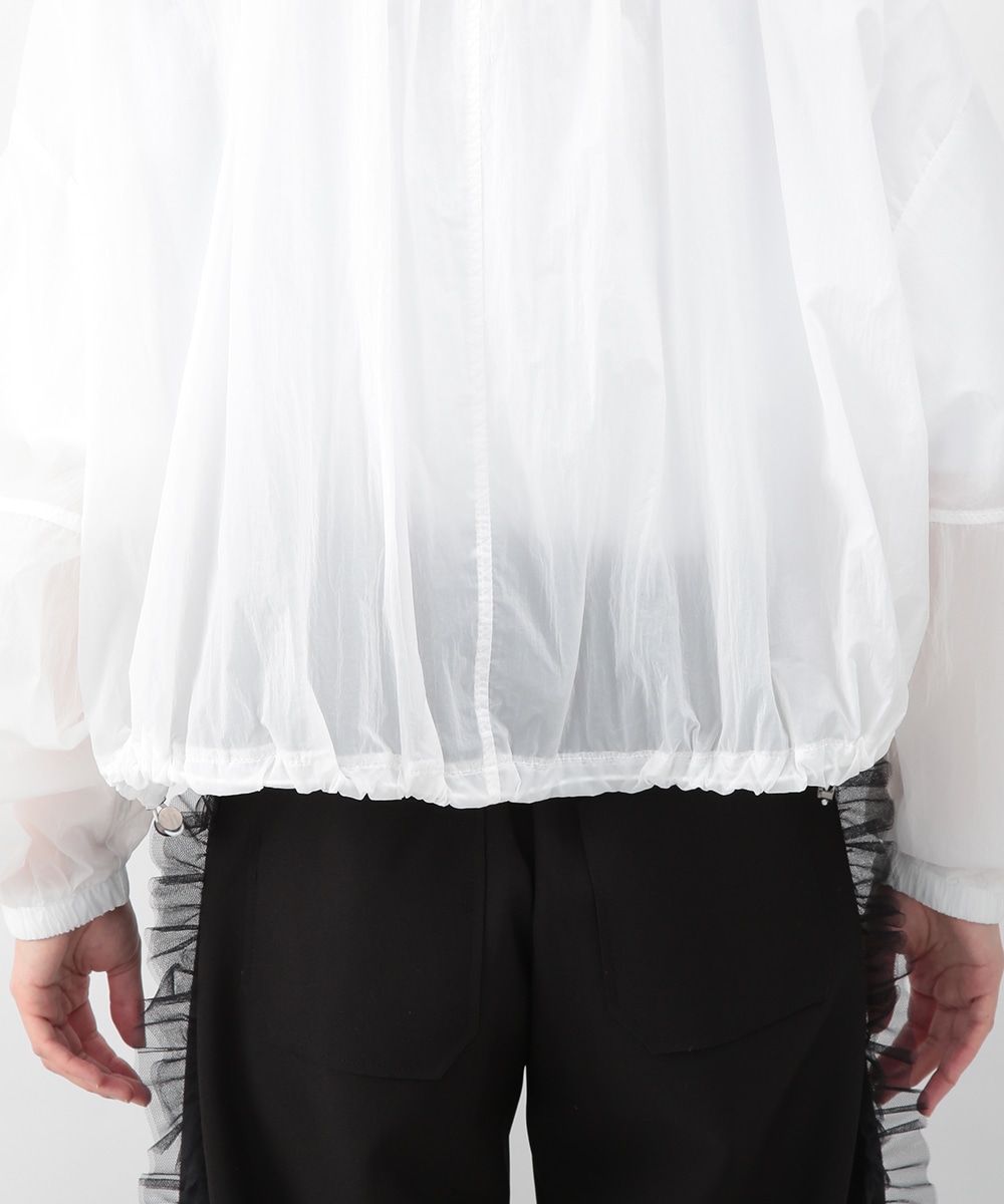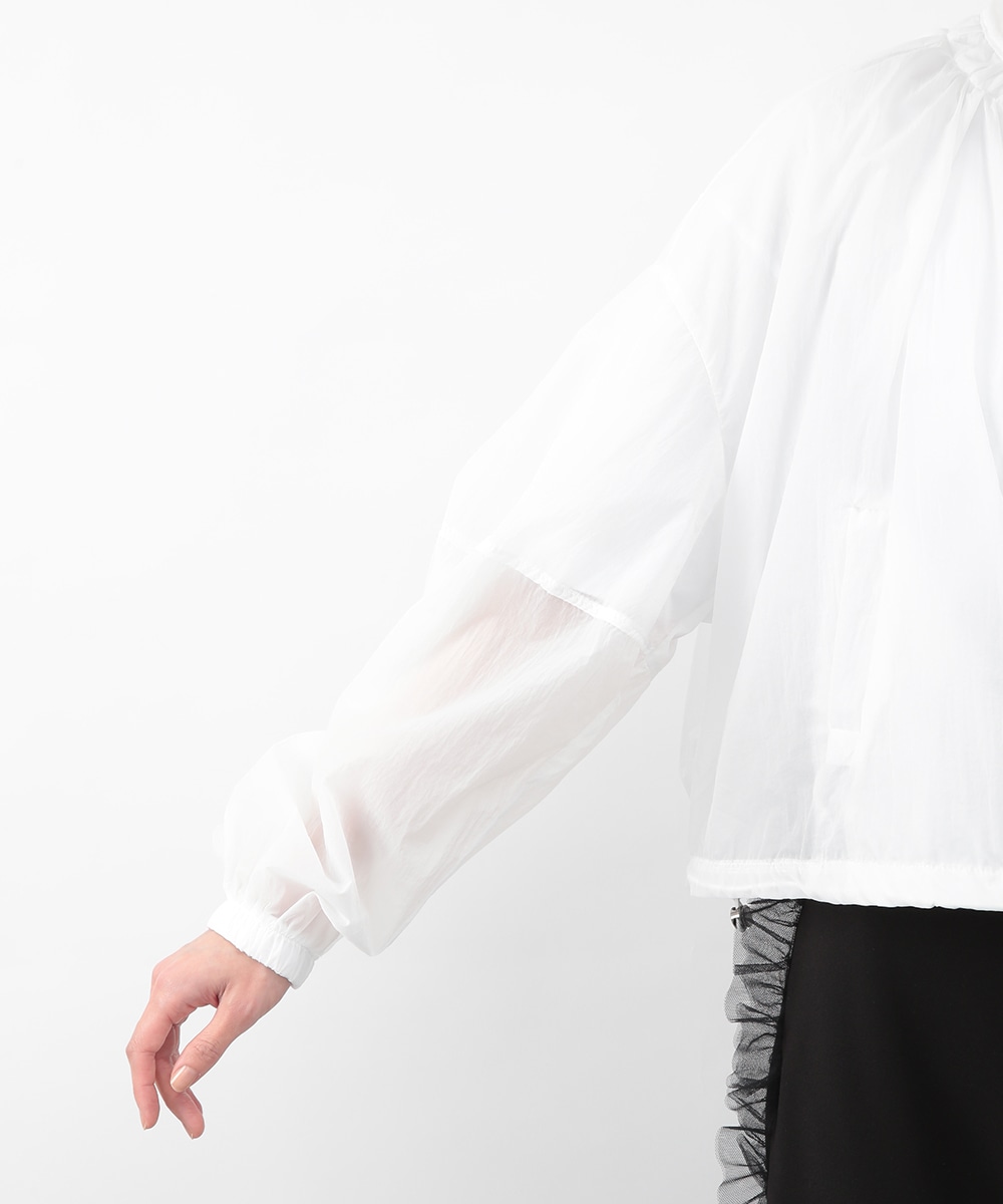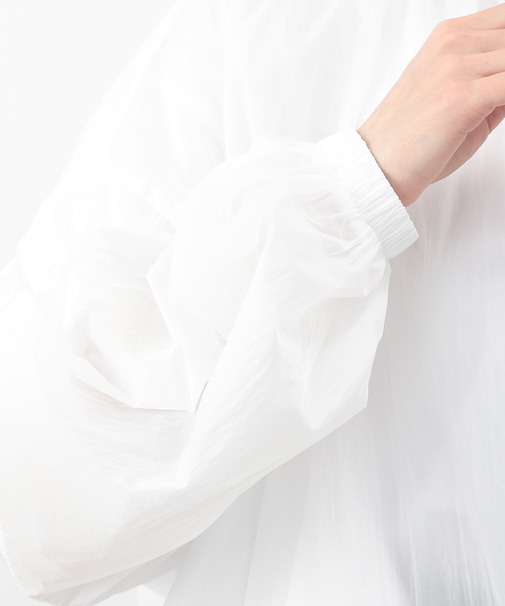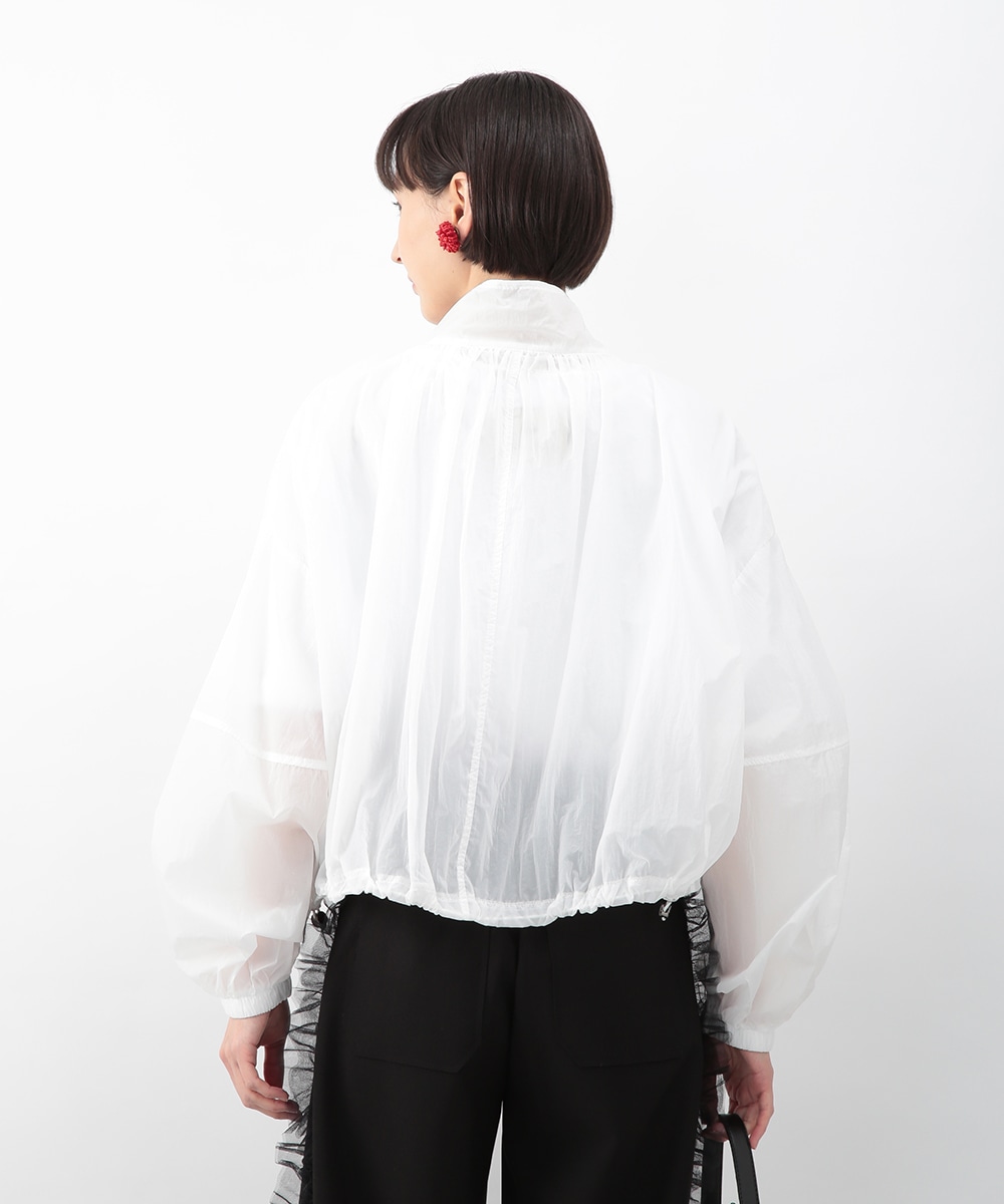 たっぷりと施したギャザーが立体的なシルエットを描くライトブルゾン。ふんわりとしたフォルムが女性らしい印象を添え、軽やかな素材感でシャツのように気負わず羽織れます。程よい透け感がコーデに抜け感をプラスし、パンツにもスカートにも合わせやすいデザイン。季節の変わり目に重宝する一枚です。
