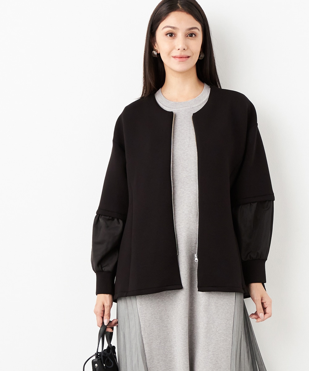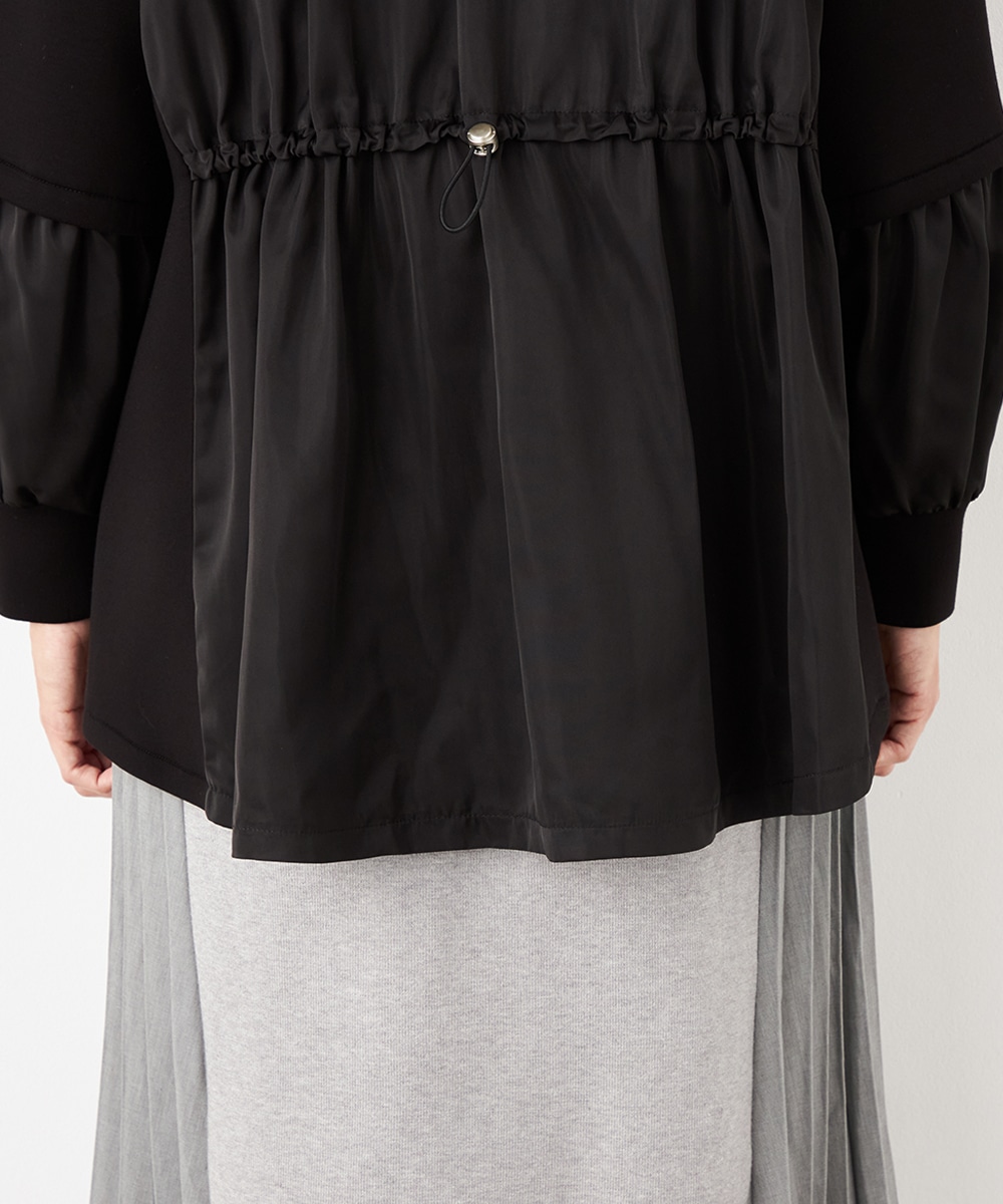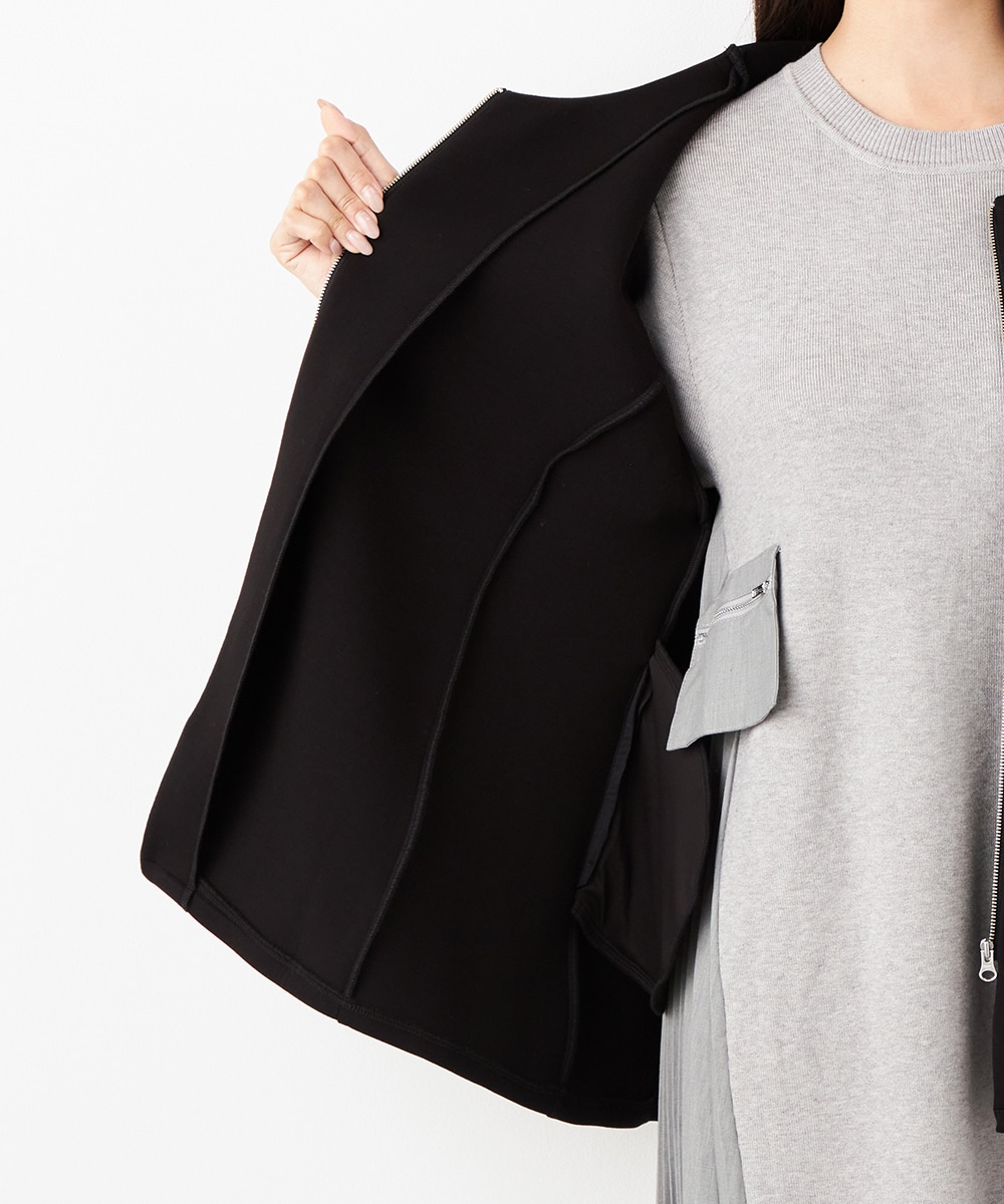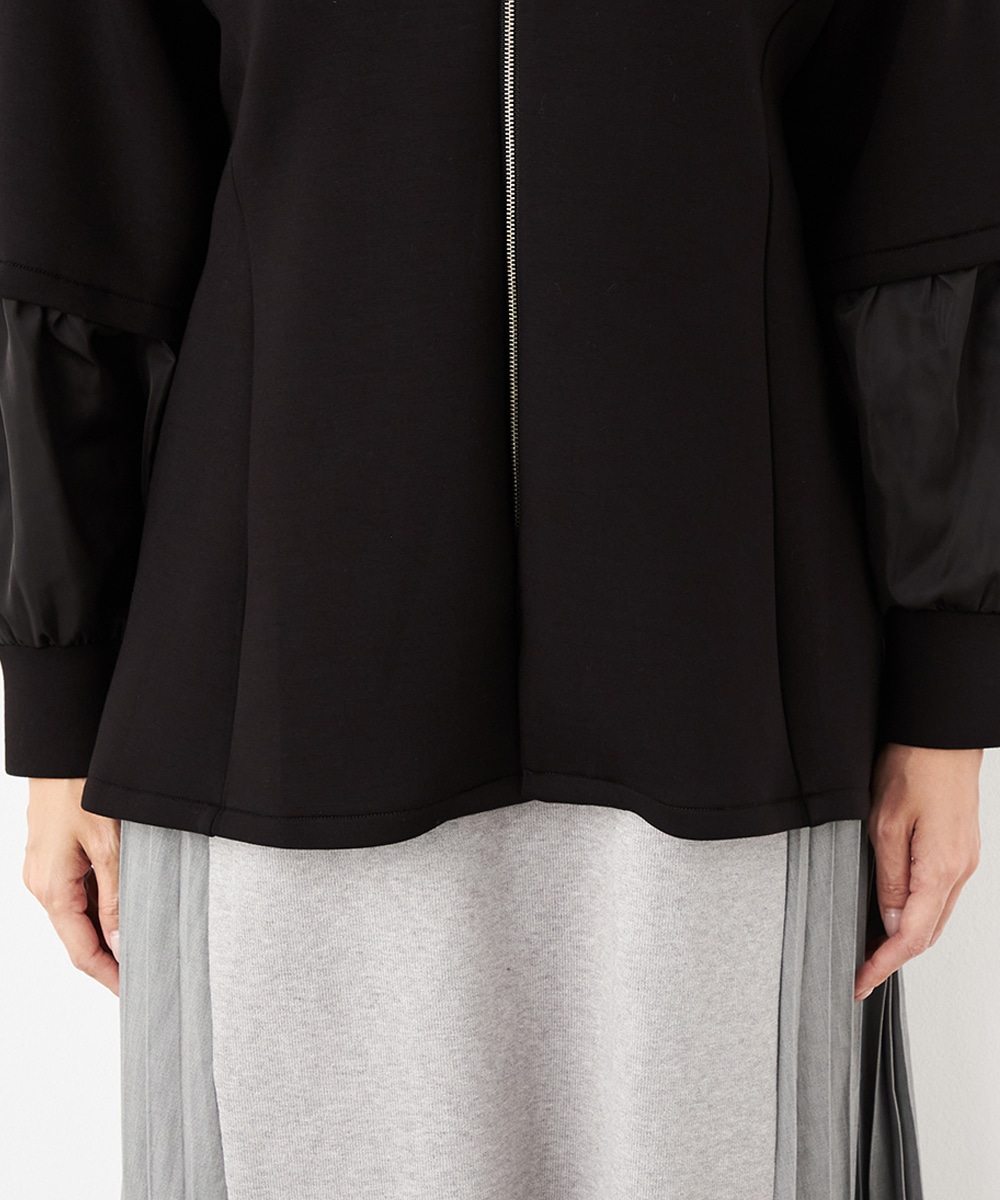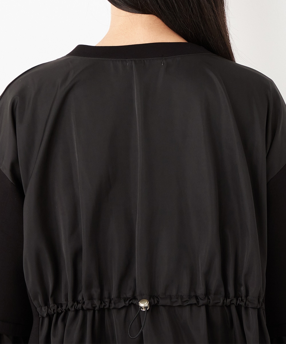 素材感のコントラストが印象的で、コーディネートのポイントとしても活躍します。モノトーンカラーでまとまり、着こなしやすさも特徴です。袖口のリブ使い、ジップ開きのフロント、後ろウエストのコードなどのディテールがスポーティ感をプラス。さまざまなボトムスと合わせられる短めの着丈です。