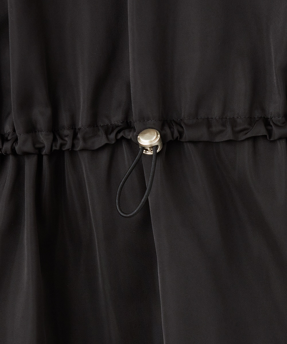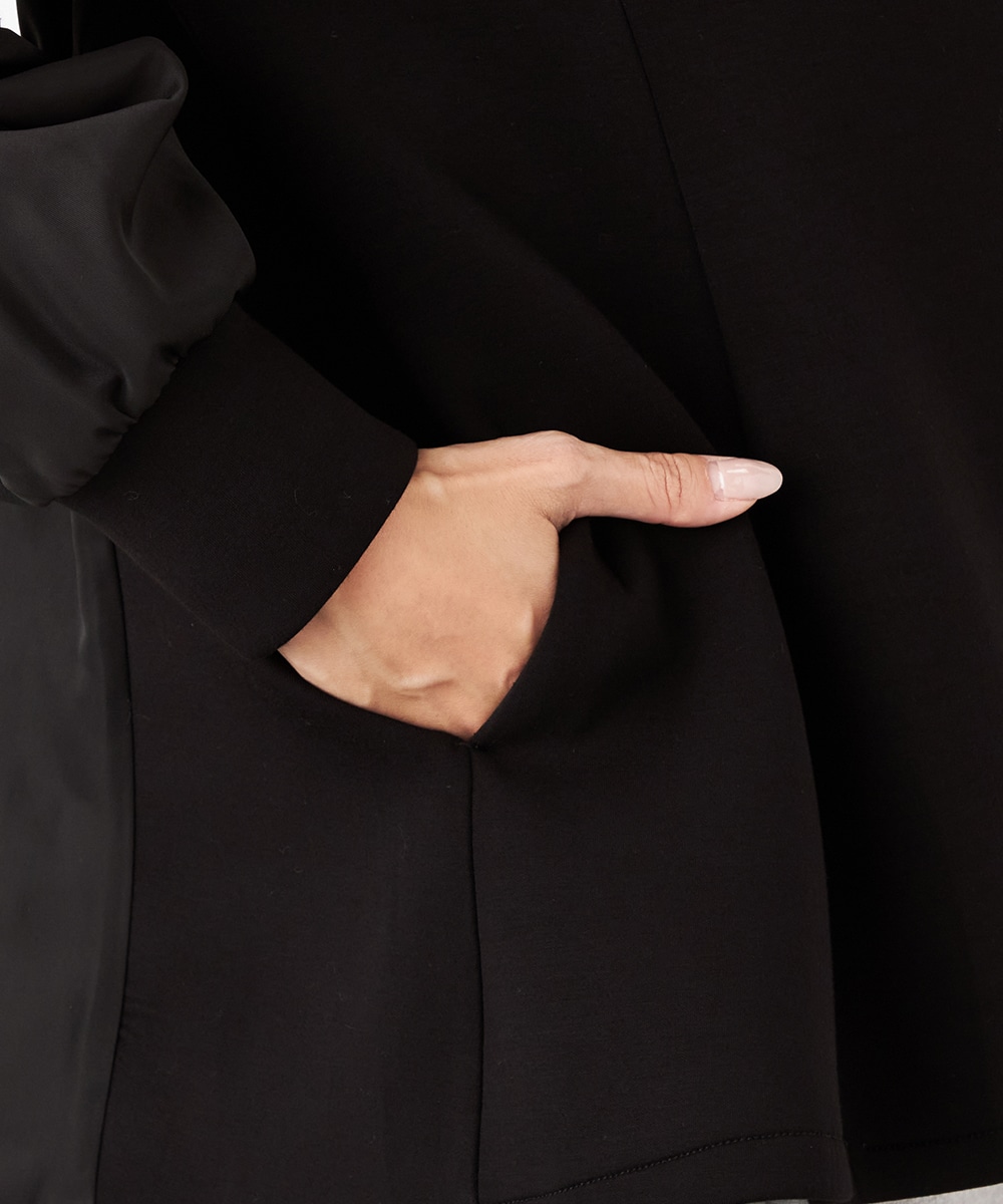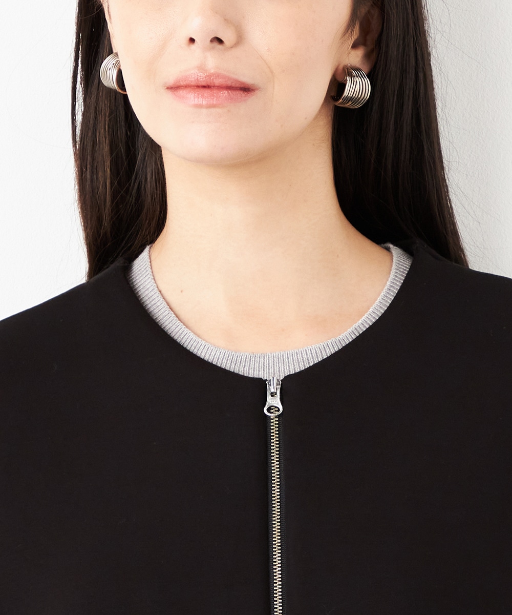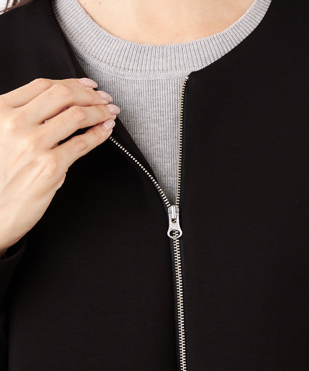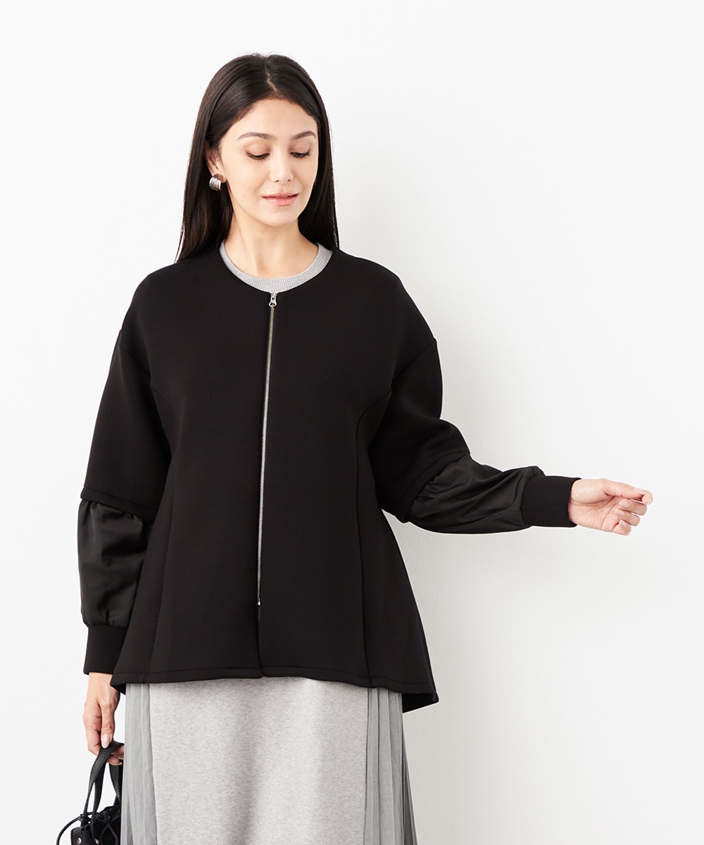 素材感のコントラストが印象的で、コーディネートのポイントとしても活躍します。モノトーンカラーでまとまり、着こなしやすさも特徴です。袖口のリブ使い、ジップ開きのフロント、後ろウエストのコードなどのディテールがスポーティ感をプラス。さまざまなボトムスと合わせられる短めの着丈です。