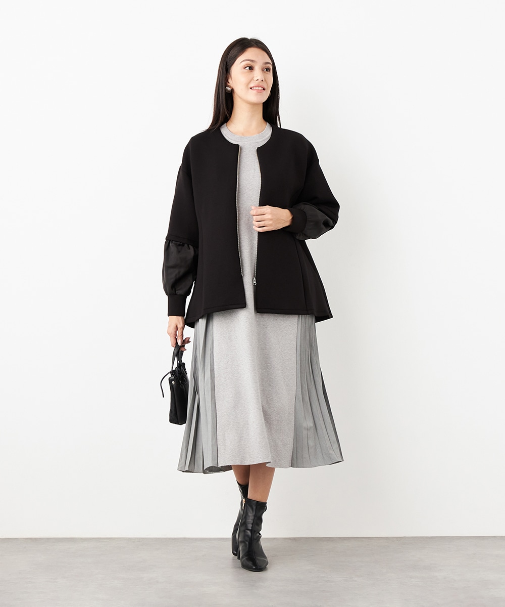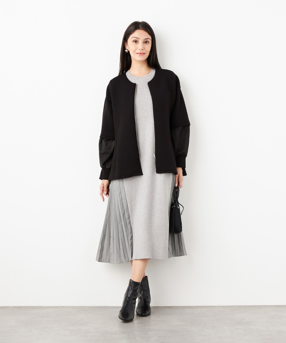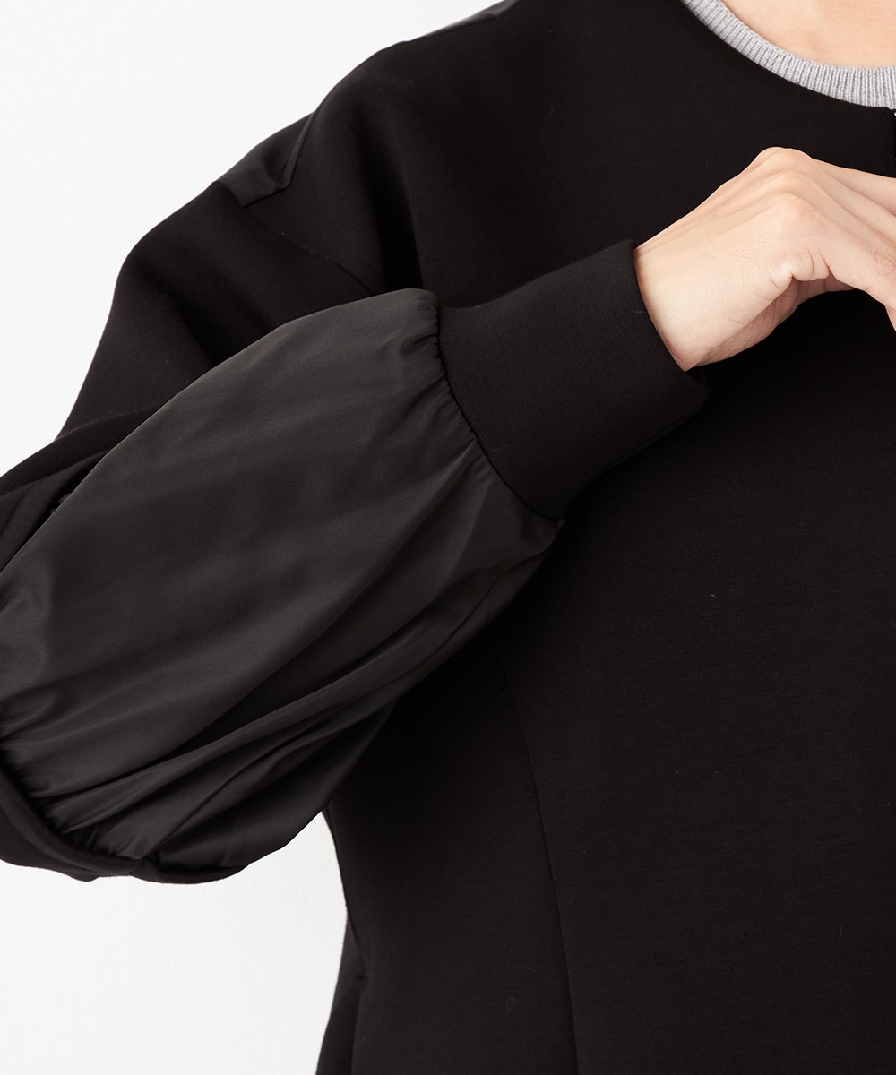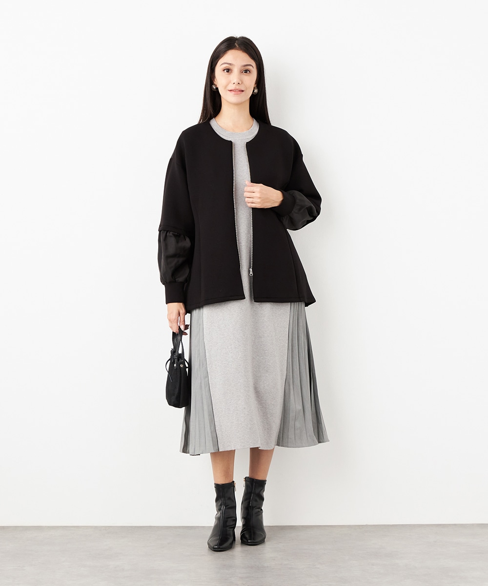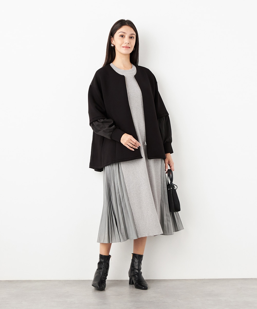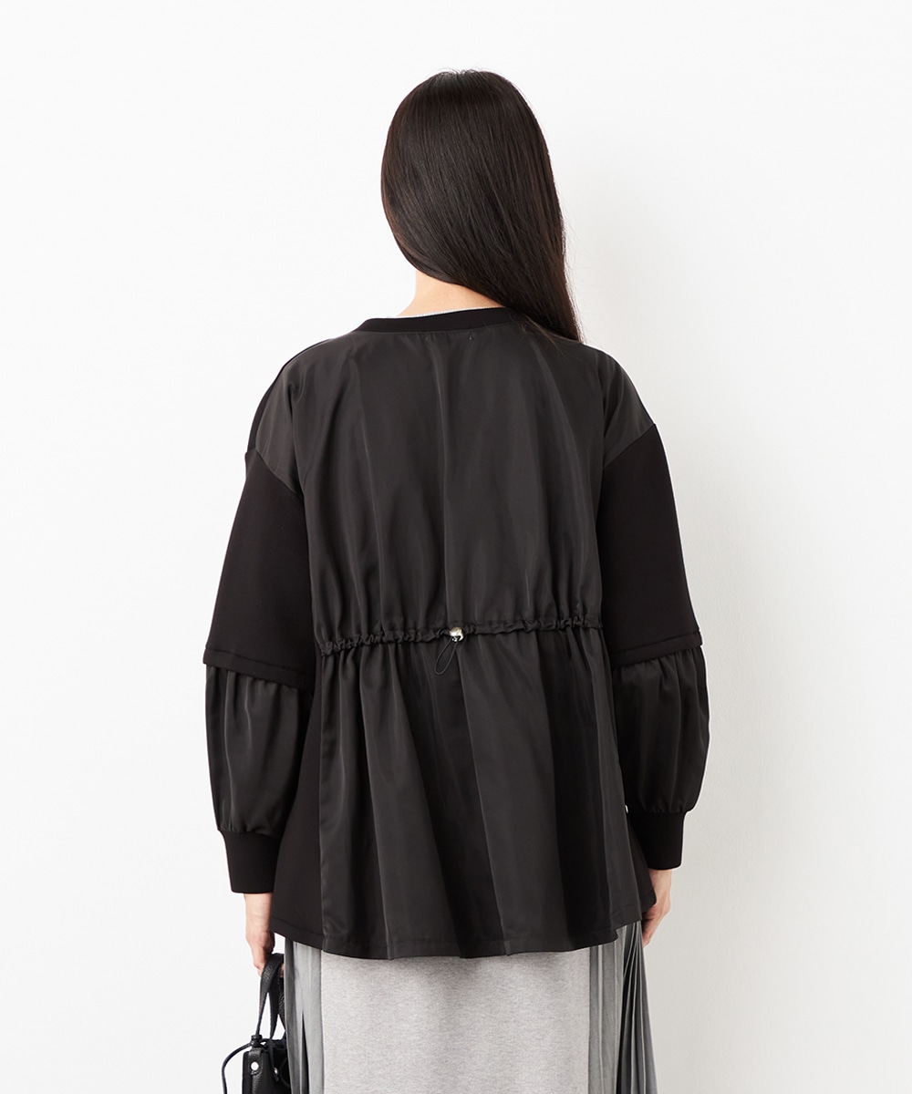 素材感のコントラストが印象的で、コーディネートのポイントとしても活躍します。モノトーンカラーでまとまり、着こなしやすさも特徴です。袖口のリブ使い、ジップ開きのフロント、後ろウエストのコードなどのディテールがスポーティ感をプラス。さまざまなボトムスと合わせられる短めの着丈です。