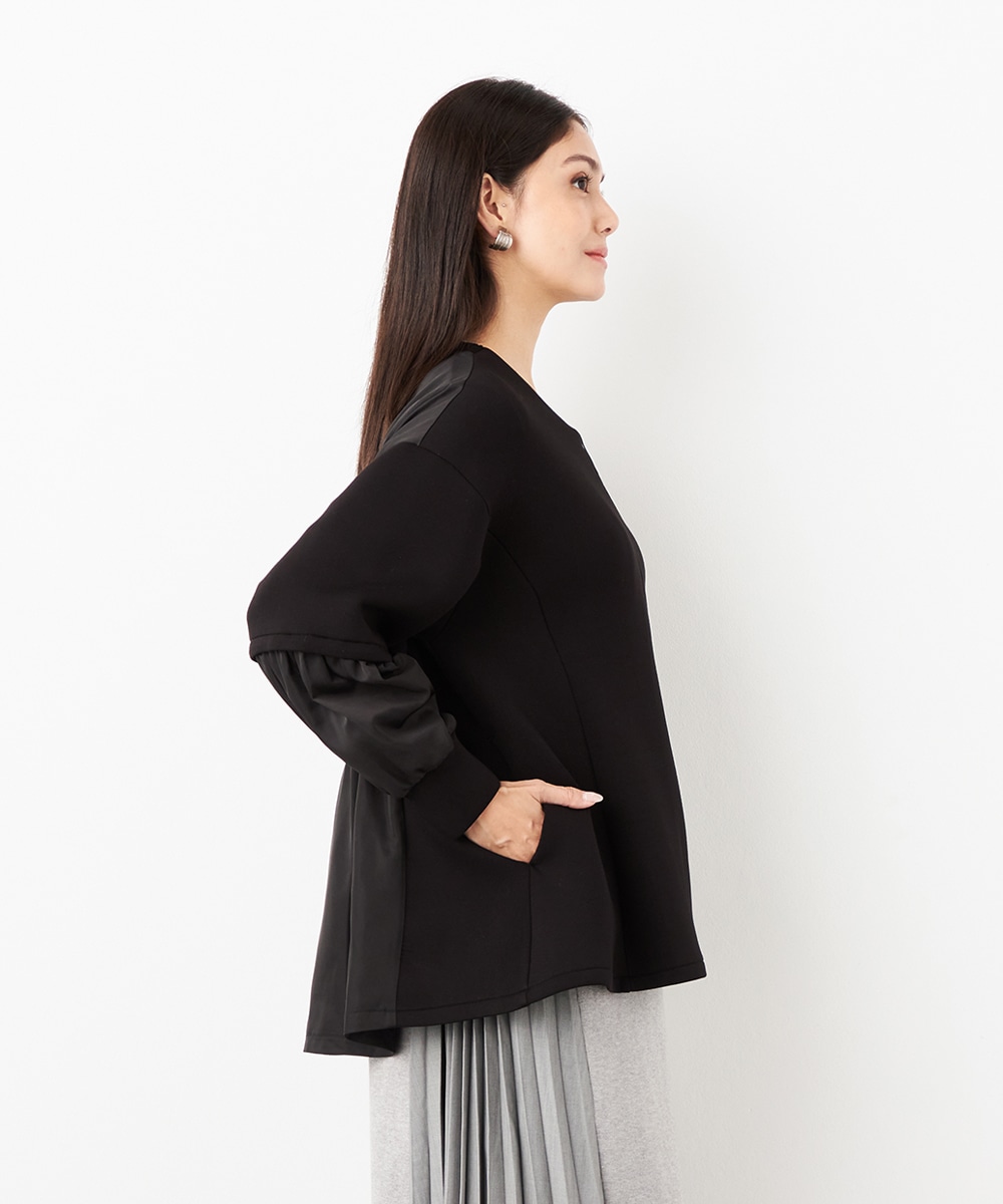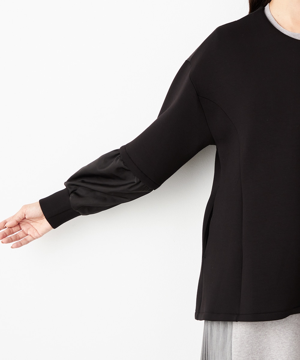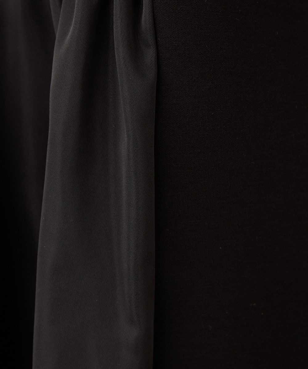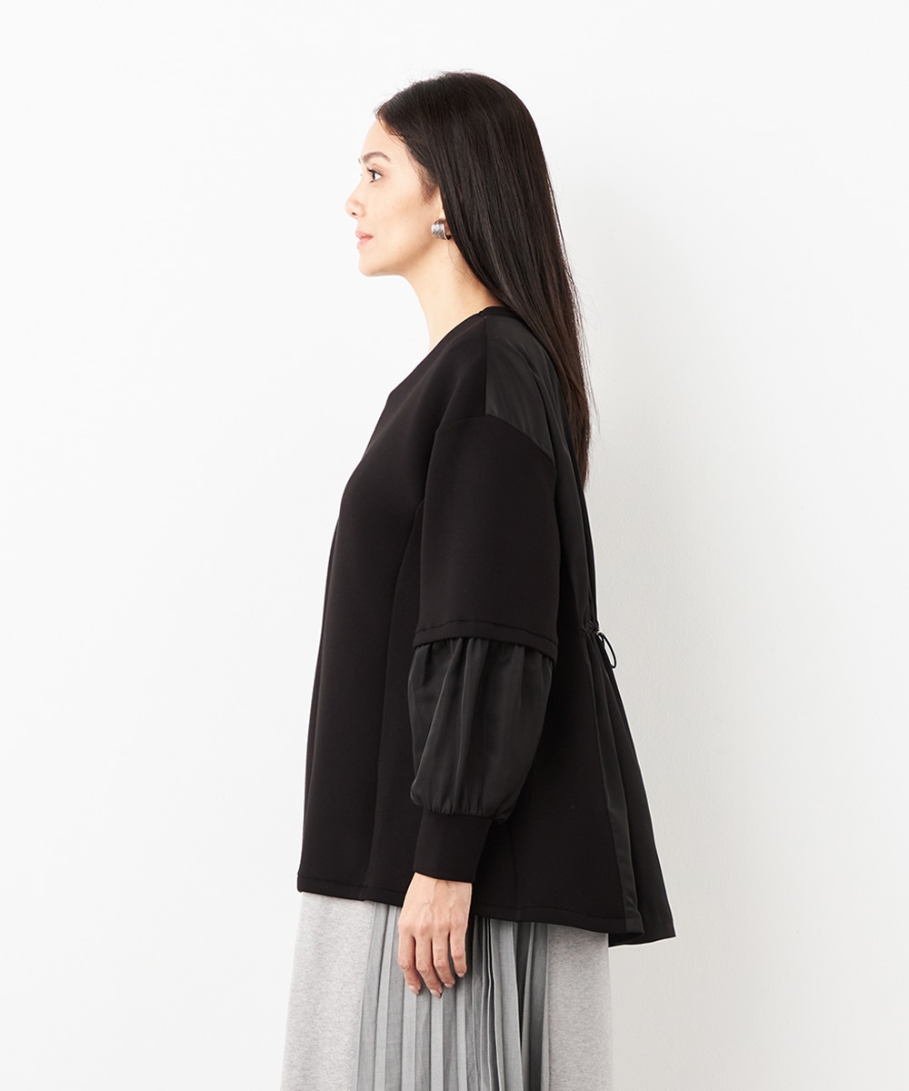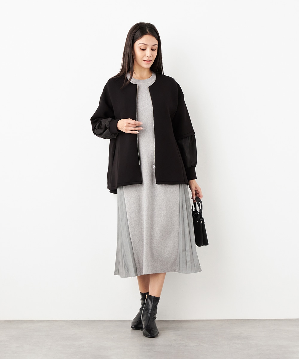 素材感のコントラストが印象的で、コーディネートのポイントとしても活躍します。モノトーンカラーでまとまり、着こなしやすさも特徴です。袖口のリブ使い、ジップ開きのフロント、後ろウエストのコードなどのディテールがスポーティ感をプラス。さまざまなボトムスと合わせられる短めの着丈です。