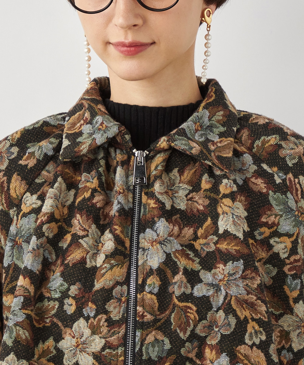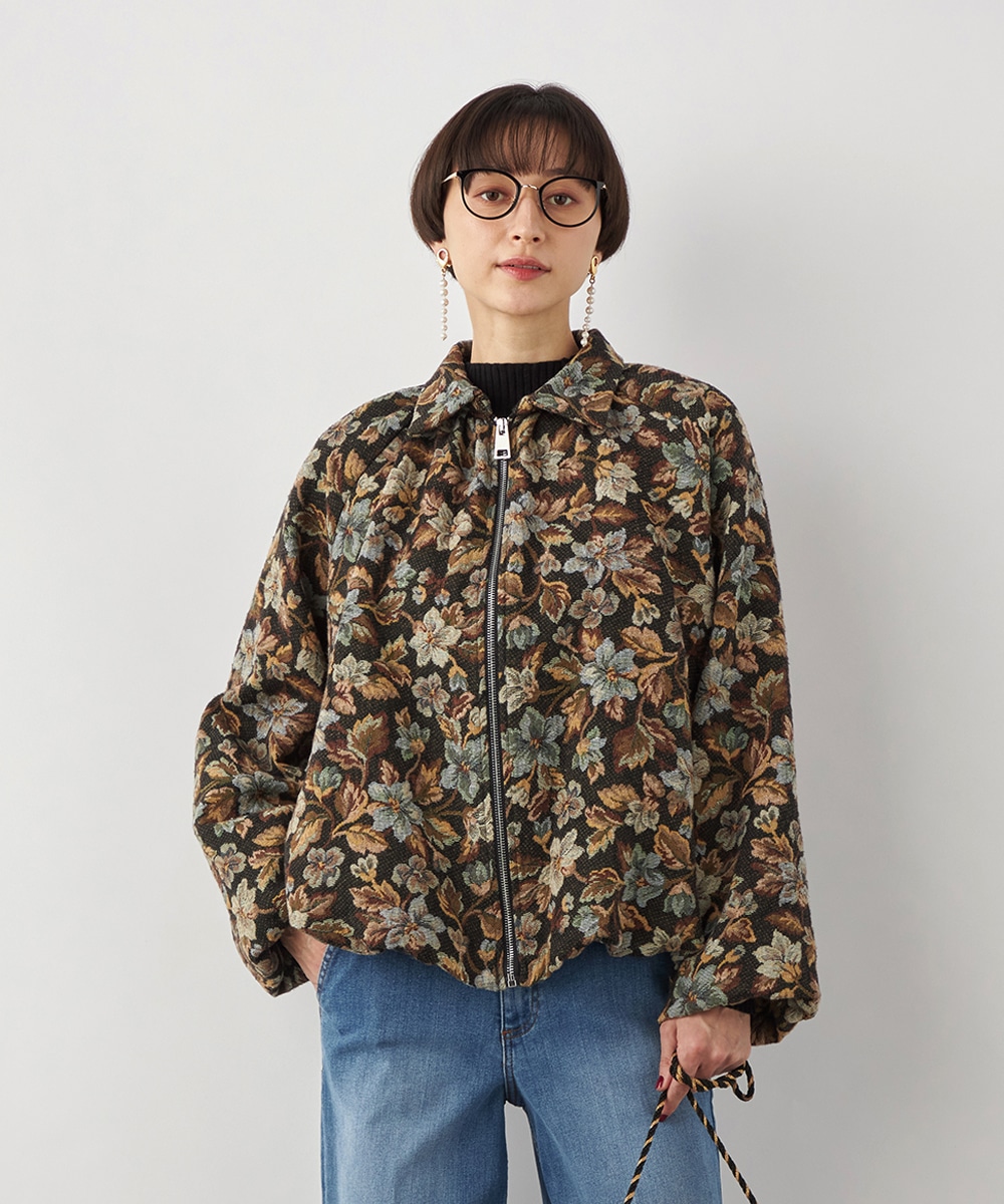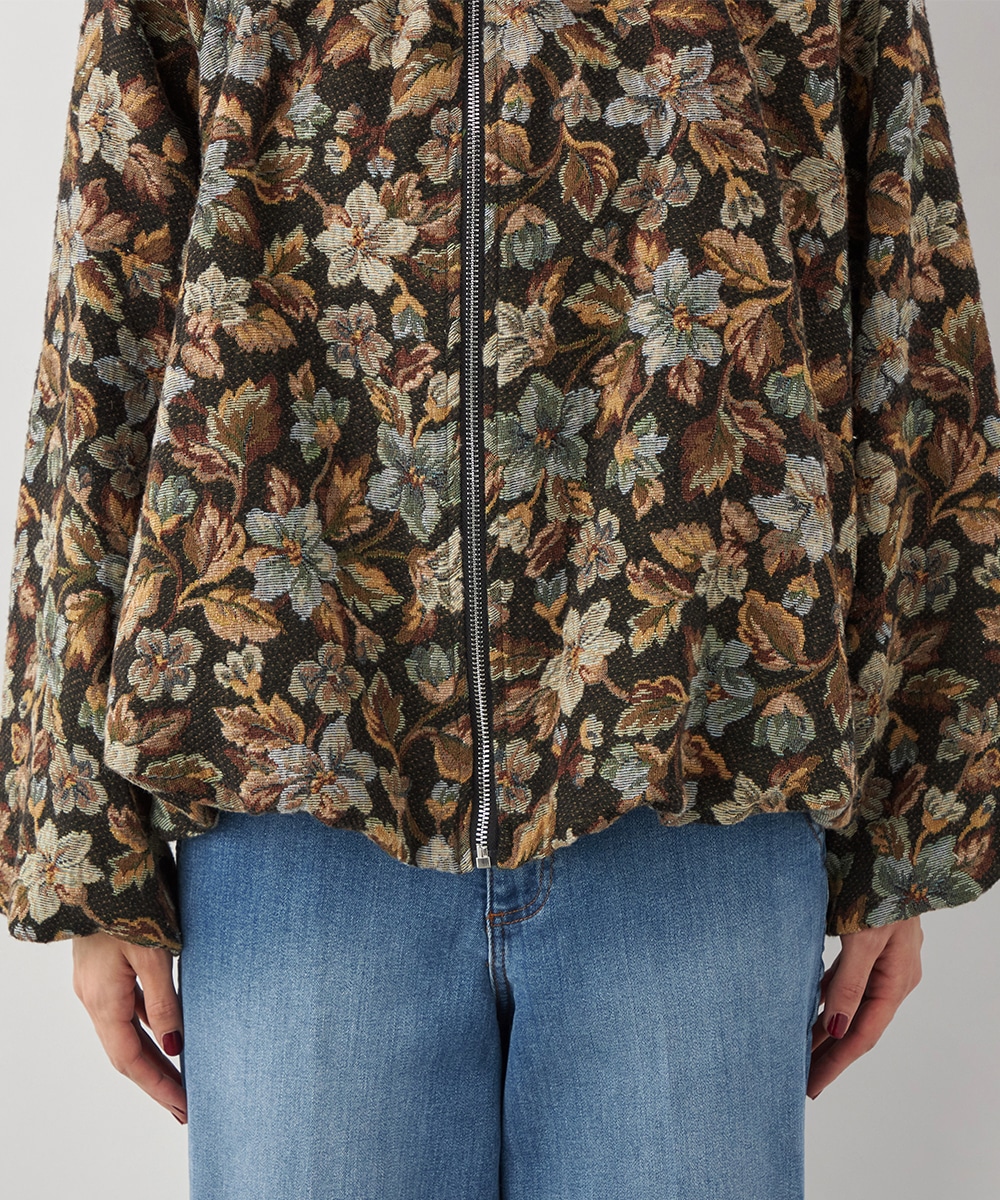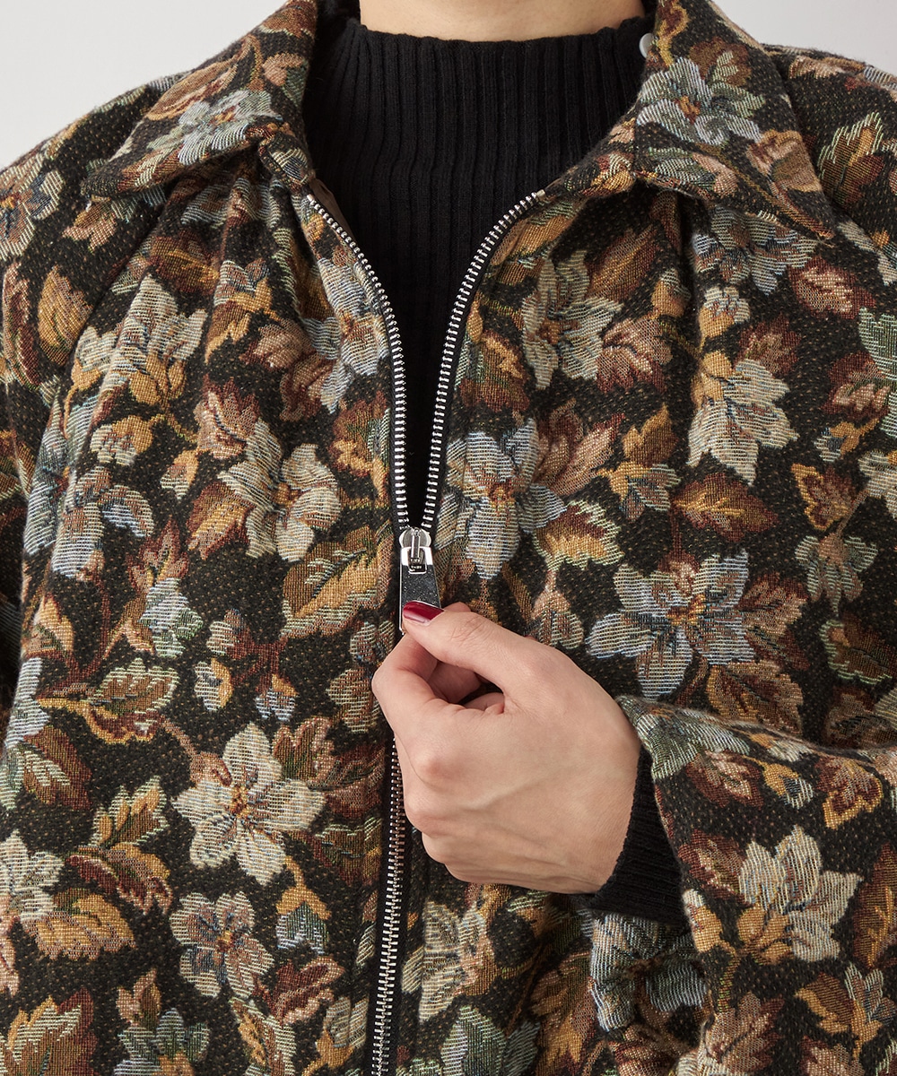フェミニンな雰囲気あふれるフラワー柄を、繊細なタッチで表現しています。華やかな柄とシックなカラーリングのバランスが良いのも特徴です。ラグラン切り替えのゆったりとしたシルエットはデイリーカジュアルにも重宝。フロントはスポーティなジップ開きを採用しています。