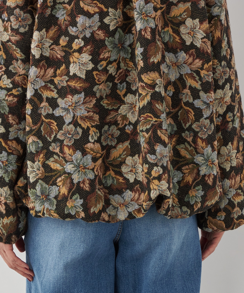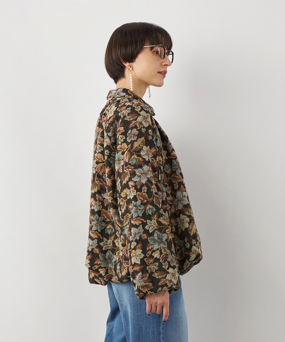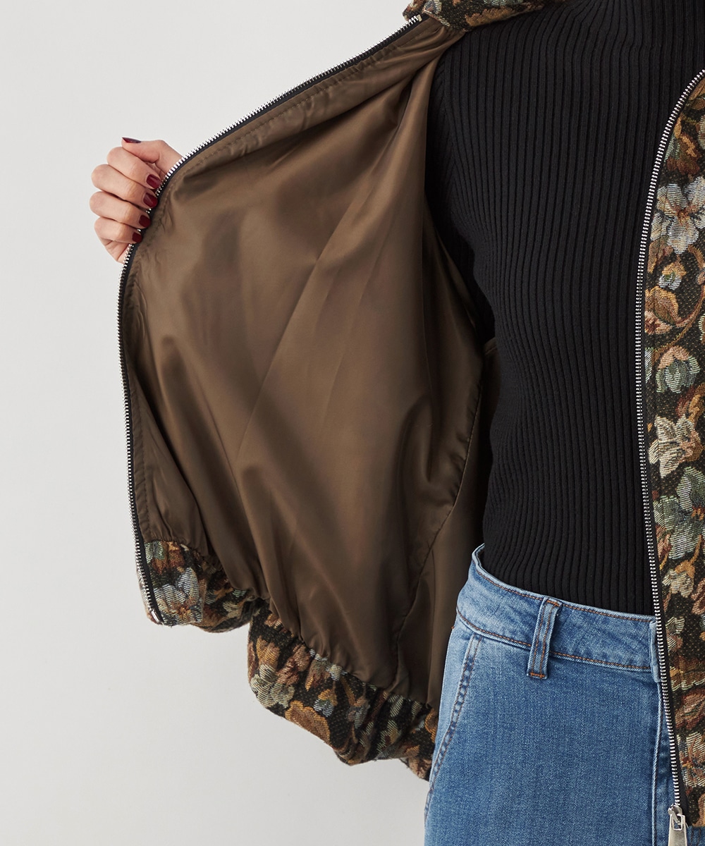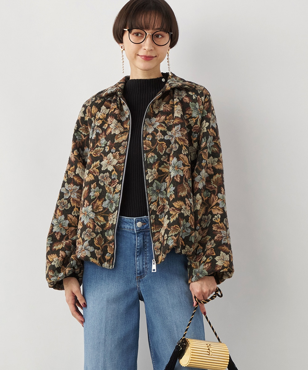 フェミニンな雰囲気あふれるフラワー柄を、繊細なタッチで表現しています。華やかな柄とシックなカラーリングのバランスが良いのも特徴です。ラグラン切り替えのゆったりとしたシルエットはデイリーカジュアルにも重宝。フロントはスポーティなジップ開きを採用しています。