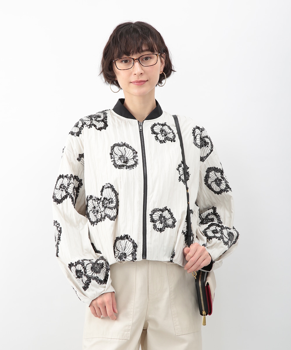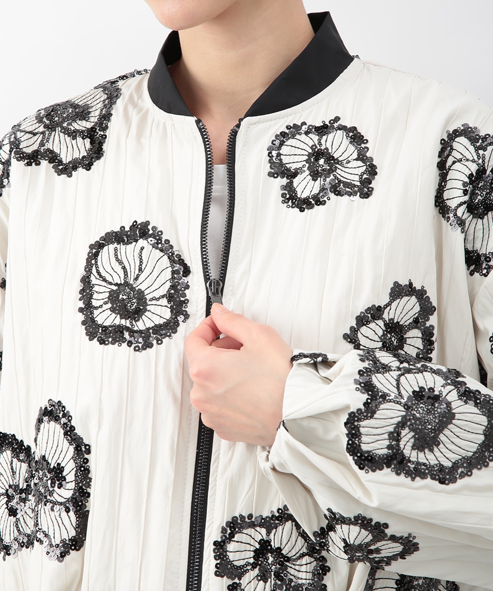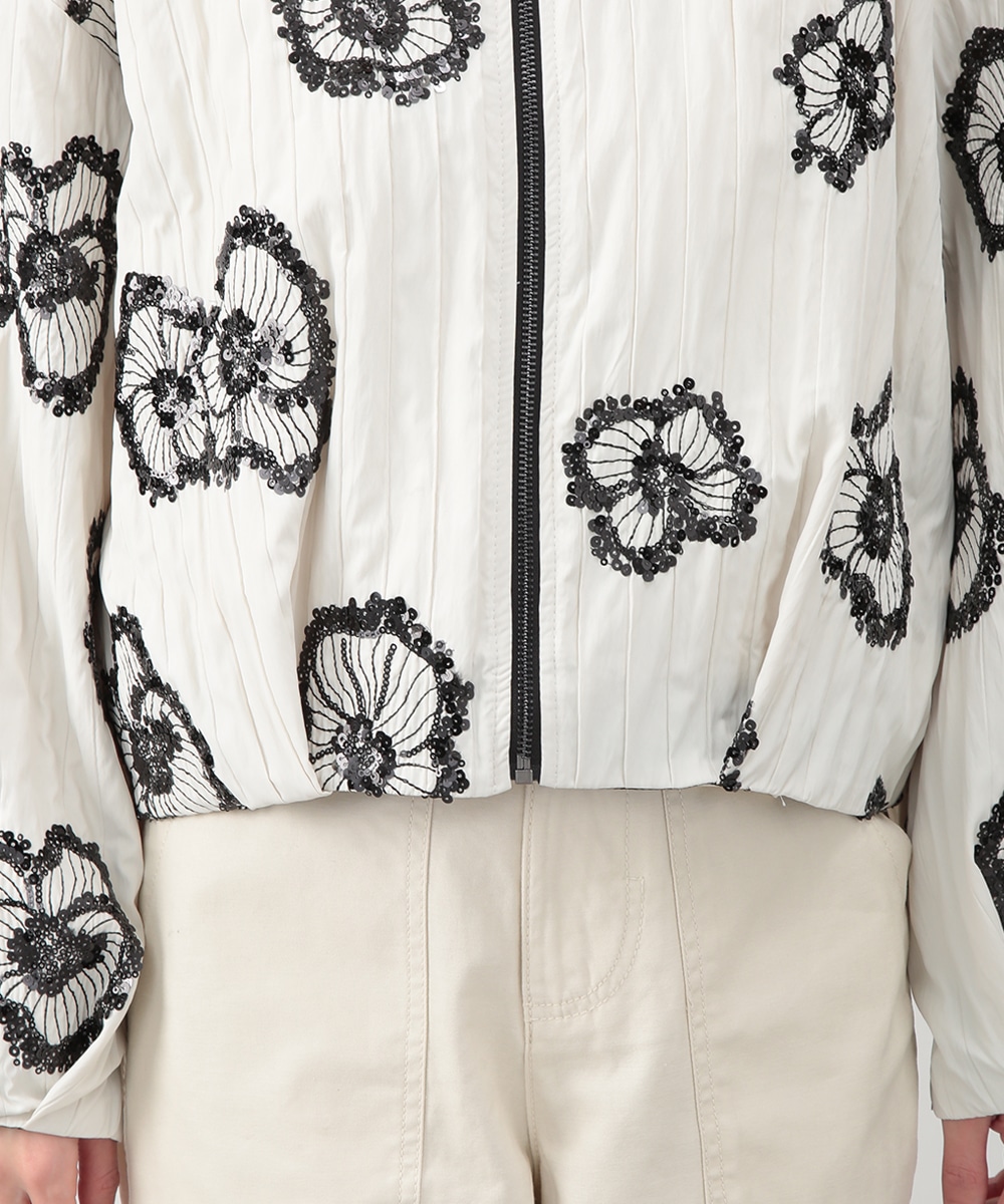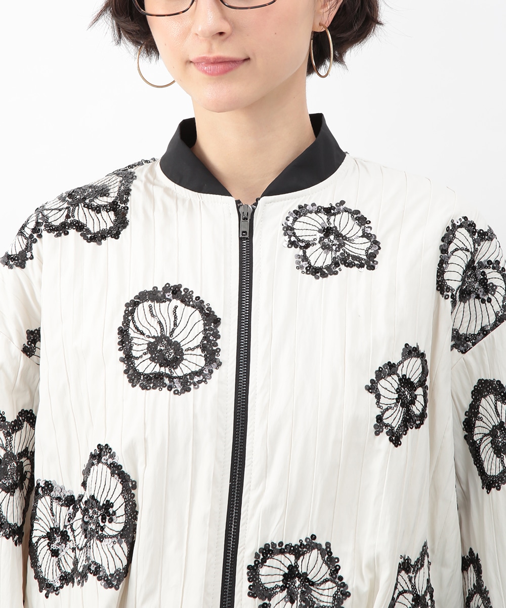 スパンコールで描いたフラワーモチーフが印象的なブルゾン。立体感のあるディテールが、シンプルな装いに華やぎをプラス。モノトーンを基調とした配色で、甘さを抑えたバランスに仕上げています。デニムパンツを穿いてカジュアルに、きれいめボトムを合わせてモードな雰囲気にも取り入れやすい一着です。