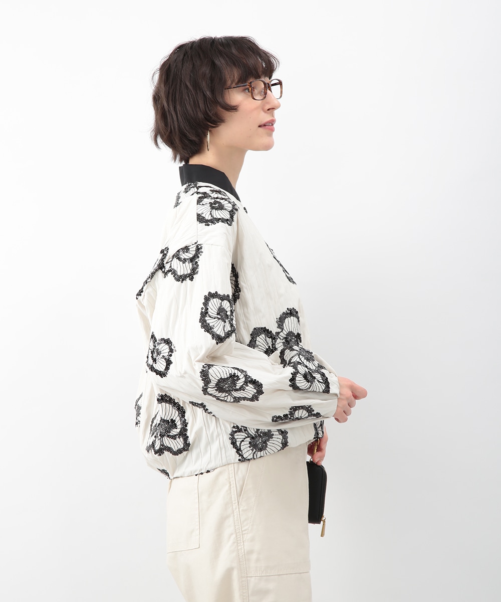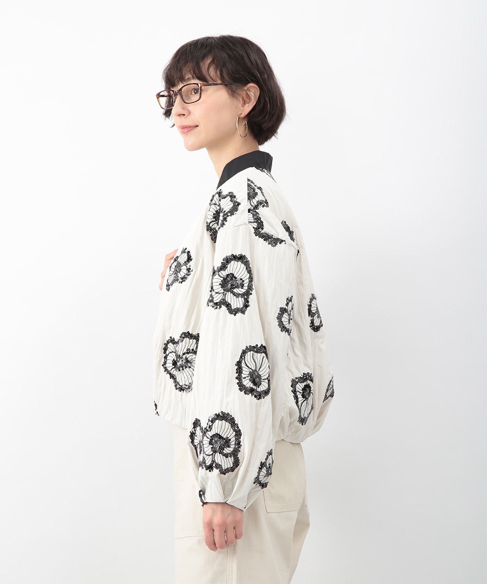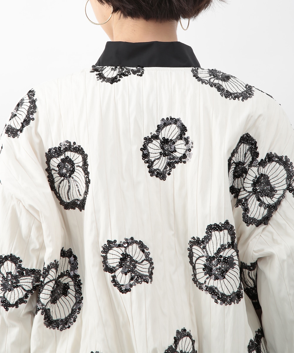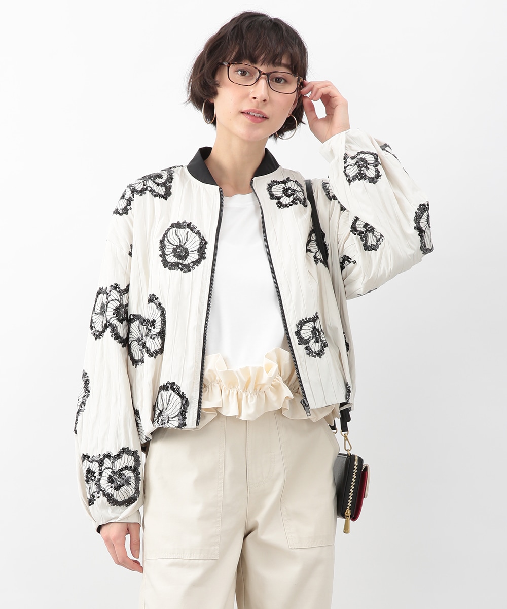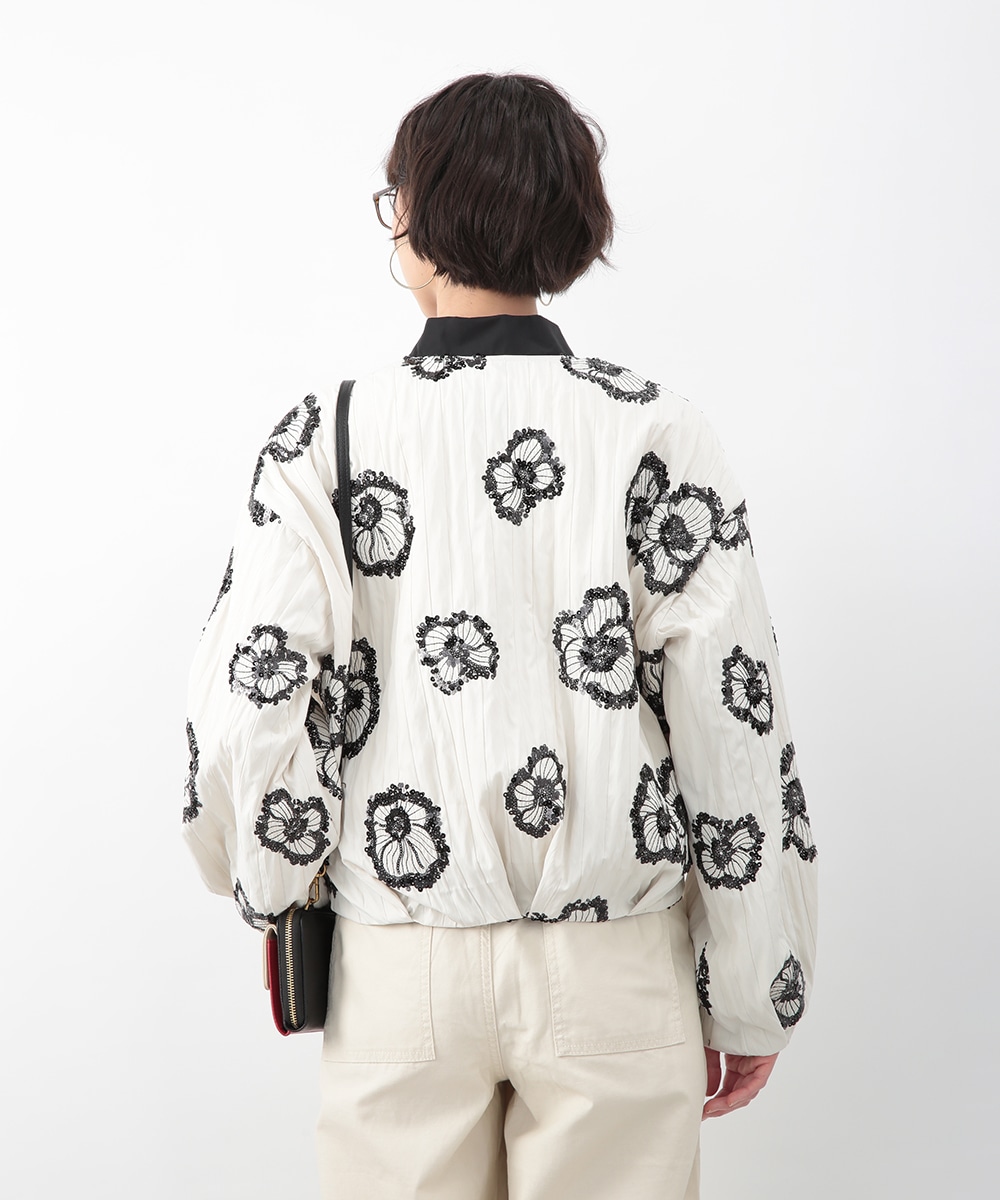 スパンコールで描いたフラワーモチーフが印象的なブルゾン。立体感のあるディテールが、シンプルな装いに華やぎをプラス。モノトーンを基調とした配色で、甘さを抑えたバランスに仕上げています。デニムパンツを穿いてカジュアルに、きれいめボトムを合わせてモードな雰囲気にも取り入れやすい一着です。