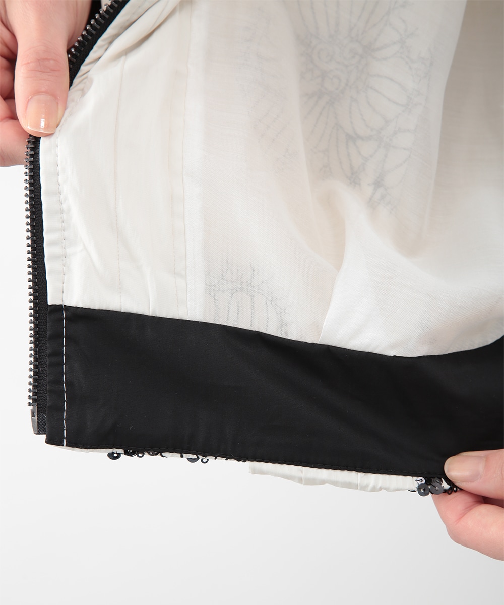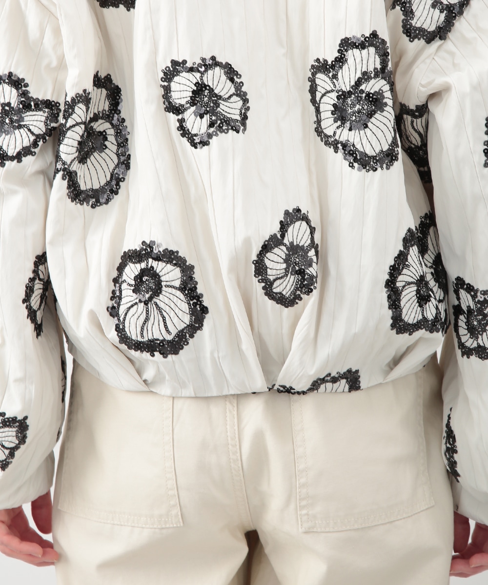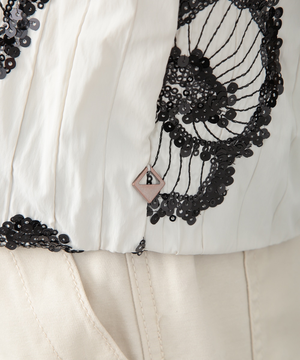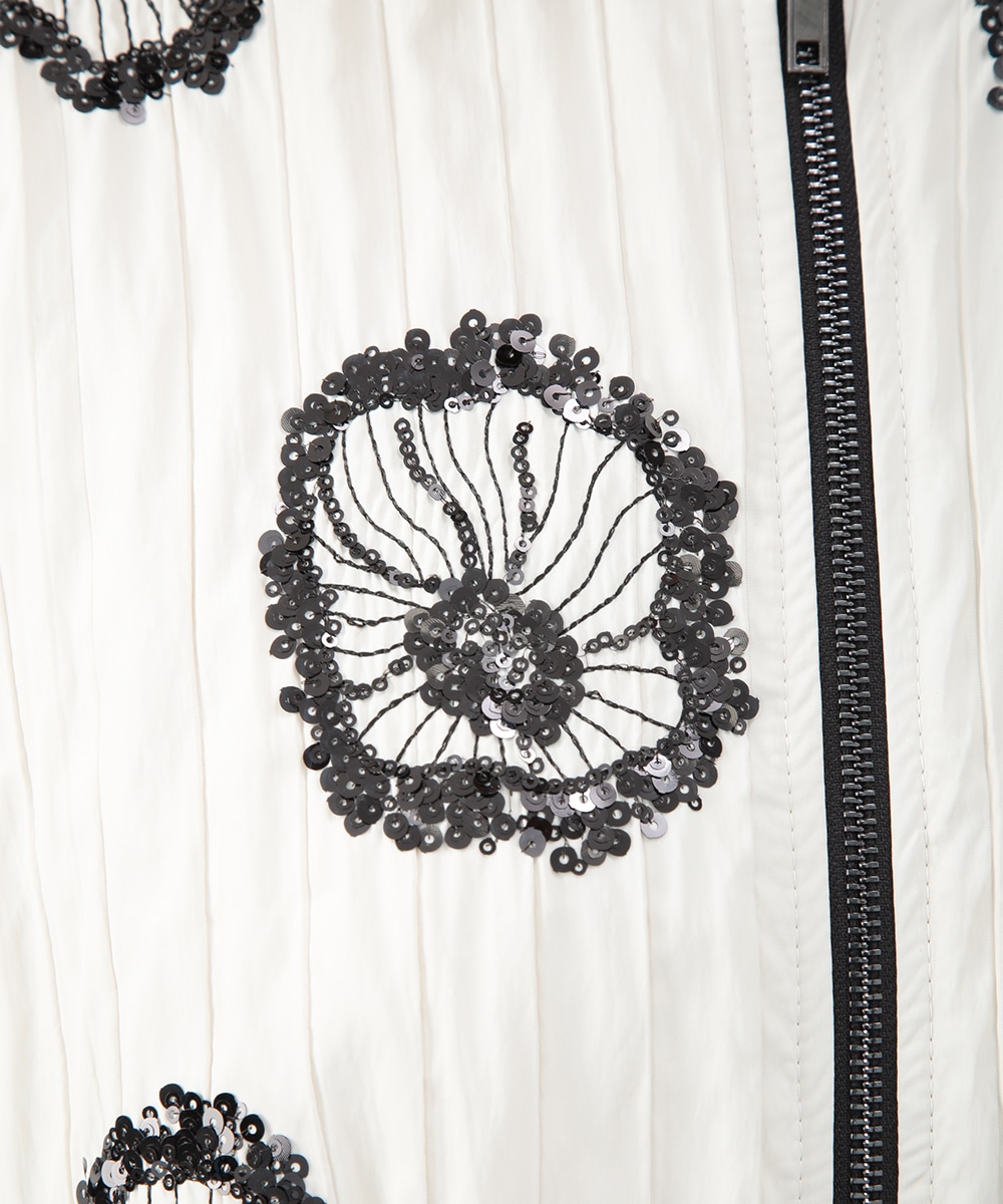 スパンコールで描いたフラワーモチーフが印象的なブルゾン。立体感のあるディテールが、シンプルな装いに華やぎをプラス。モノトーンを基調とした配色で、甘さを抑えたバランスに仕上げています。デニムパンツを穿いてカジュアルに、きれいめボトムを合わせてモードな雰囲気にも取り入れやすい一着です。