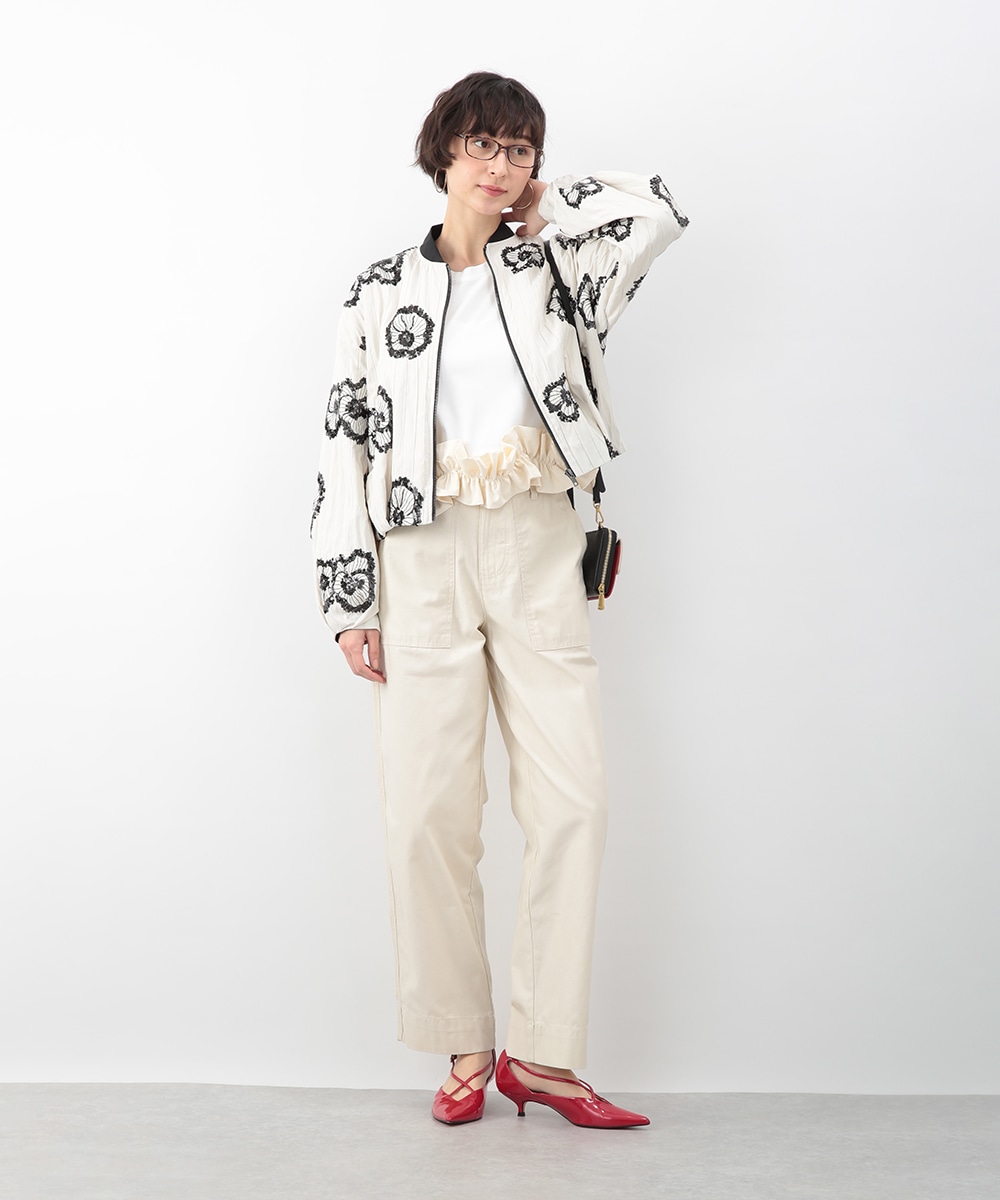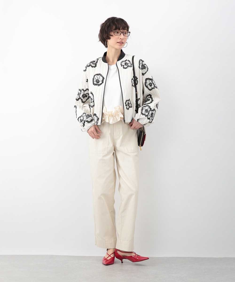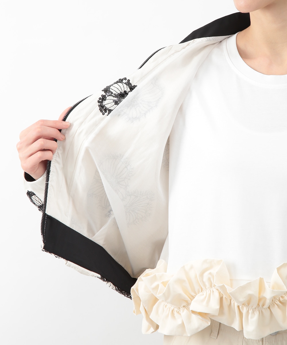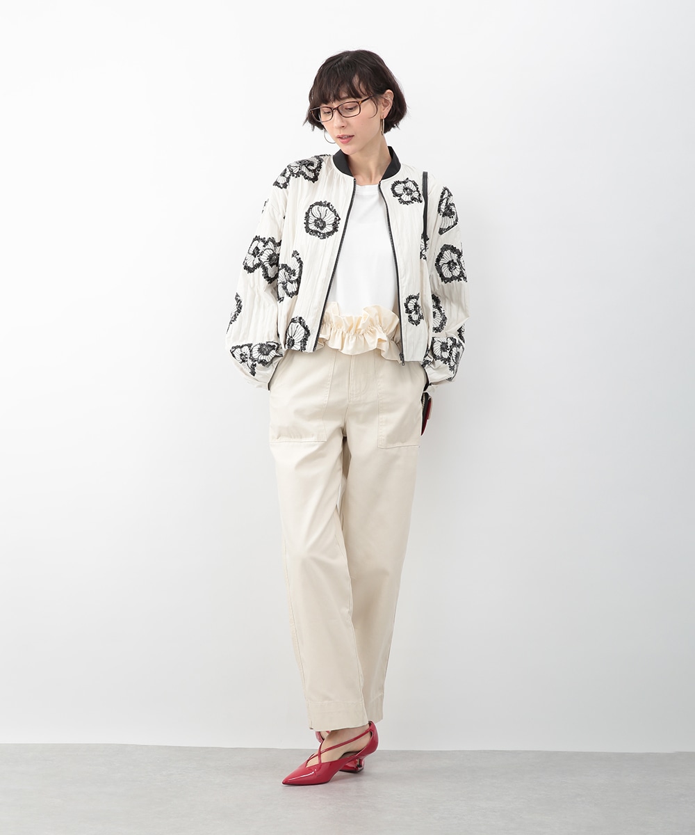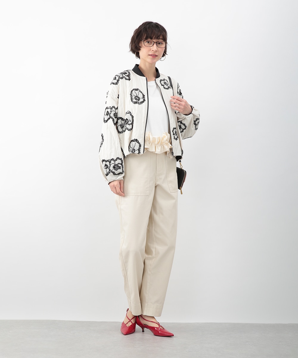 スパンコールで描いたフラワーモチーフが印象的なブルゾン。立体感のあるディテールが、シンプルな装いに華やぎをプラス。モノトーンを基調とした配色で、甘さを抑えたバランスに仕上げています。デニムパンツを穿いてカジュアルに、きれいめボトムを合わせてモードな雰囲気にも取り入れやすい一着です。