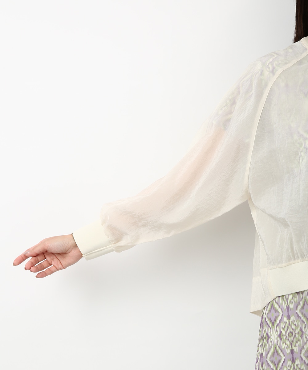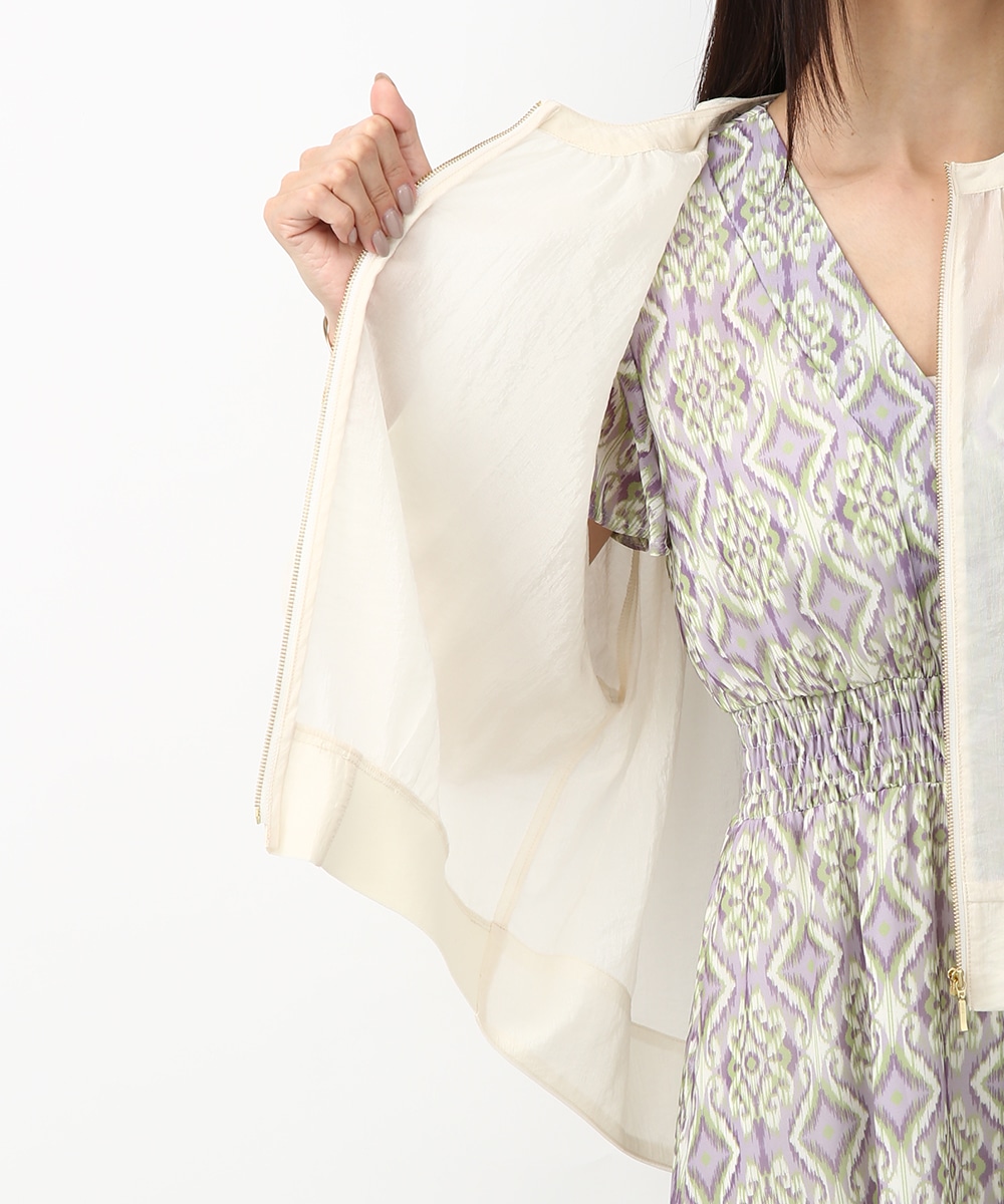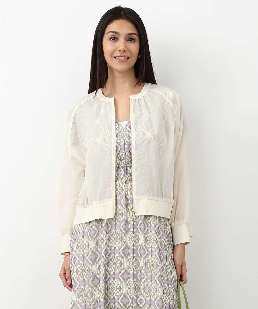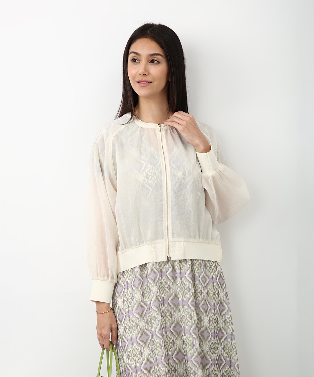 透け感のある軽やかな素材が特徴のシアーブルゾン。羽織るだけでコーディネートに抜け感を加え、季節の変わり目にも取り入れやすい一枚です。ワンピースに合わせればやわらかな印象でまとまり、カットソーとパンツのスタイルに羽織れば軽やかなアクセントに。室内外の温度調整や日差し対策としても活躍するアイテムです。