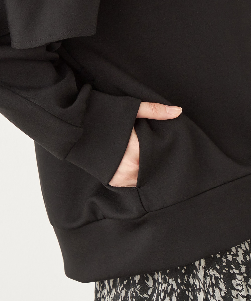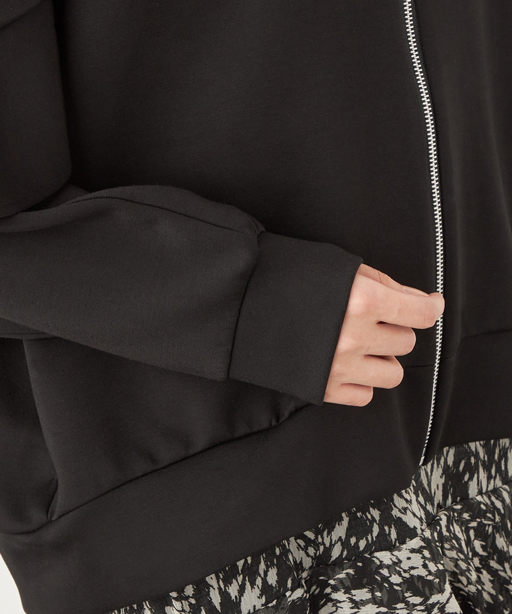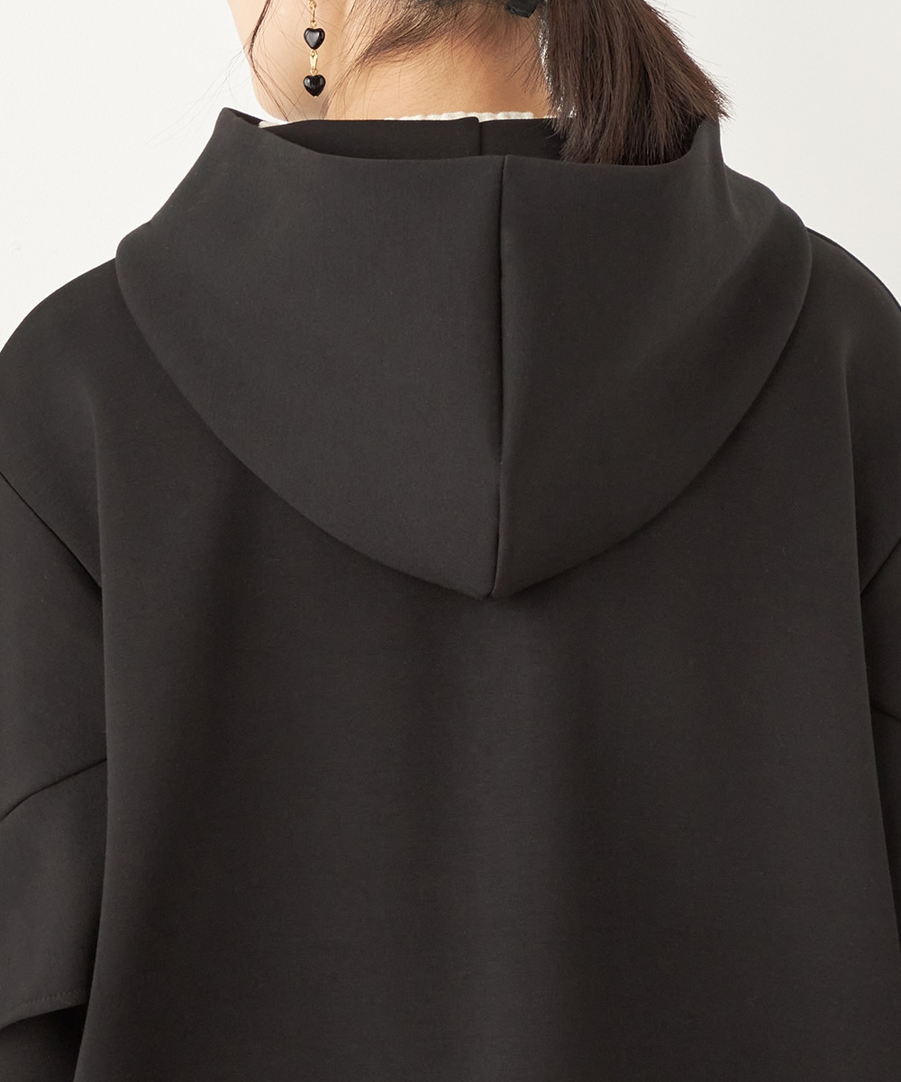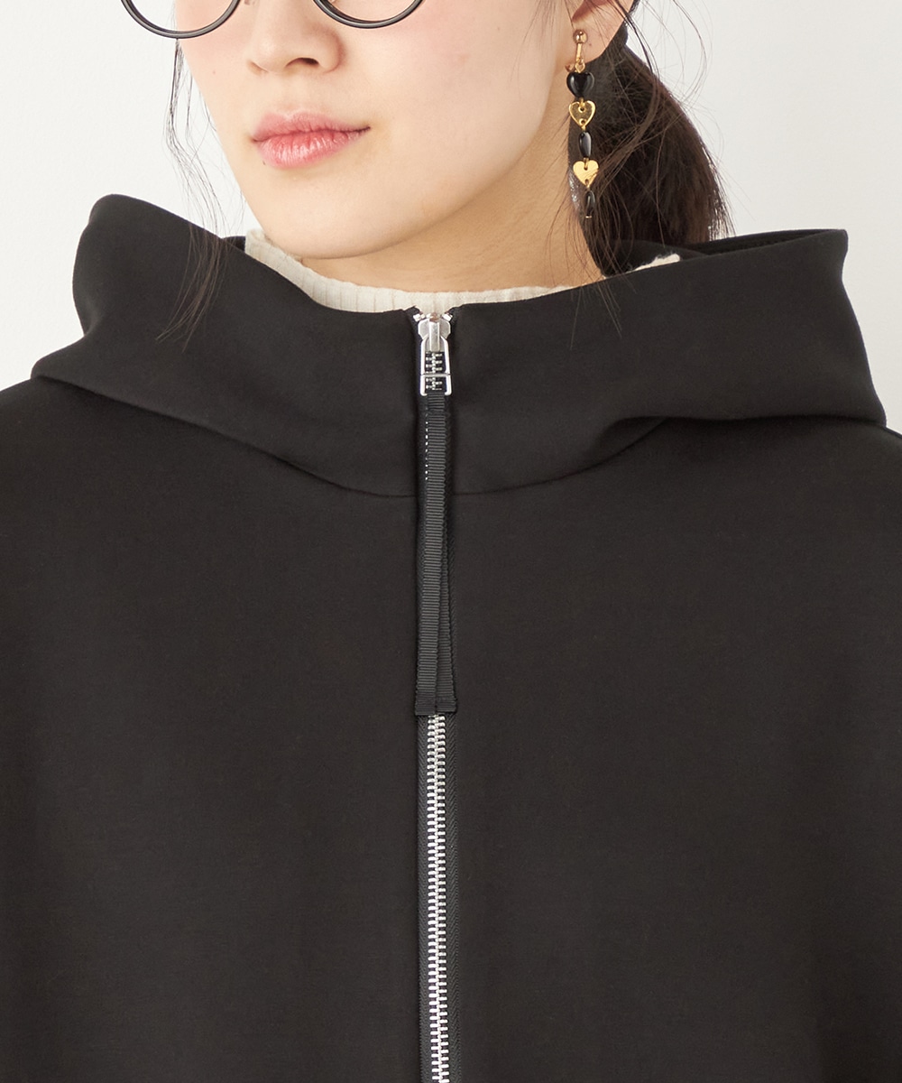 スポーティ感があるフード付きのデザインです。軽くて着心地が優しいダンボール素材を使用しています。適度なハリ感も持ち、シルエットがきれいに出て、上品に着こなせるのも特徴です。真冬にはコートインで、暖かな時季には羽織として活用できます。