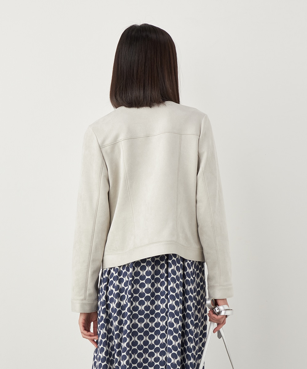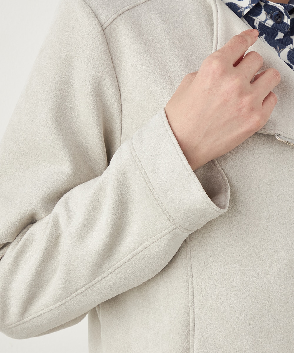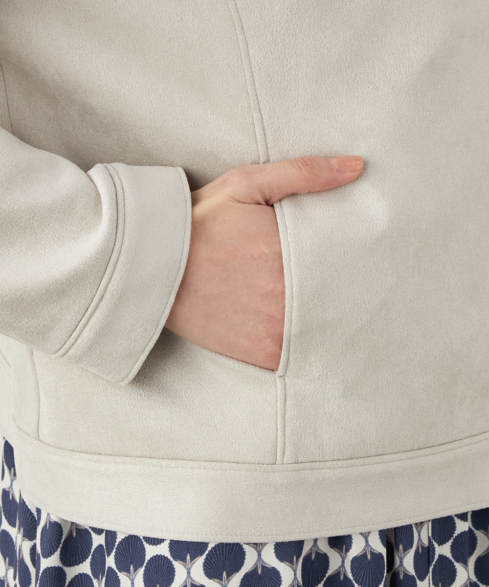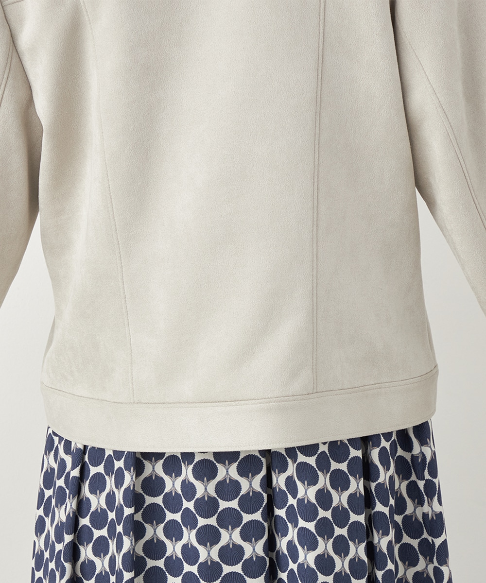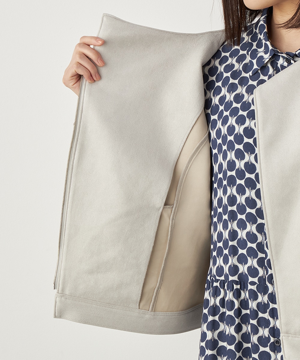 薄手でソフトな風合いのフェイクスウェード素材を使用。カーディガン感覚で羽織れるブルゾン。