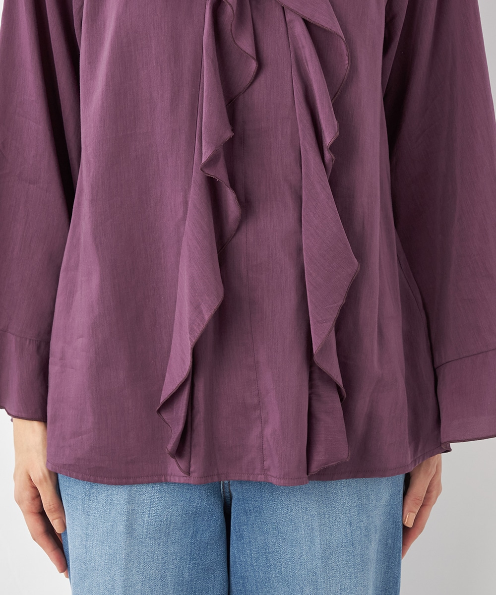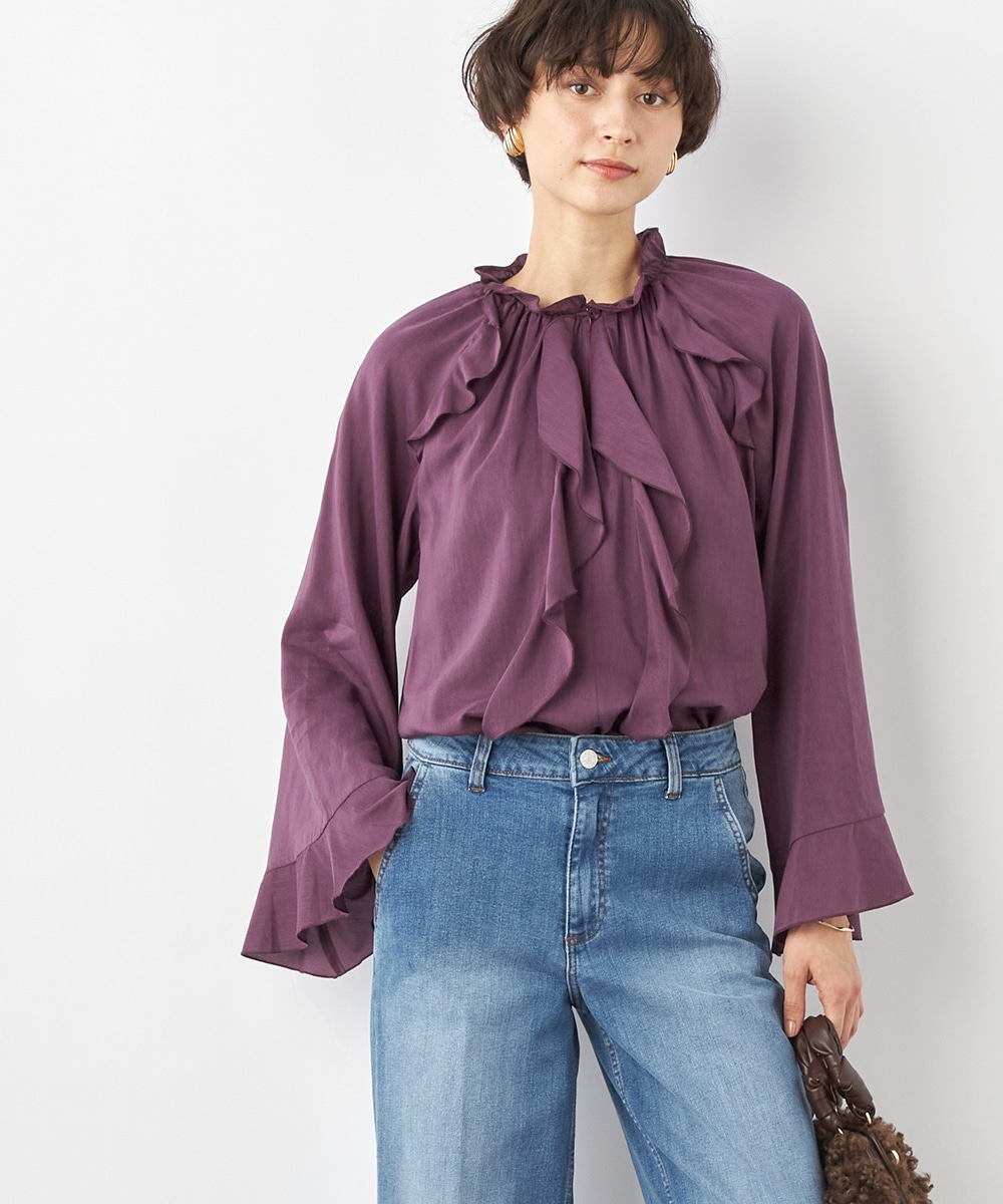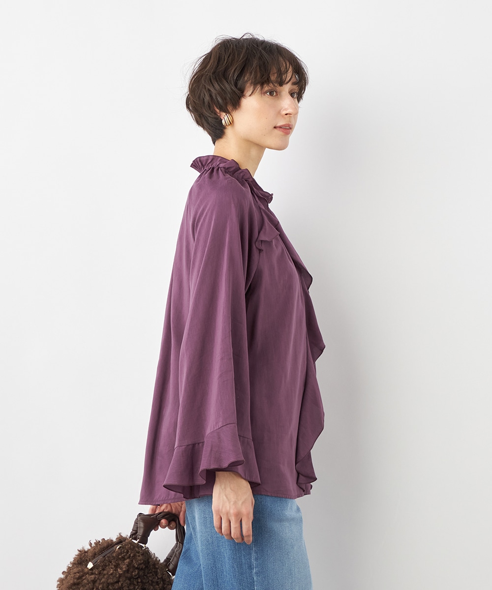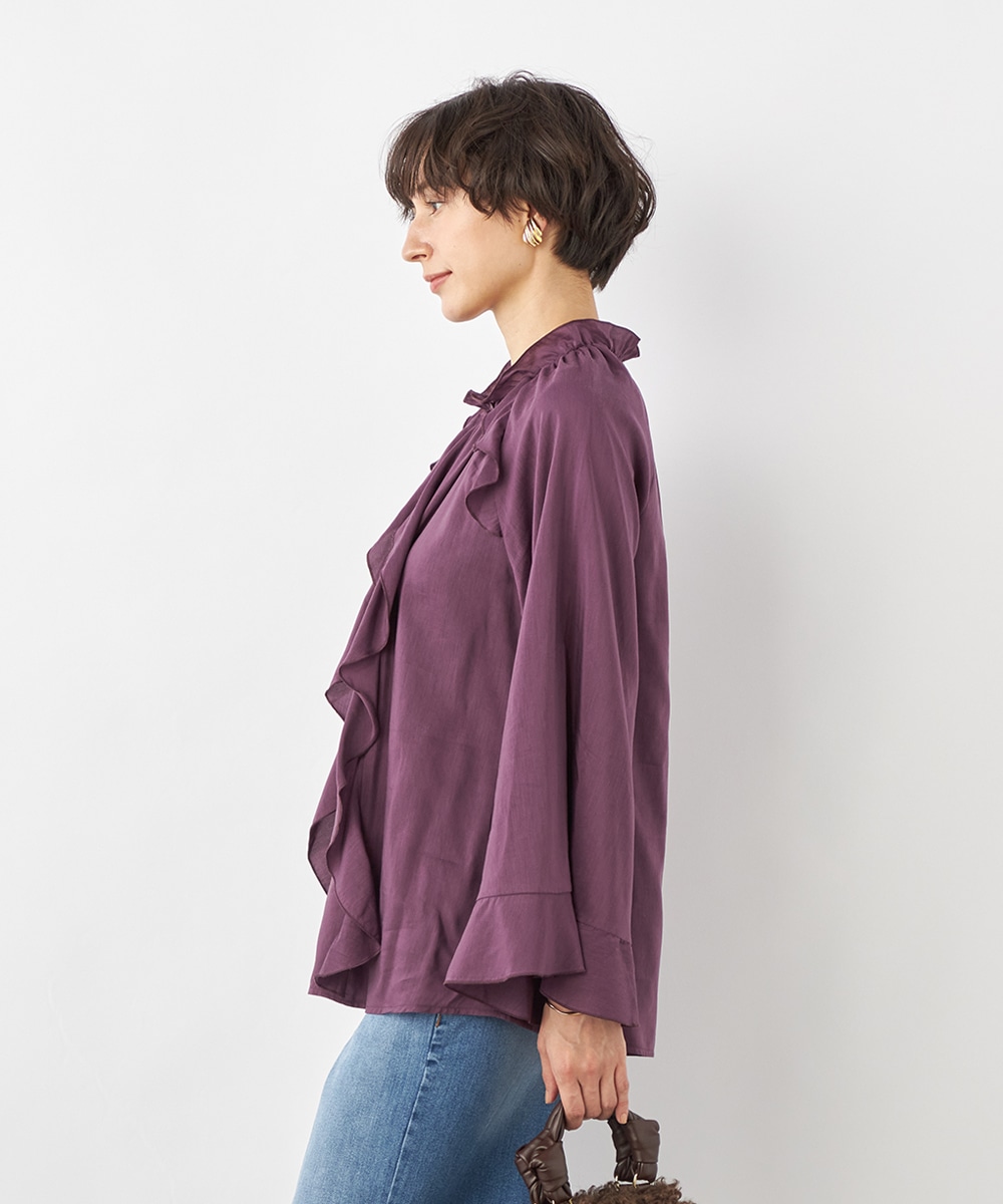 フロントと袖口にあしらったボリューム十分のフリルがポイントです。取り入れやすい単色のデザインながらも華やかに決まり、コーディネートの主役としても活躍します。少しシアーな素材感は上品な印象で、トレンドにもマッチ。ドレープや揺れ感がきれいに出るソフトな風合いです。