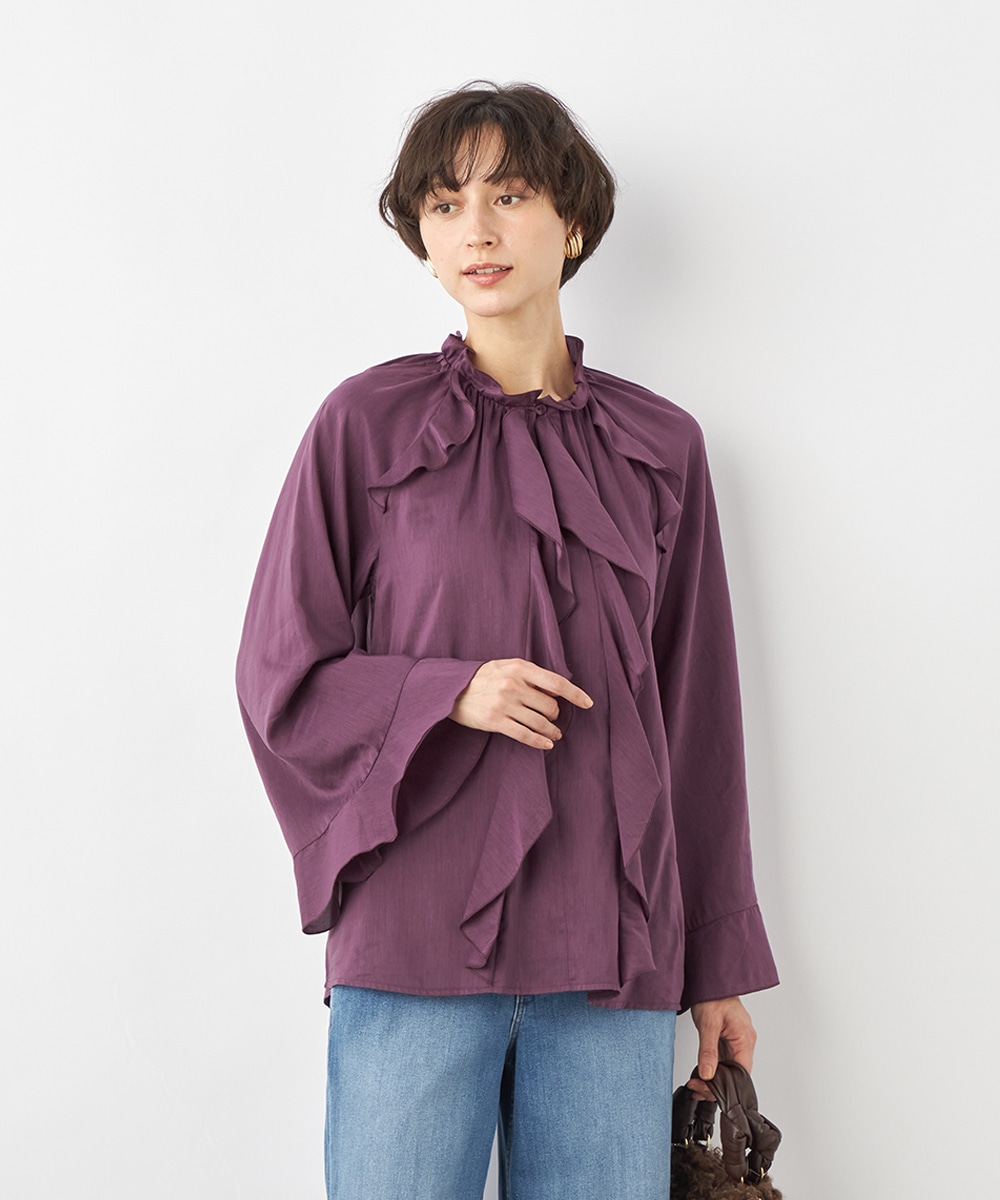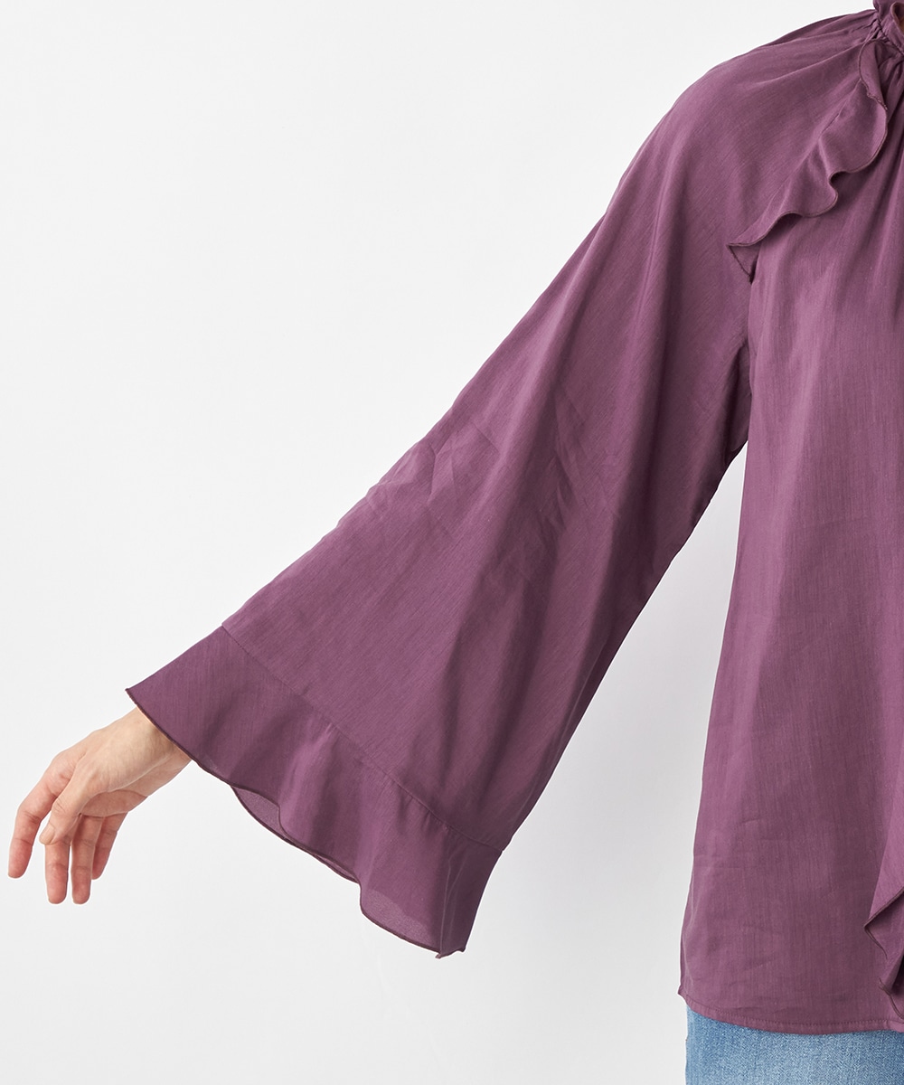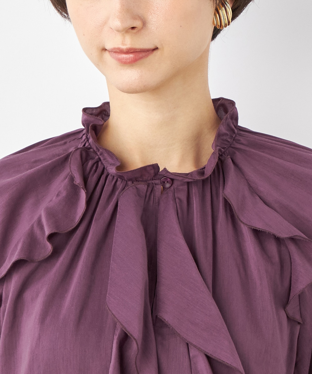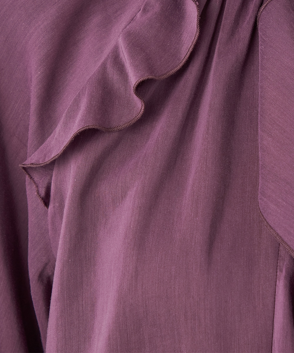 フロントと袖口にあしらったボリューム十分のフリルがポイントです。取り入れやすい単色のデザインながらも華やかに決まり、コーディネートの主役としても活躍します。少しシアーな素材感は上品な印象で、トレンドにもマッチ。ドレープや揺れ感がきれいに出るソフトな風合いです。