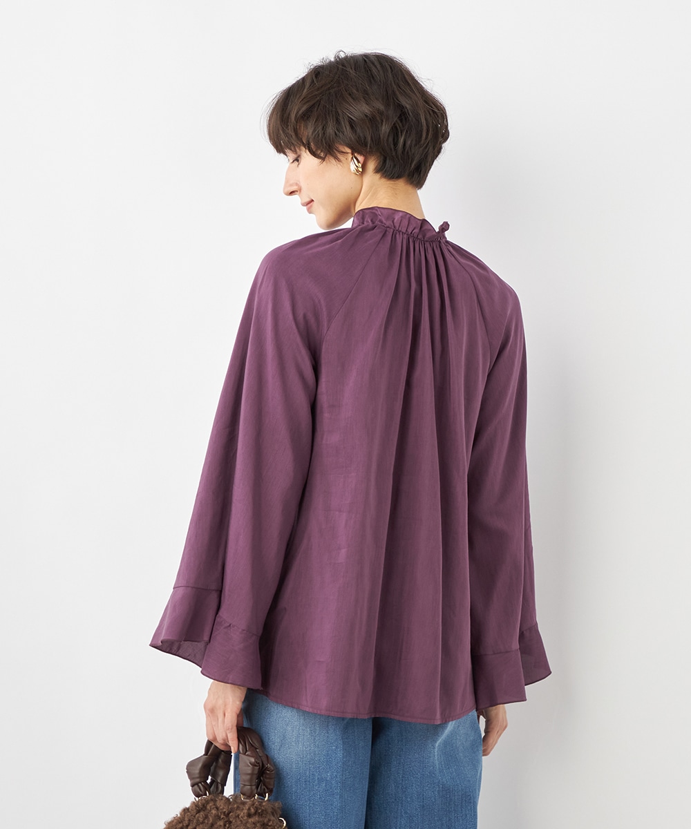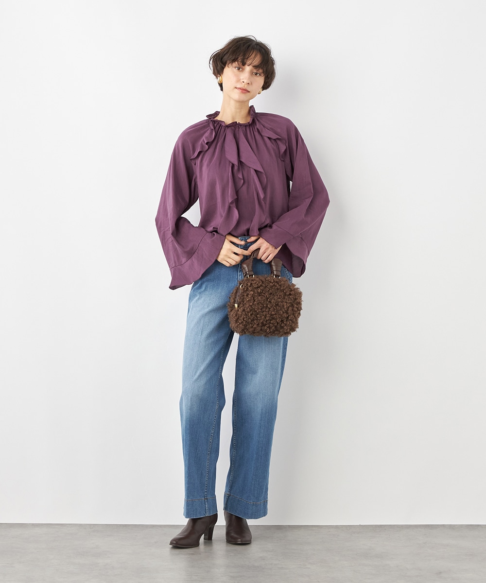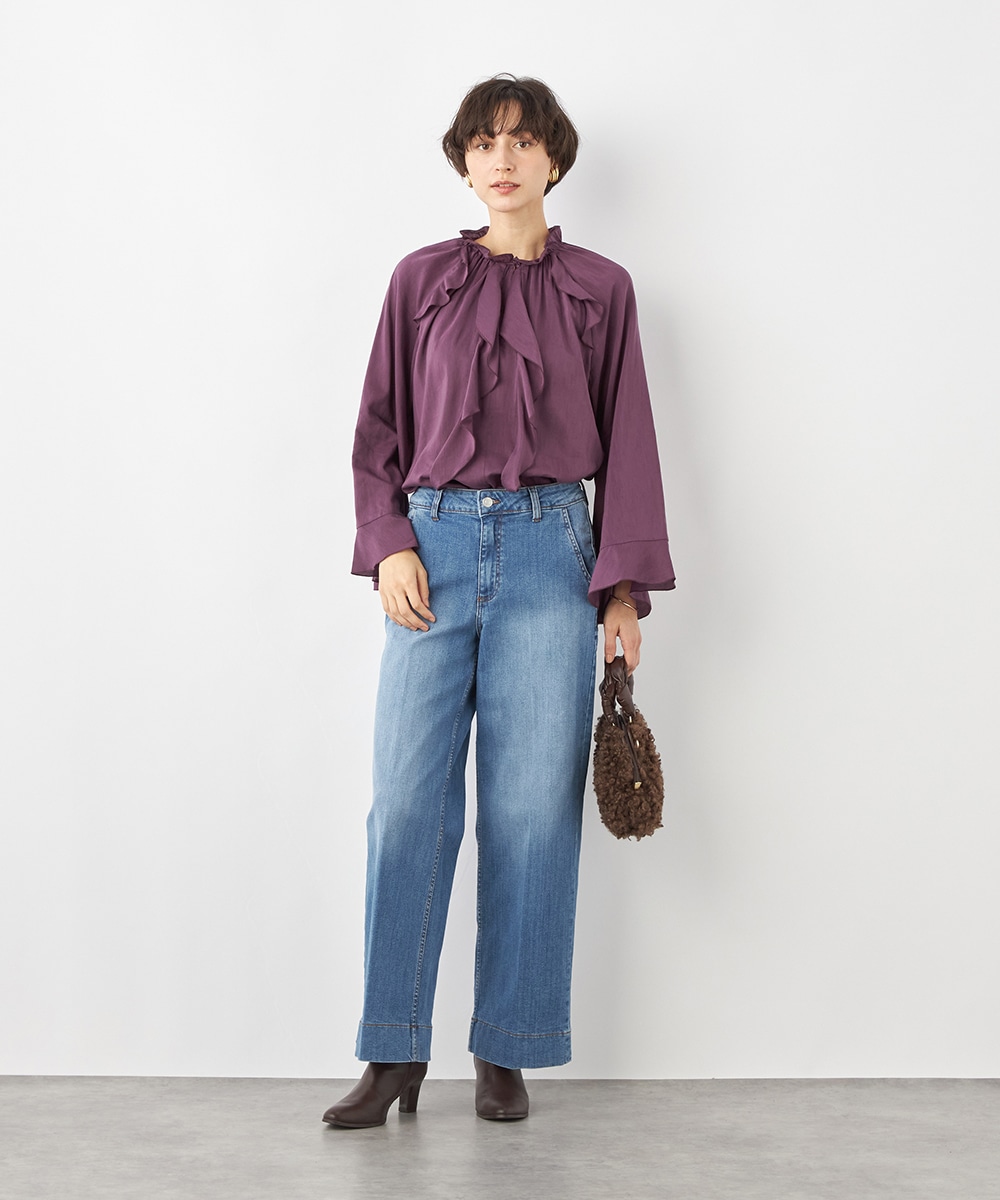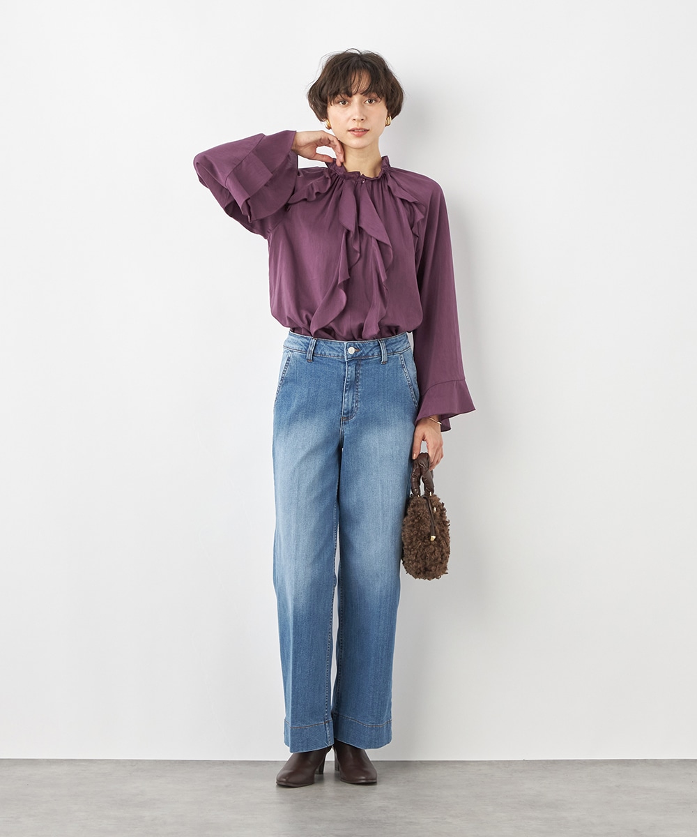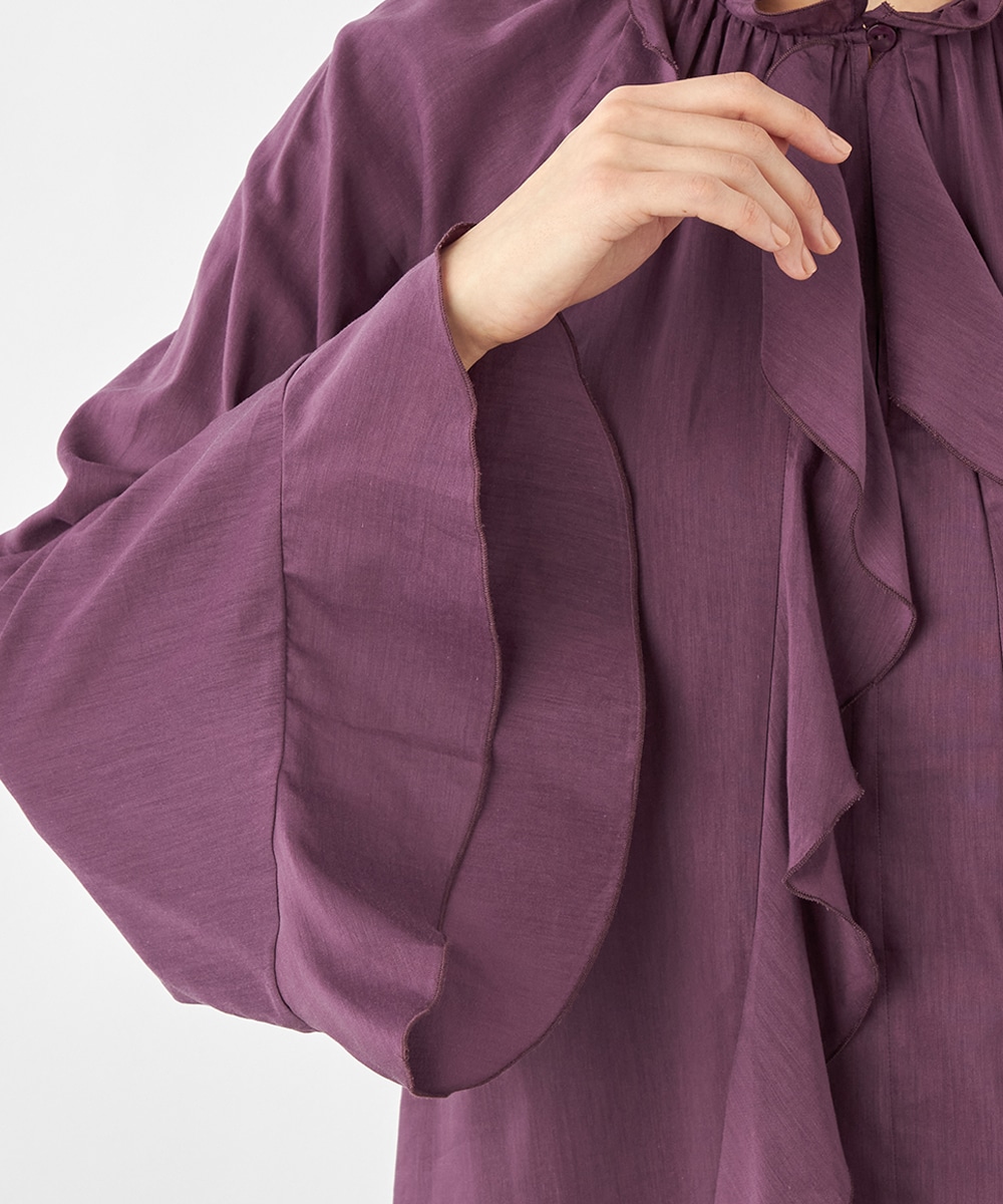 フロントと袖口にあしらったボリューム十分のフリルがポイントです。取り入れやすい単色のデザインながらも華やかに決まり、コーディネートの主役としても活躍します。少しシアーな素材感は上品な印象で、トレンドにもマッチ。ドレープや揺れ感がきれいに出るソフトな風合いです。