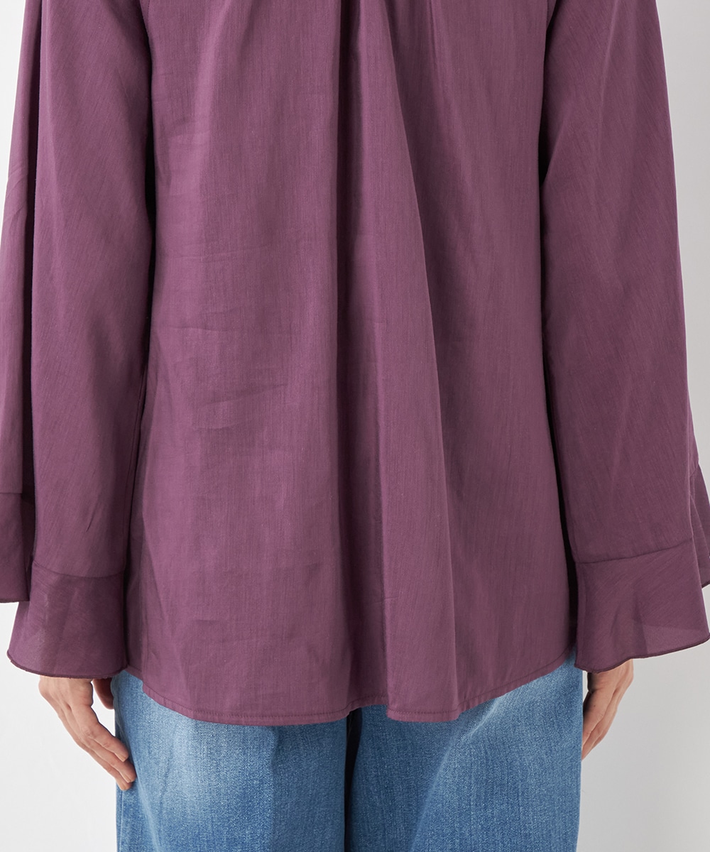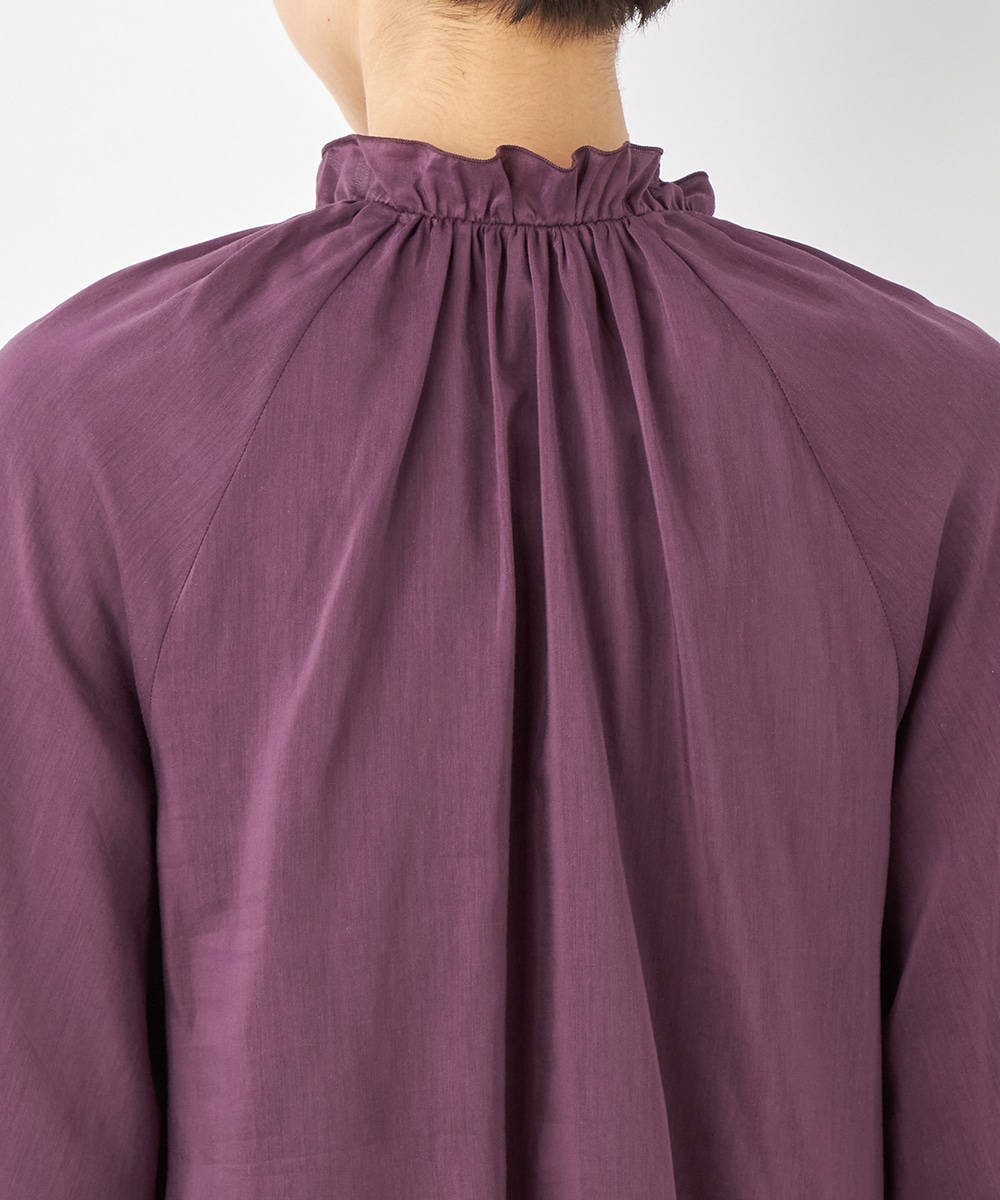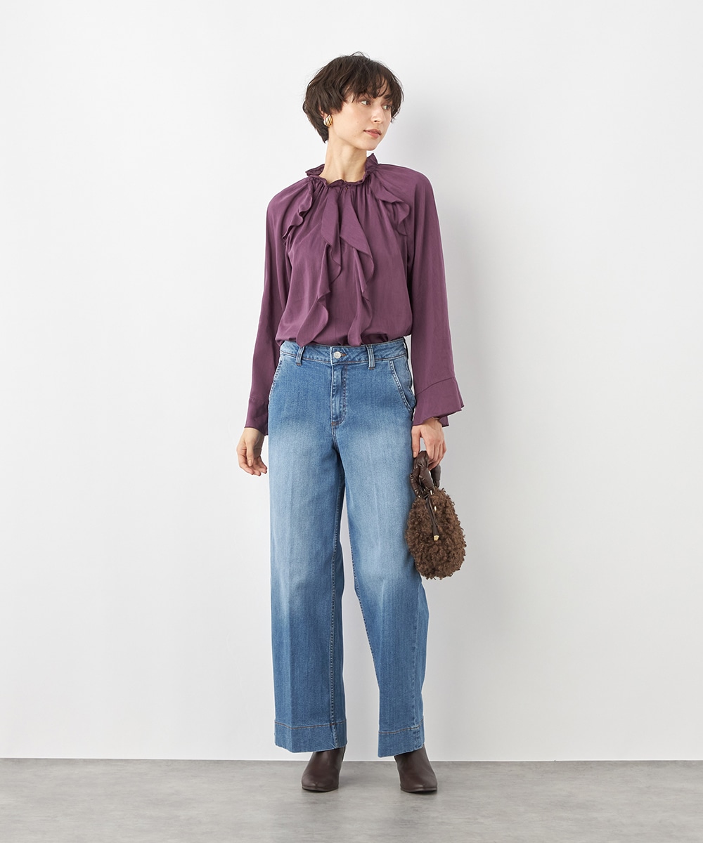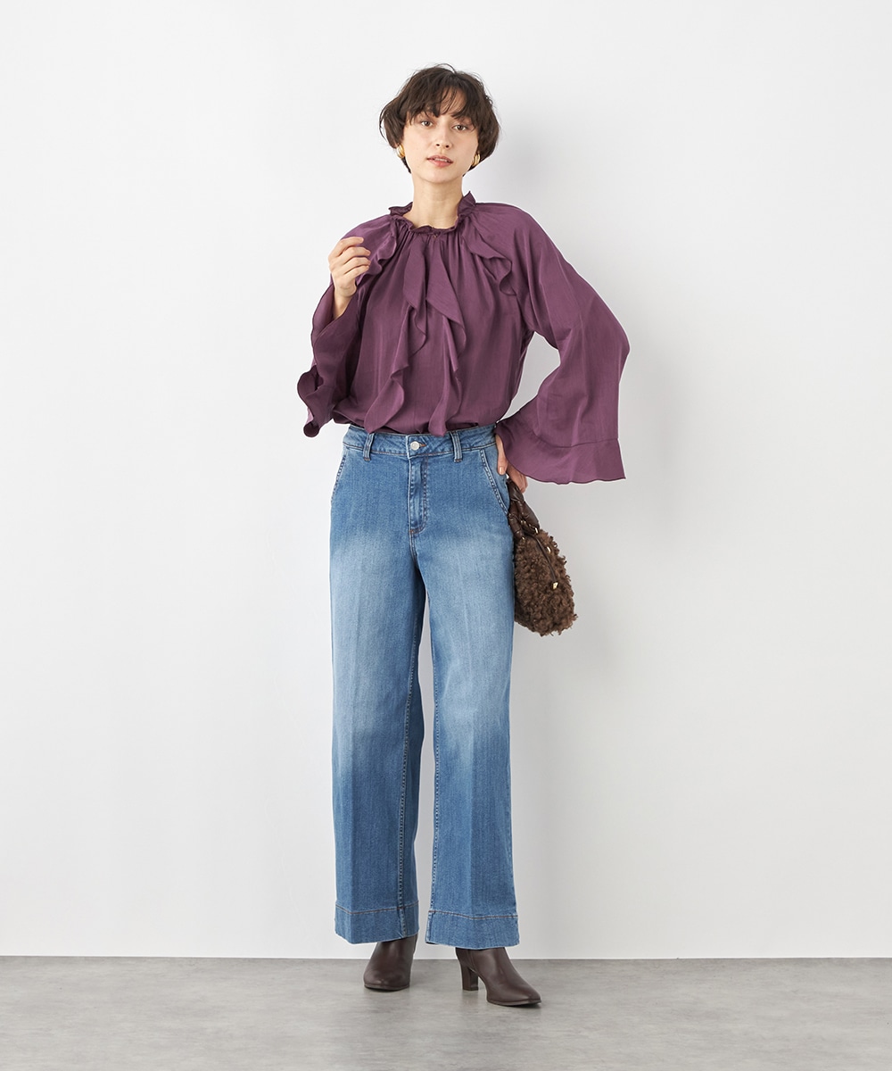 フロントと袖口にあしらったボリューム十分のフリルがポイントです。取り入れやすい単色のデザインながらも華やかに決まり、コーディネートの主役としても活躍します。少しシアーな素材感は上品な印象で、トレンドにもマッチ。ドレープや揺れ感がきれいに出るソフトな風合いです。