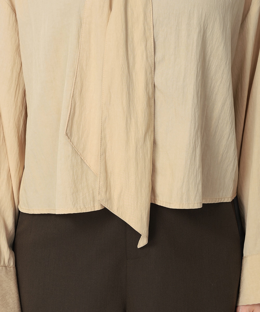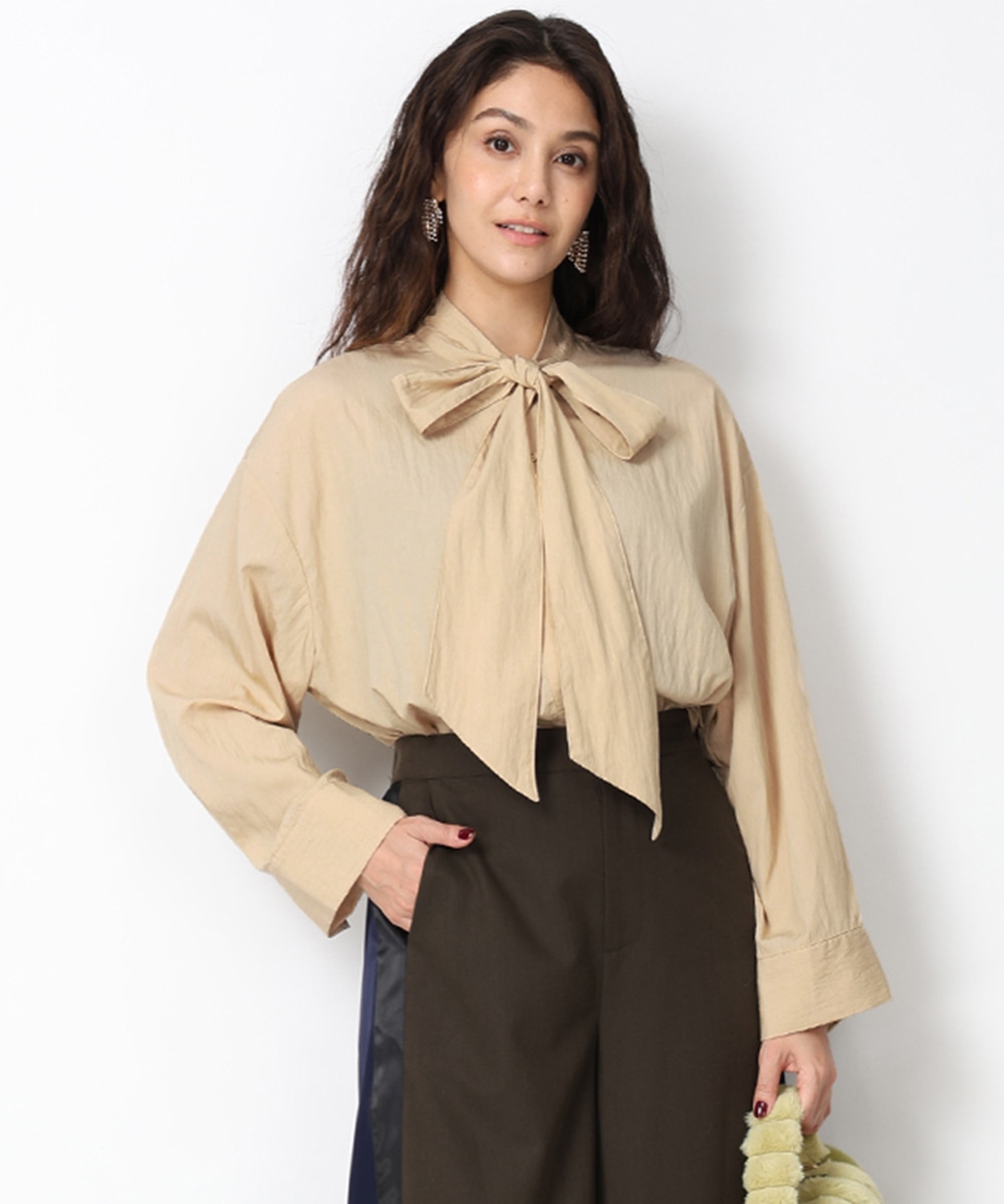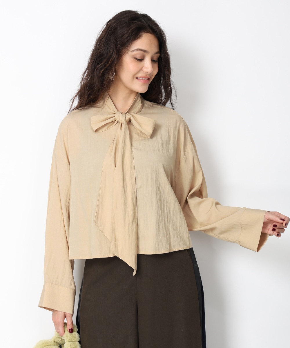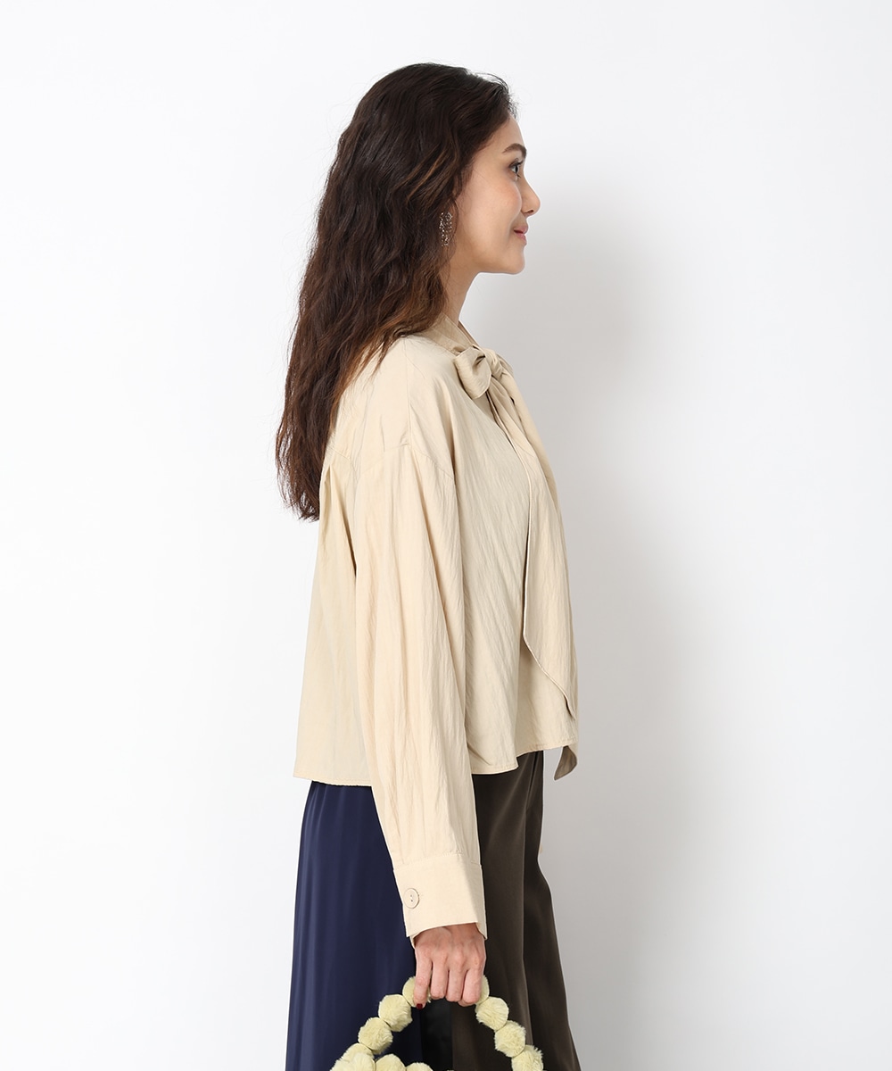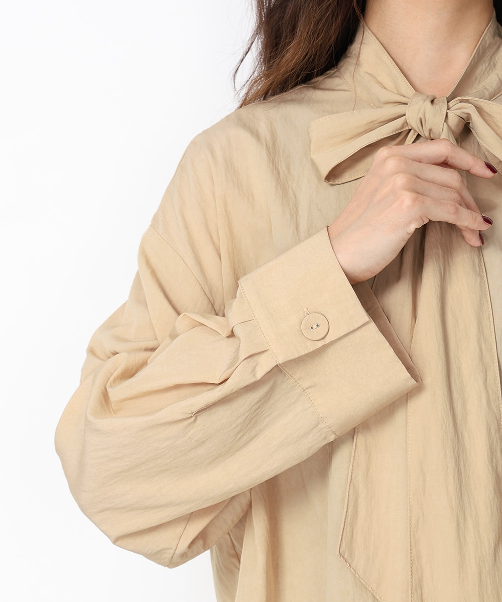 長めのボウタイリボンが胸元にアクセントをプラスし、大人可愛いスタイリングを演出。柔らかな生地感で程よいゆとりがあり、着用しやすいのも嬉しいポイント。共布ボタンを合わせたシンプルさと上品なベージュカラーも魅力です。カジュアルからキレイめな着こなしにと、幅広いコーディネートにも活躍してくれる1枚です。