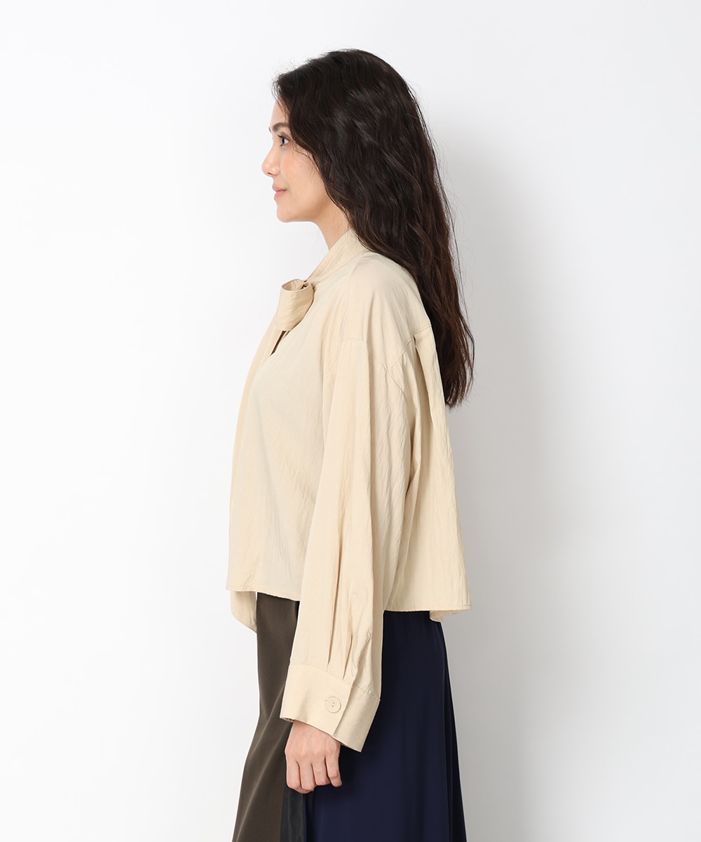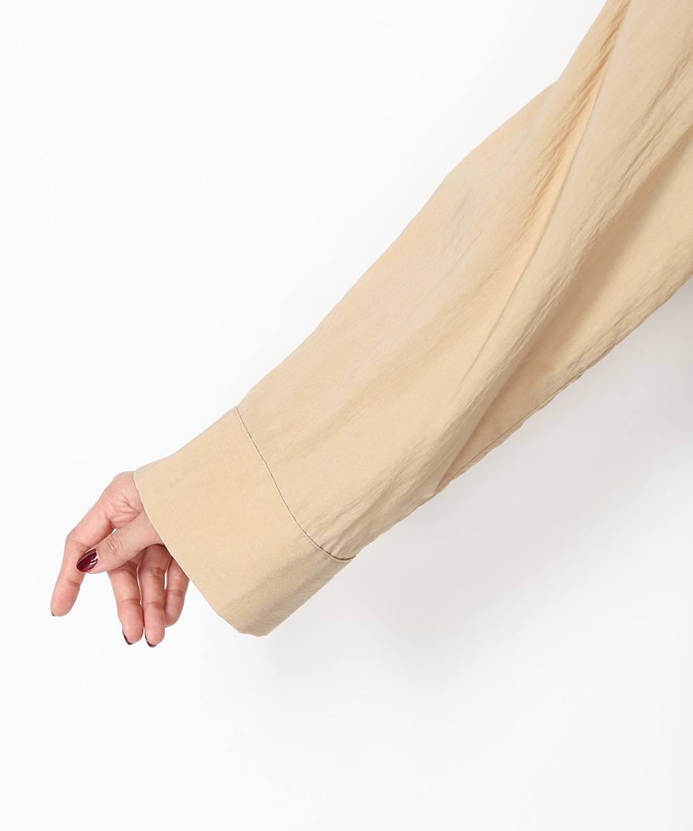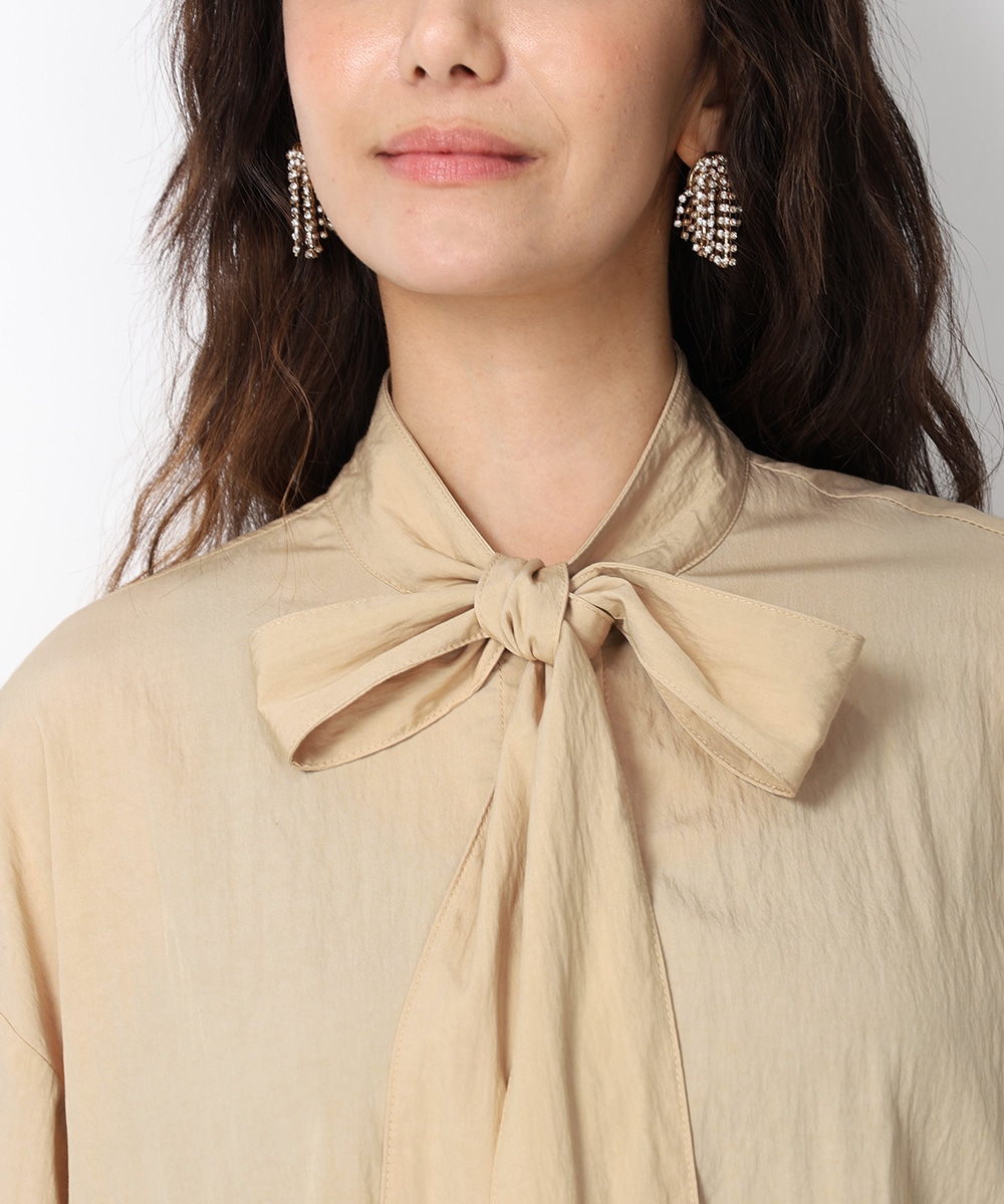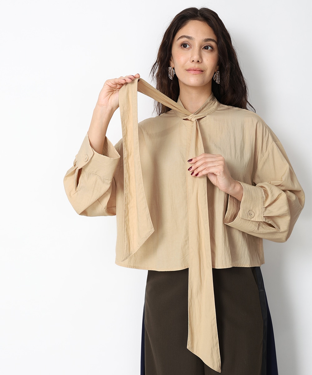 長めのボウタイリボンが胸元にアクセントをプラスし、大人可愛いスタイリングを演出。柔らかな生地感で程よいゆとりがあり、着用しやすいのも嬉しいポイント。共布ボタンを合わせたシンプルさと上品なベージュカラーも魅力です。カジュアルからキレイめな着こなしにと、幅広いコーディネートにも活躍してくれる1枚です。