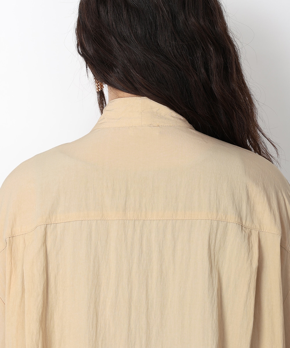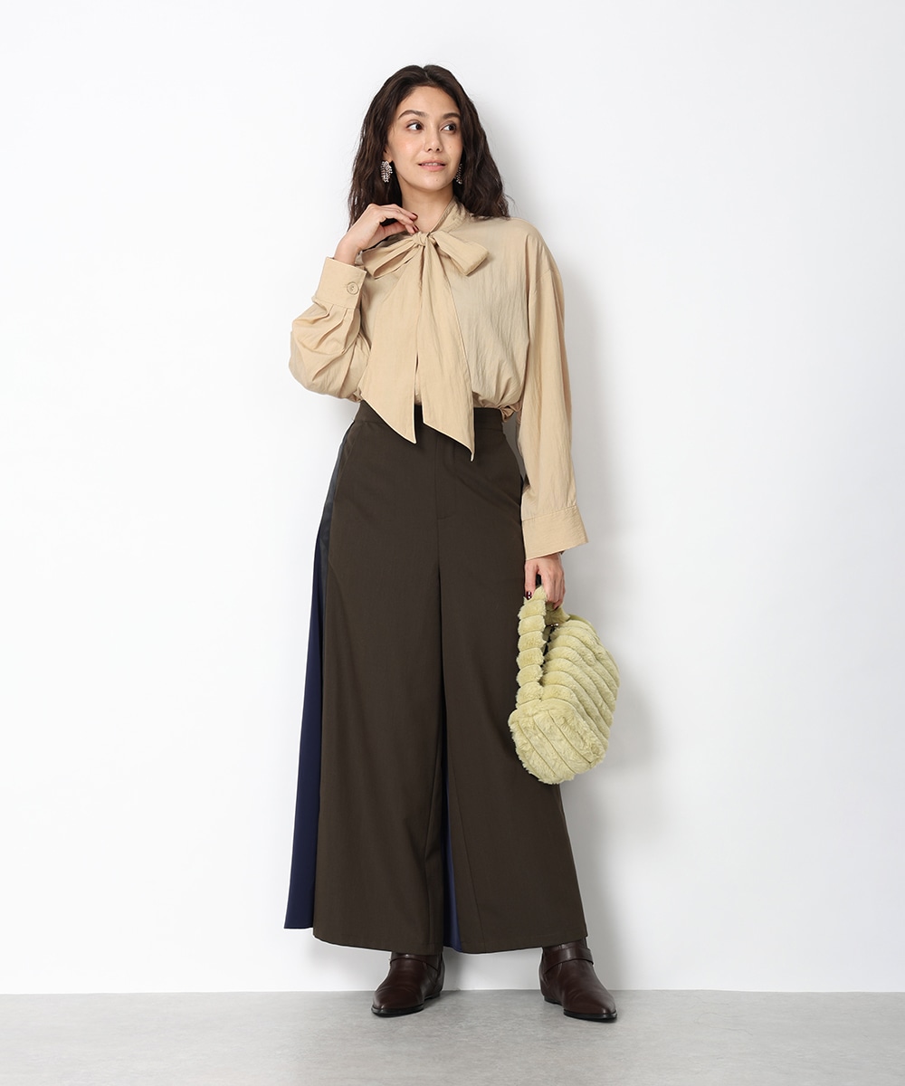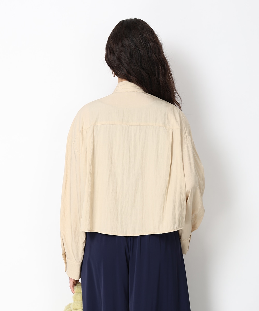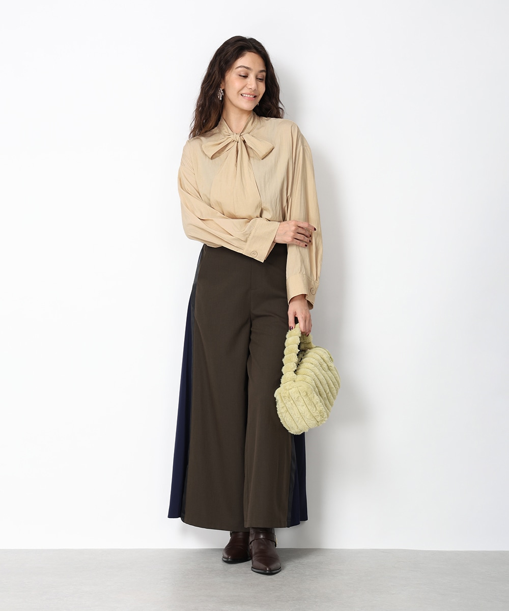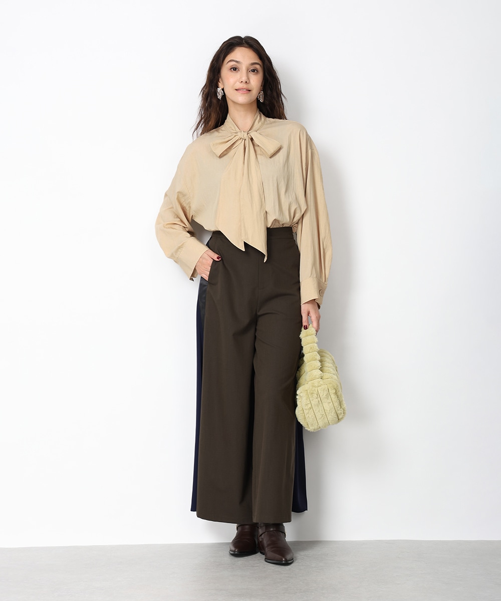 長めのボウタイリボンが胸元にアクセントをプラスし、大人可愛いスタイリングを演出。柔らかな生地感で程よいゆとりがあり、着用しやすいのも嬉しいポイント。共布ボタンを合わせたシンプルさと上品なベージュカラーも魅力です。カジュアルからキレイめな着こなしにと、幅広いコーディネートにも活躍してくれる1枚です。