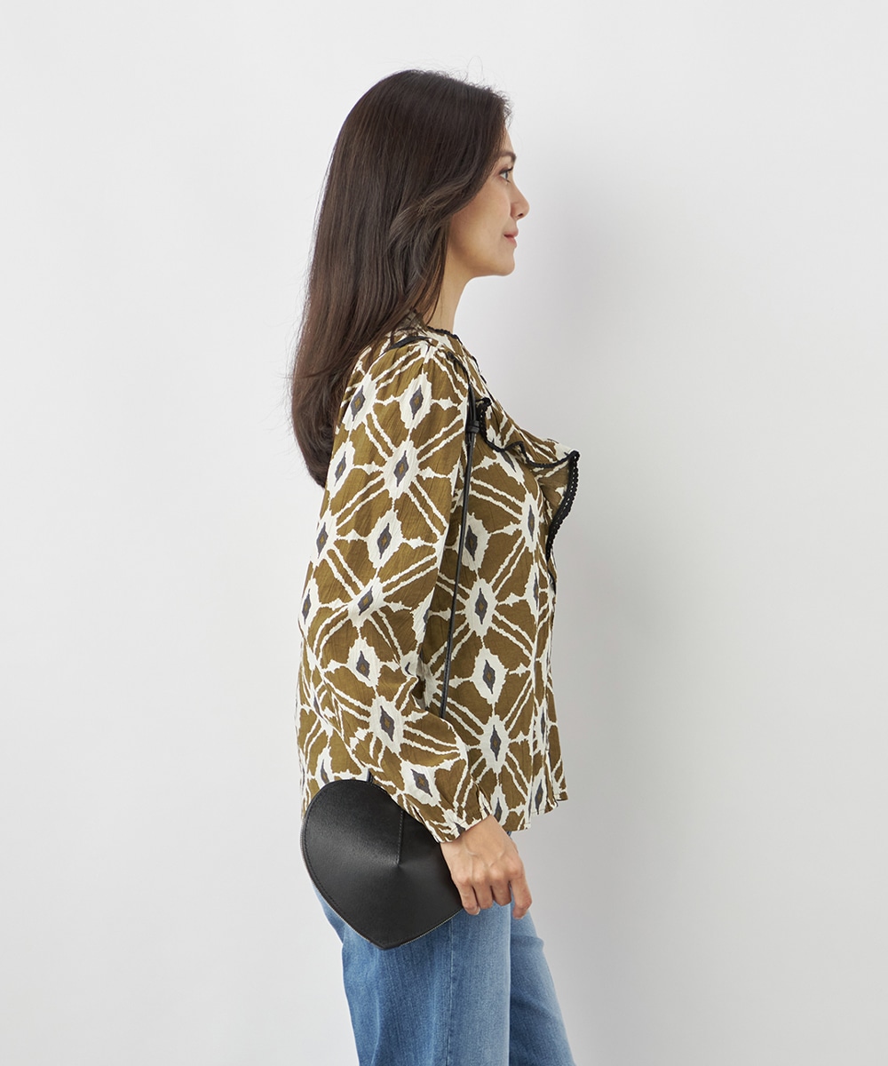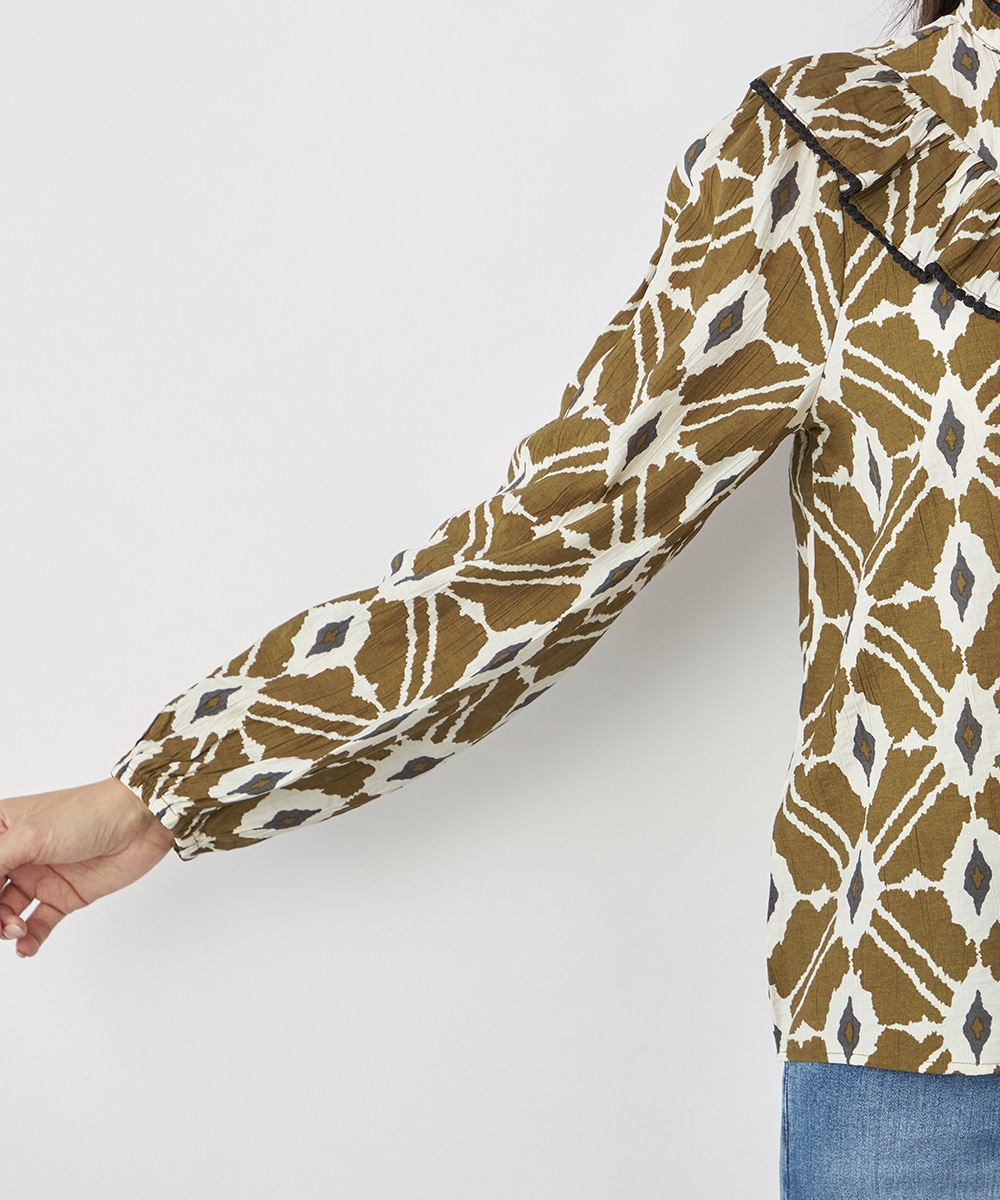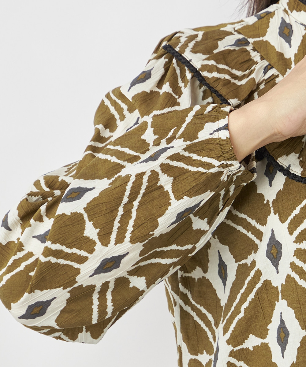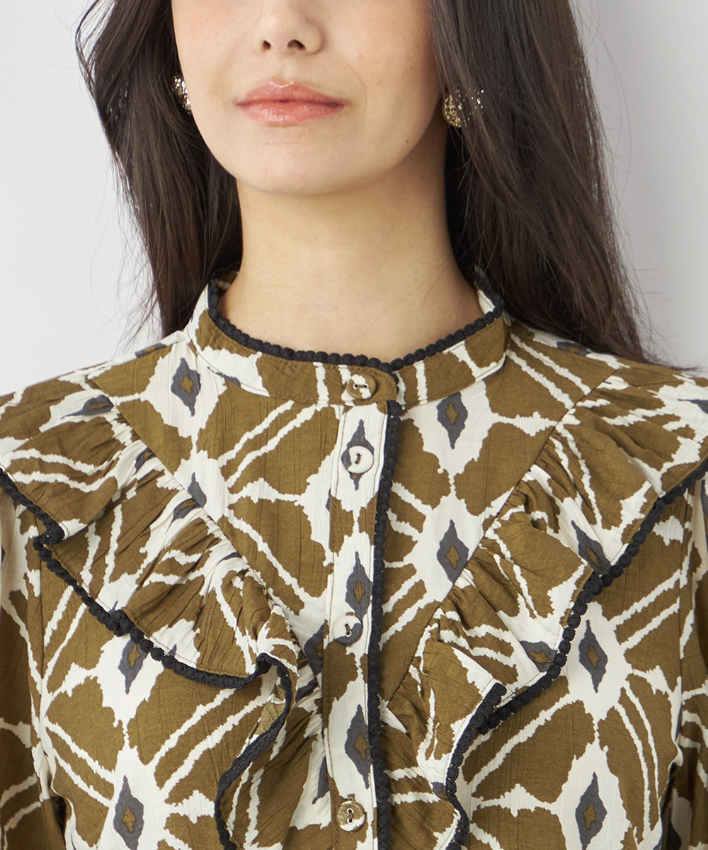 プチパフスリーブやレース使いのプチスタンドネックなど、大人可愛いディテールもポイント。胸元にはフリルをV字型にあしらって華やかさを出しています。同素材のくるみボタンを取り入れており、細かな部分にまでこだわりを感じる贅沢な仕上がり。袖口はゴム仕様です。