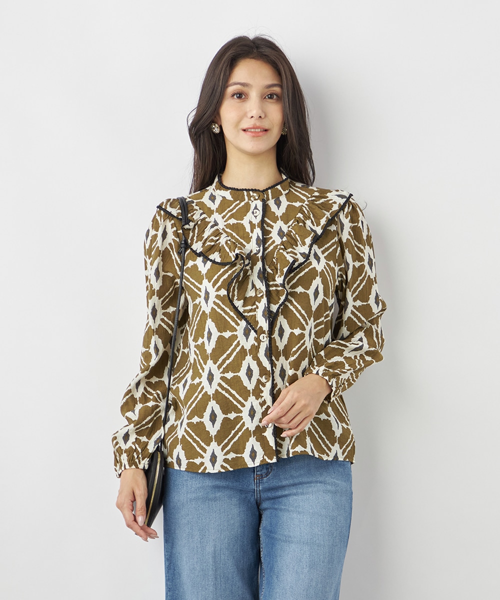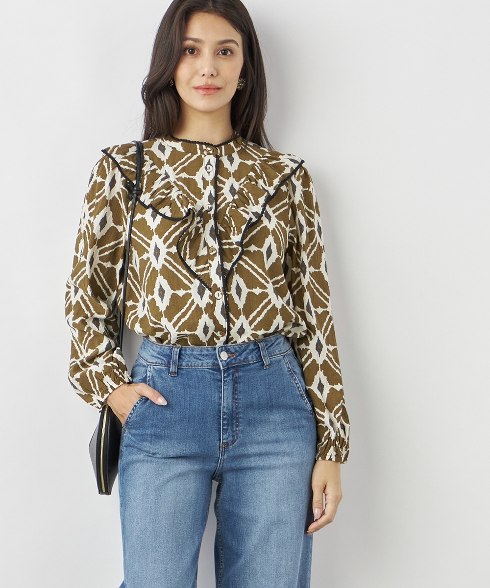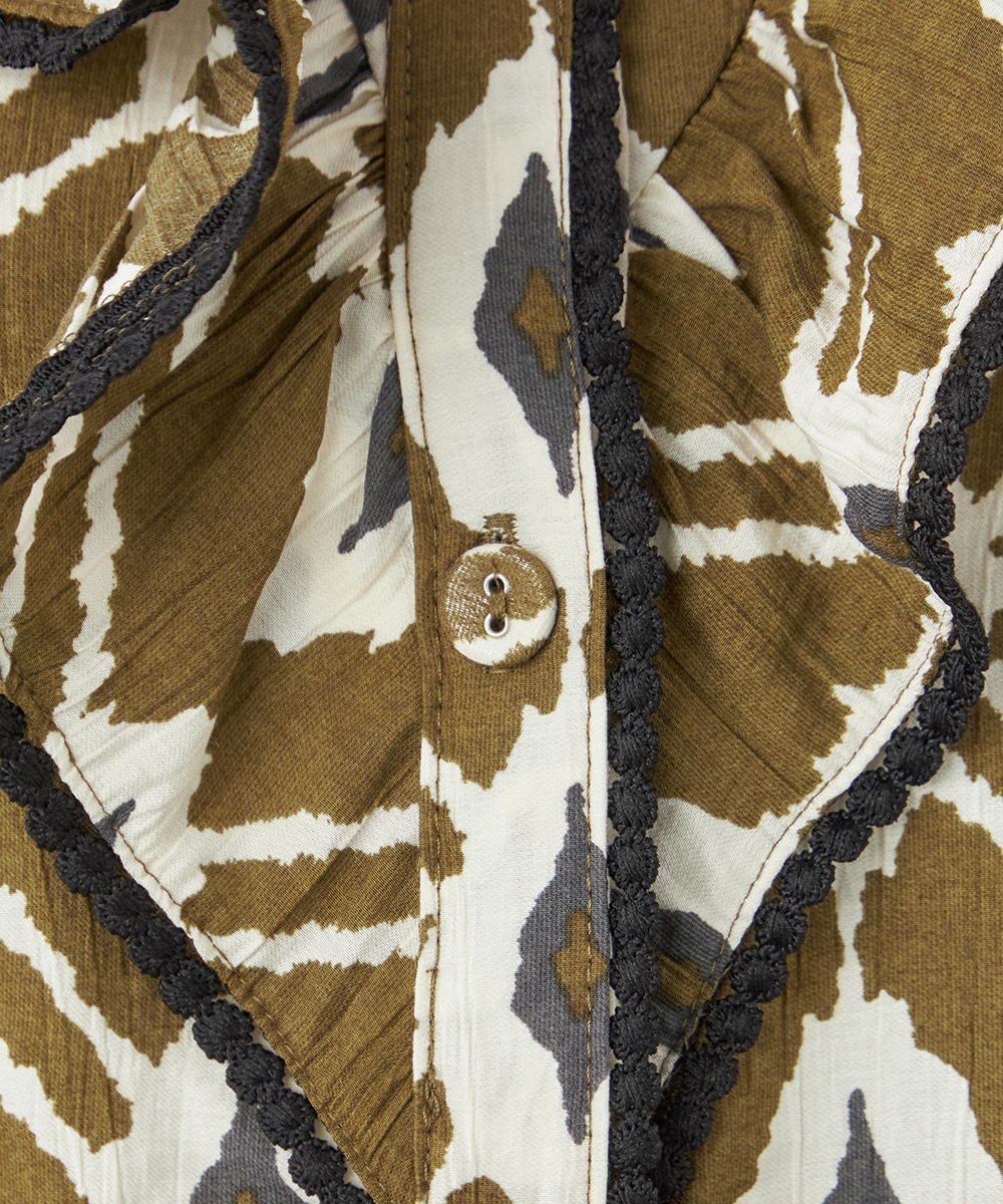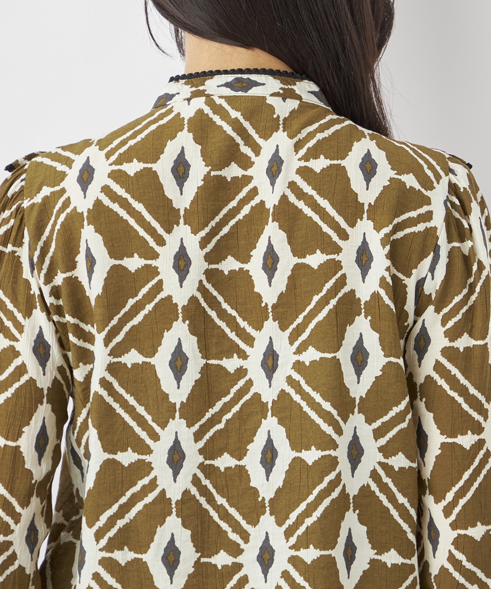 プチパフスリーブやレース使いのプチスタンドネックなど、大人可愛いディテールもポイント。胸元にはフリルをV字型にあしらって華やかさを出しています。同素材のくるみボタンを取り入れており、細かな部分にまでこだわりを感じる贅沢な仕上がり。袖口はゴム仕様です。