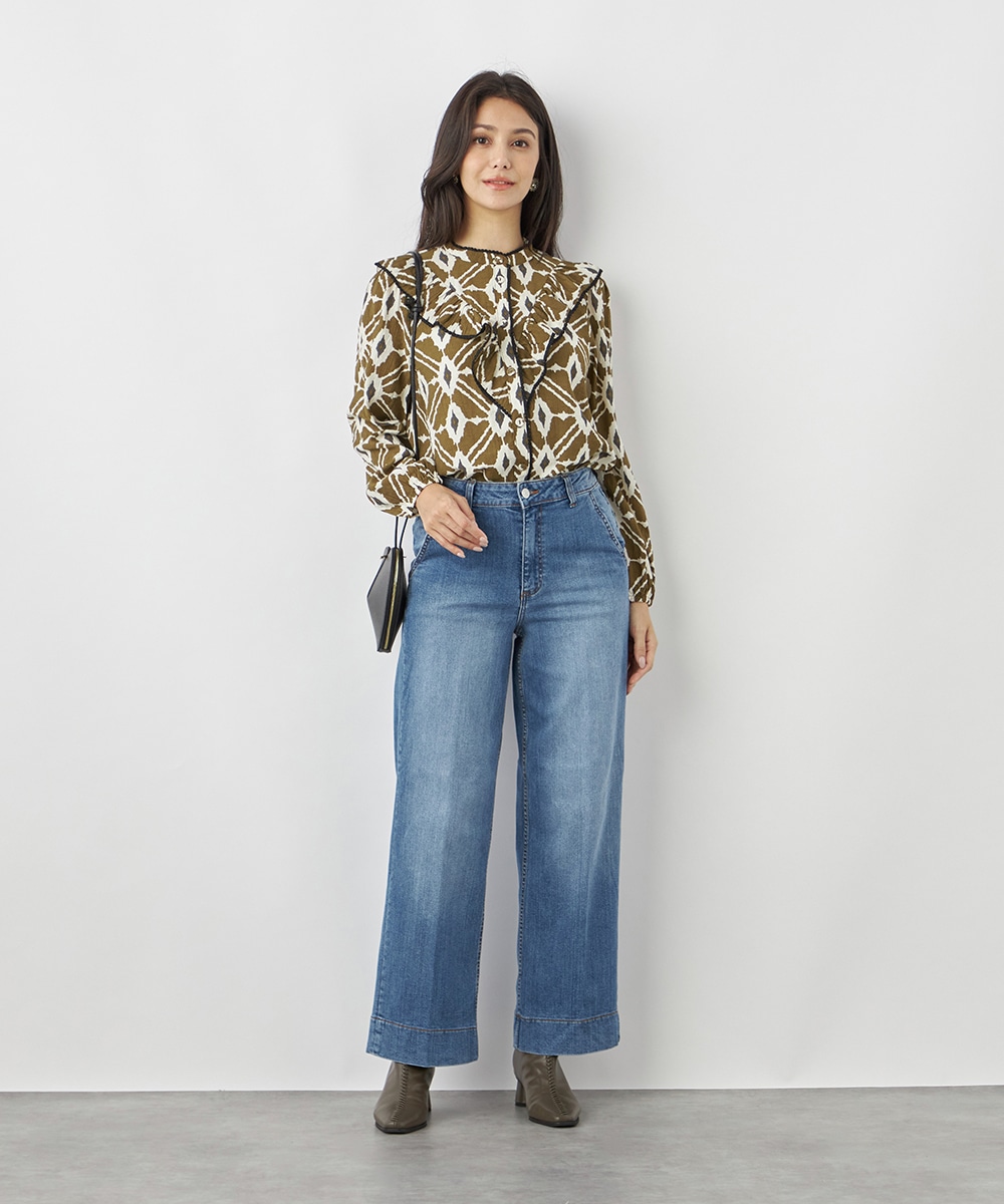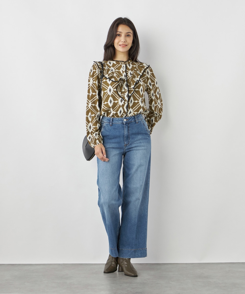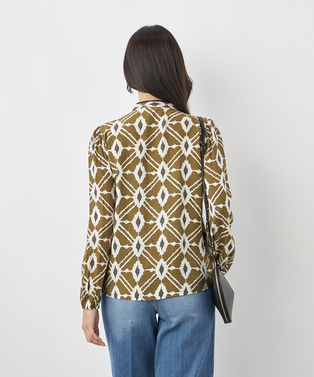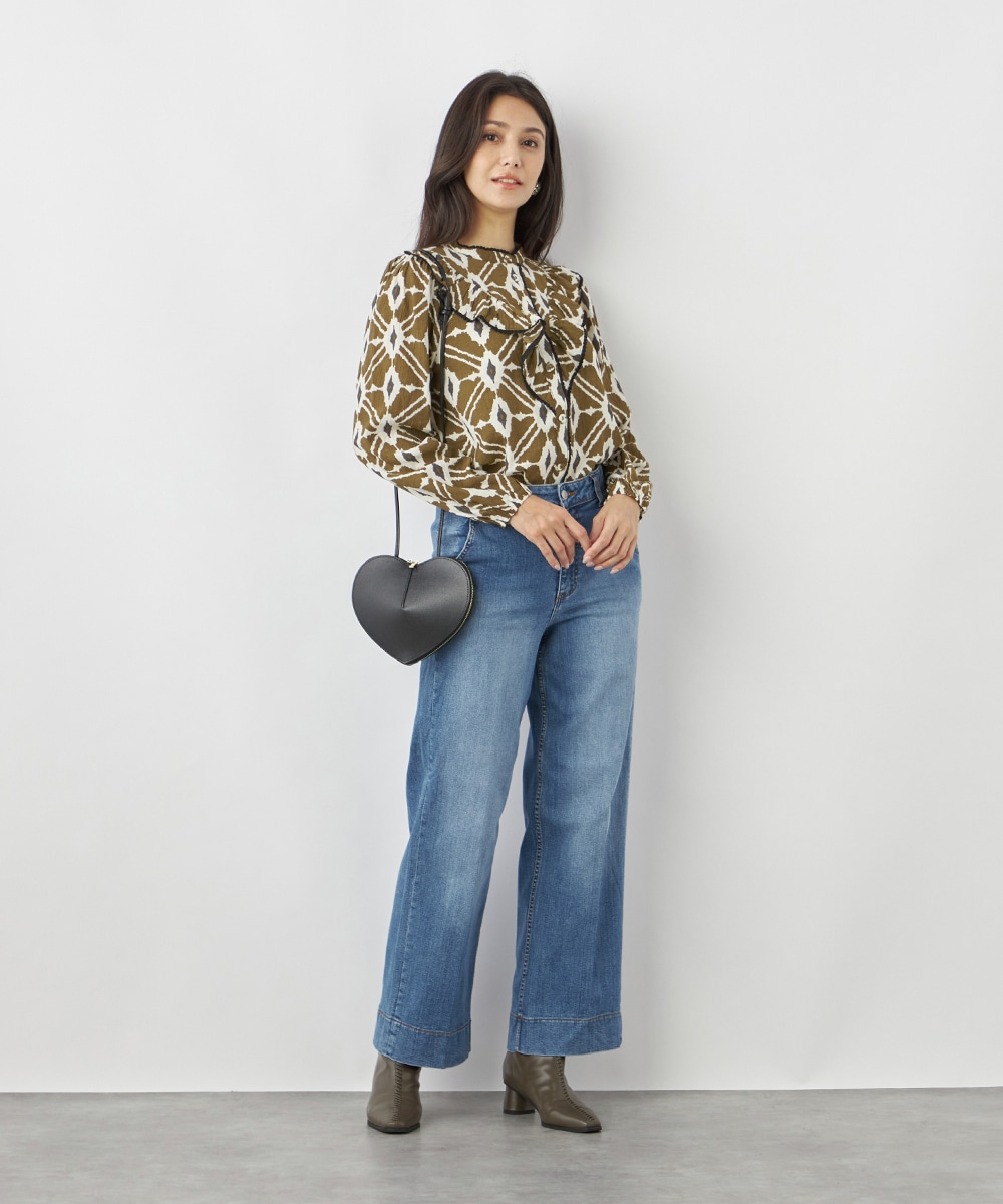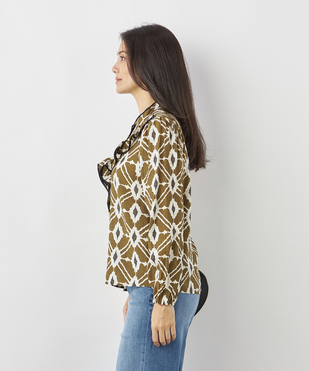 プチパフスリーブやレース使いのプチスタンドネックなど、大人可愛いディテールもポイント。胸元にはフリルをV字型にあしらって華やかさを出しています。同素材のくるみボタンを取り入れており、細かな部分にまでこだわりを感じる贅沢な仕上がり。袖口はゴム仕様です。