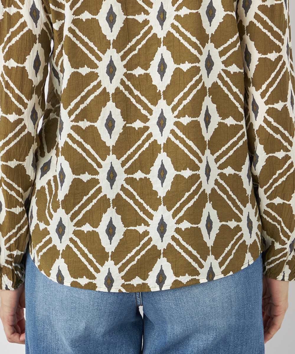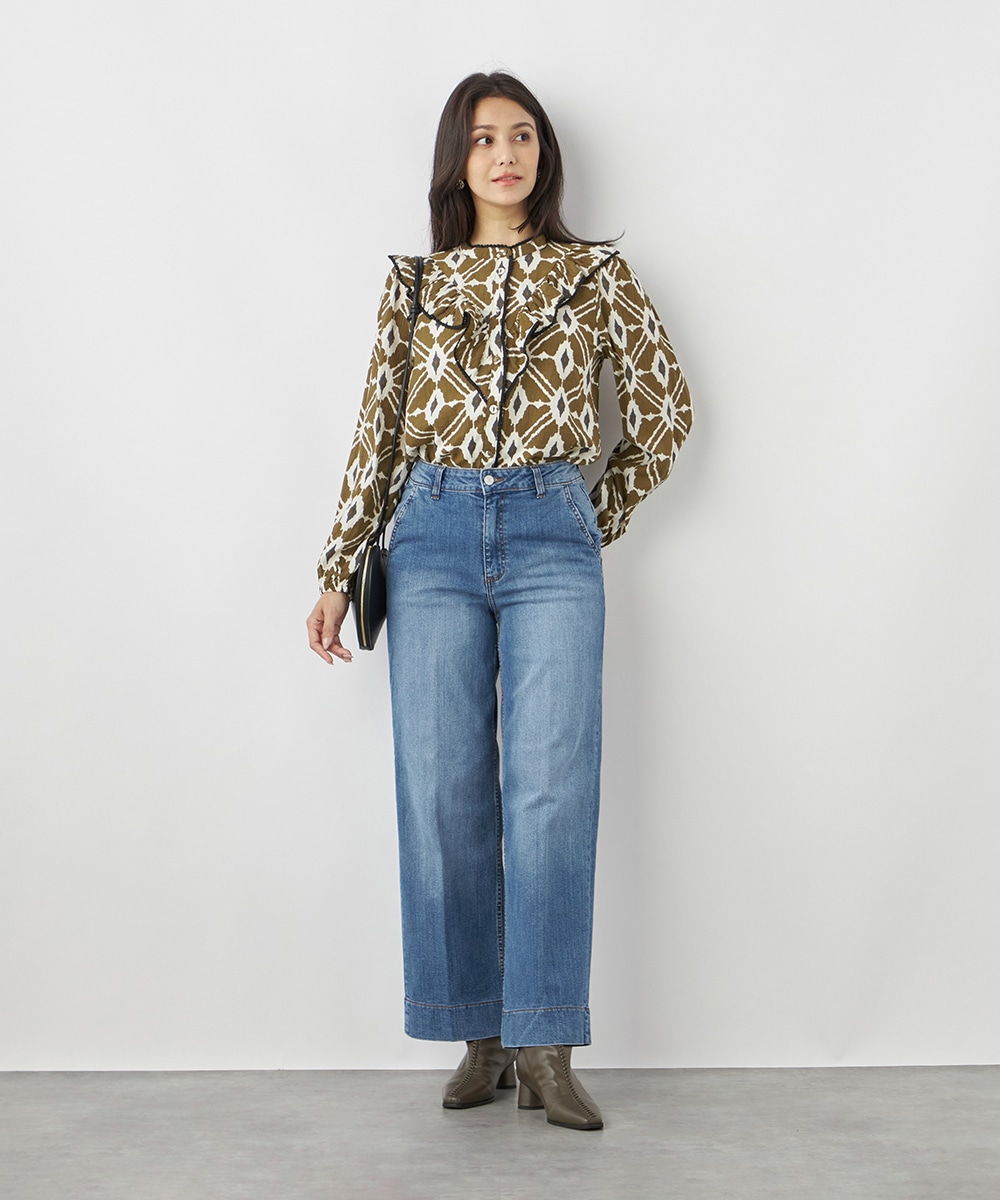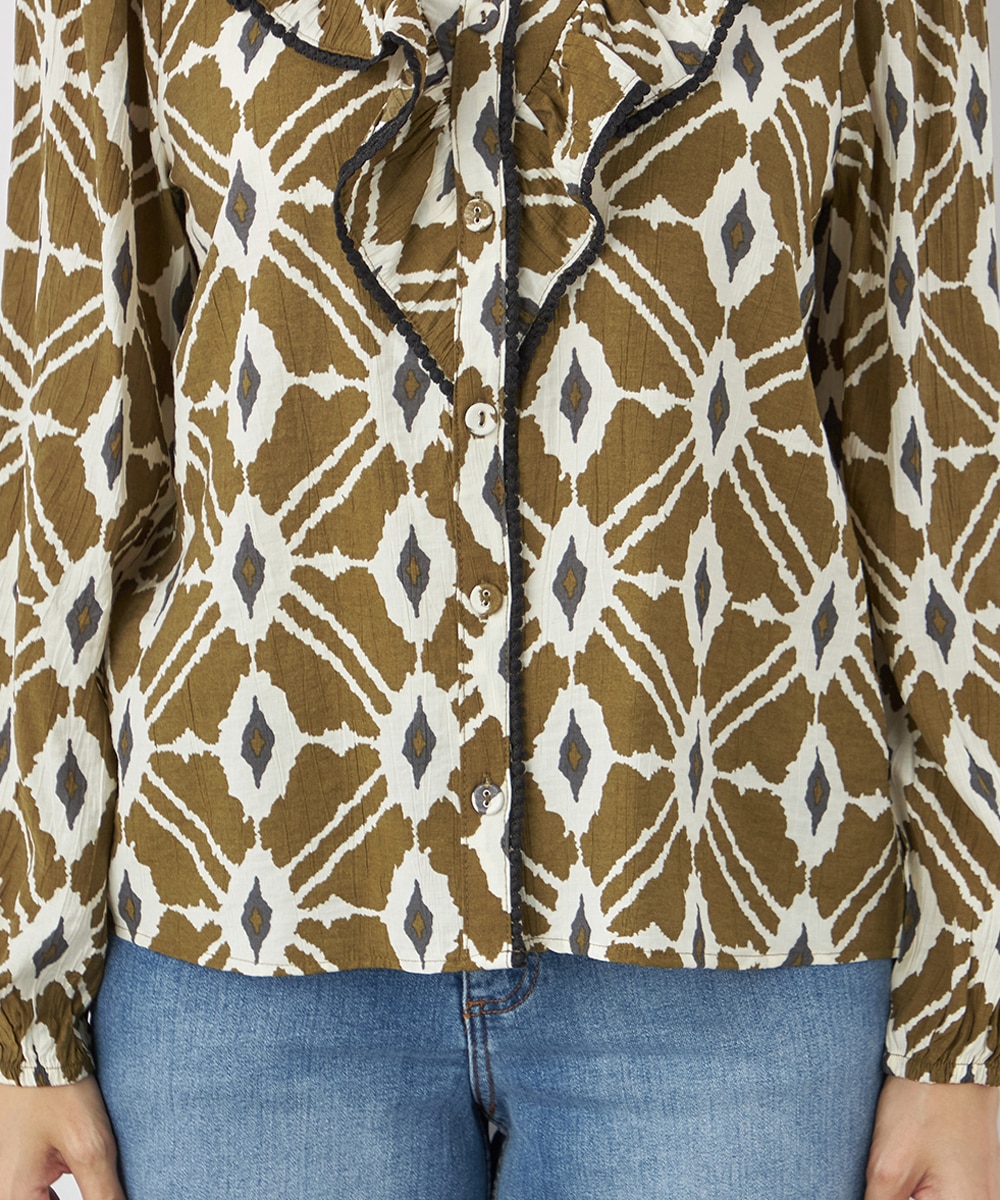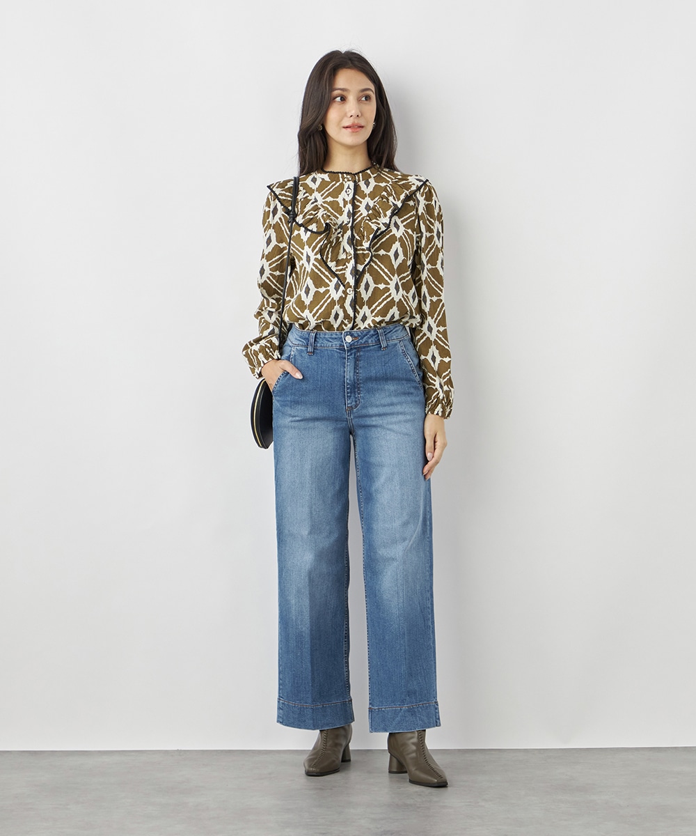 プチパフスリーブやレース使いのプチスタンドネックなど、大人可愛いディテールもポイント。胸元にはフリルをV字型にあしらって華やかさを出しています。同素材のくるみボタンを取り入れており、細かな部分にまでこだわりを感じる贅沢な仕上がり。袖口はゴム仕様です。
