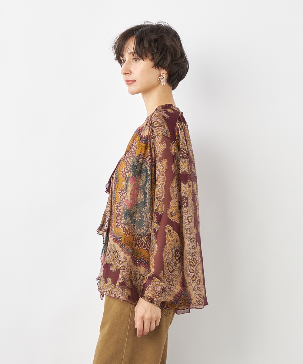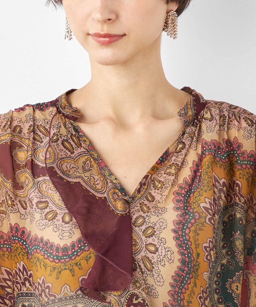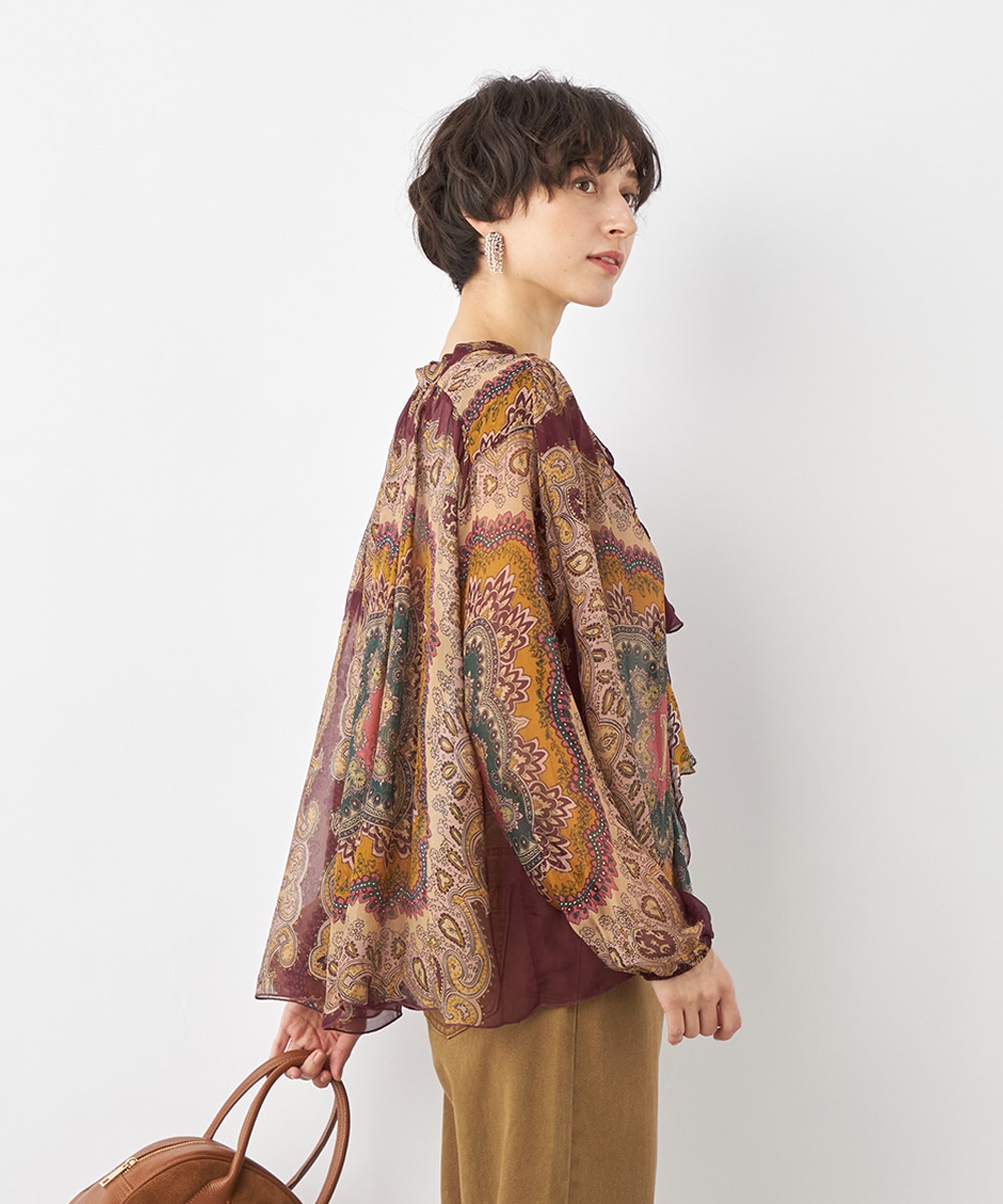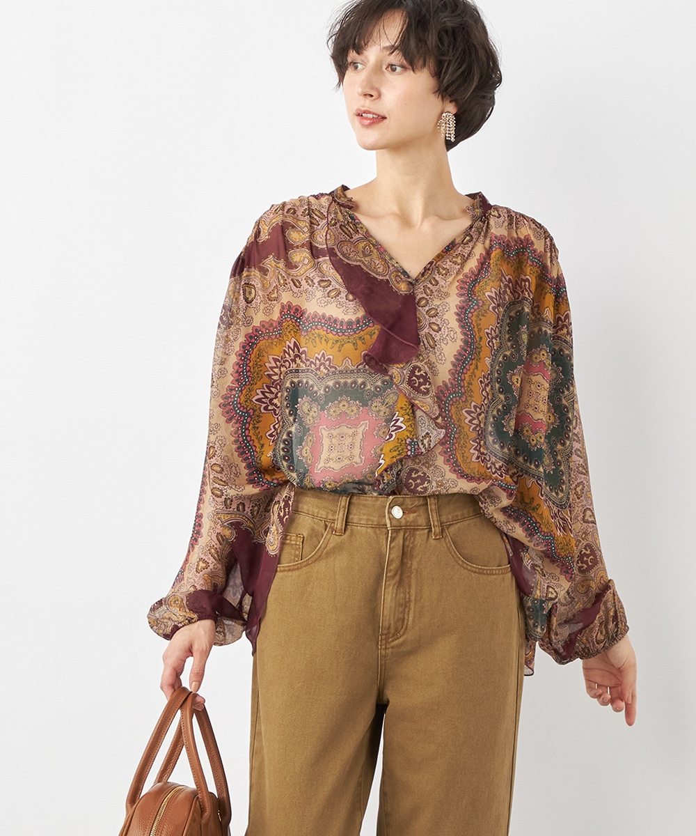 繊細なシアー感とフリルデザインでフェミニンさがアップしています。V字型のカッティングを施したネックと立ち襟でフェイスラインがすっきりと見えるのも魅力です。シルエットはゆったりとしてトレンドにマッチ。着丈は長すぎず、さまざまなボトムスとバランス良く合わせられます。