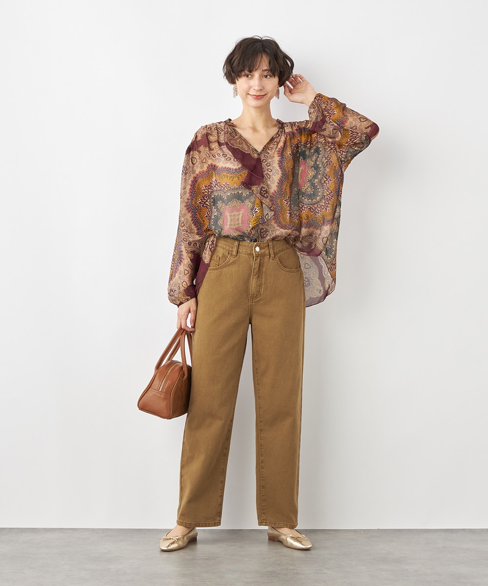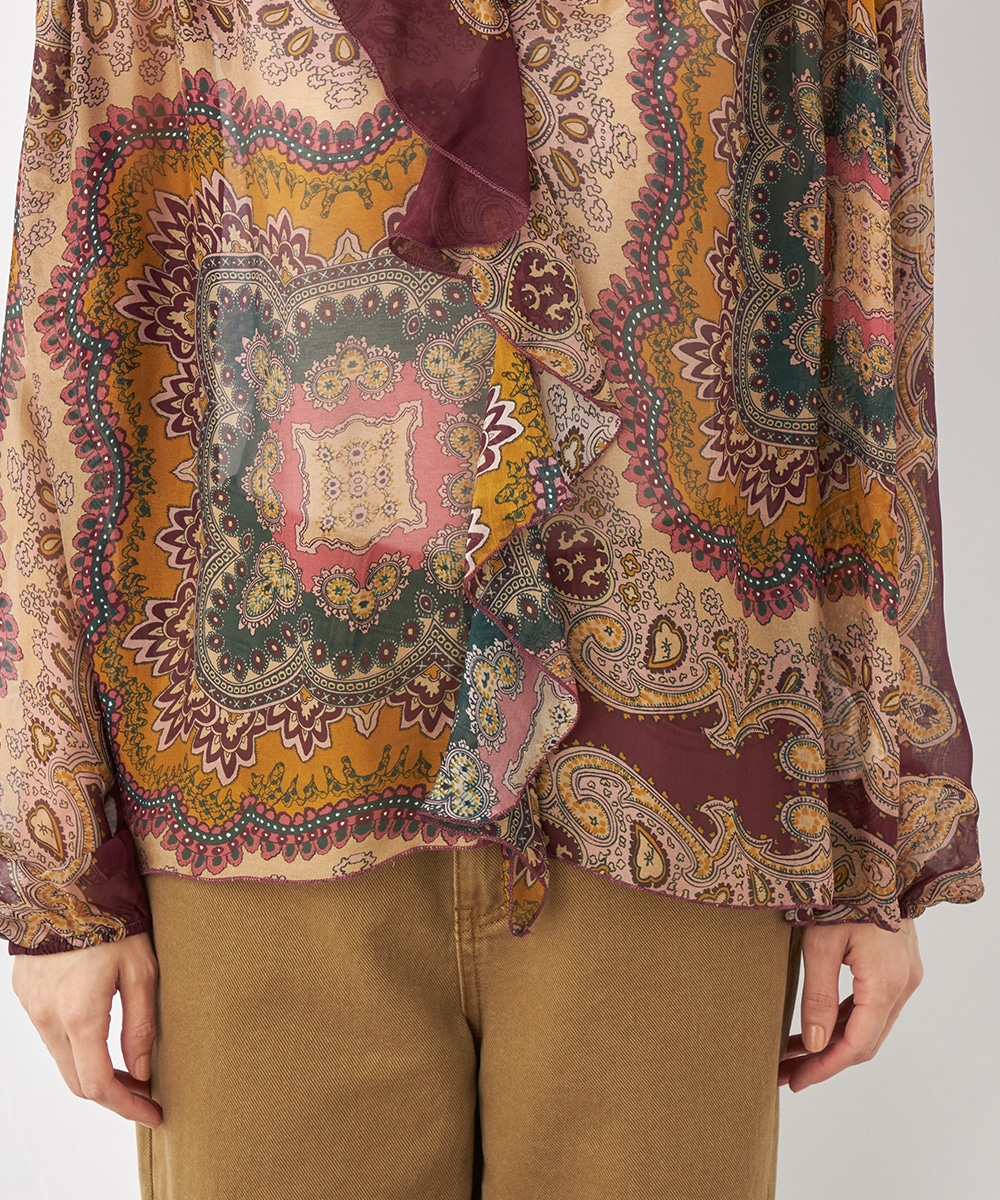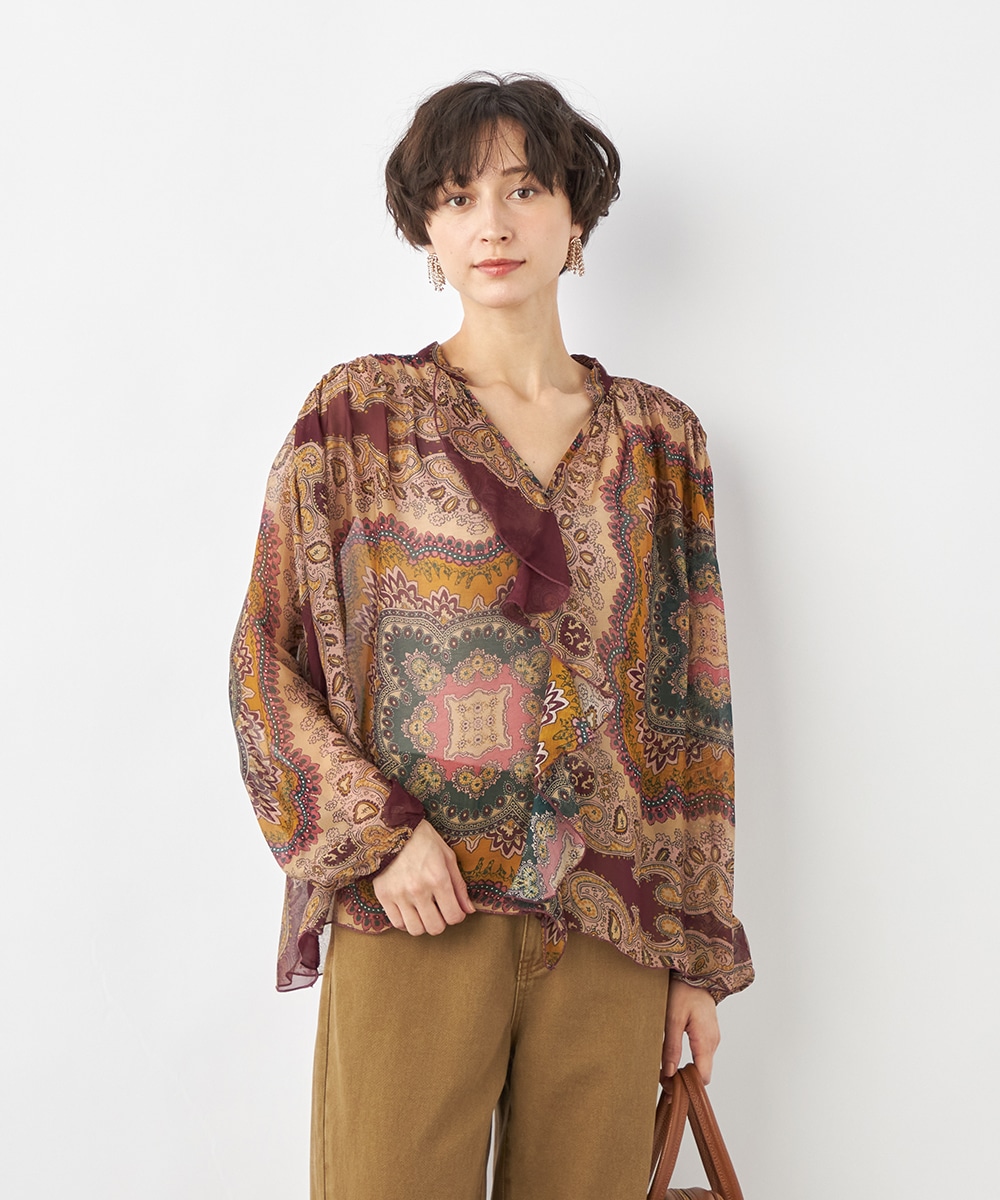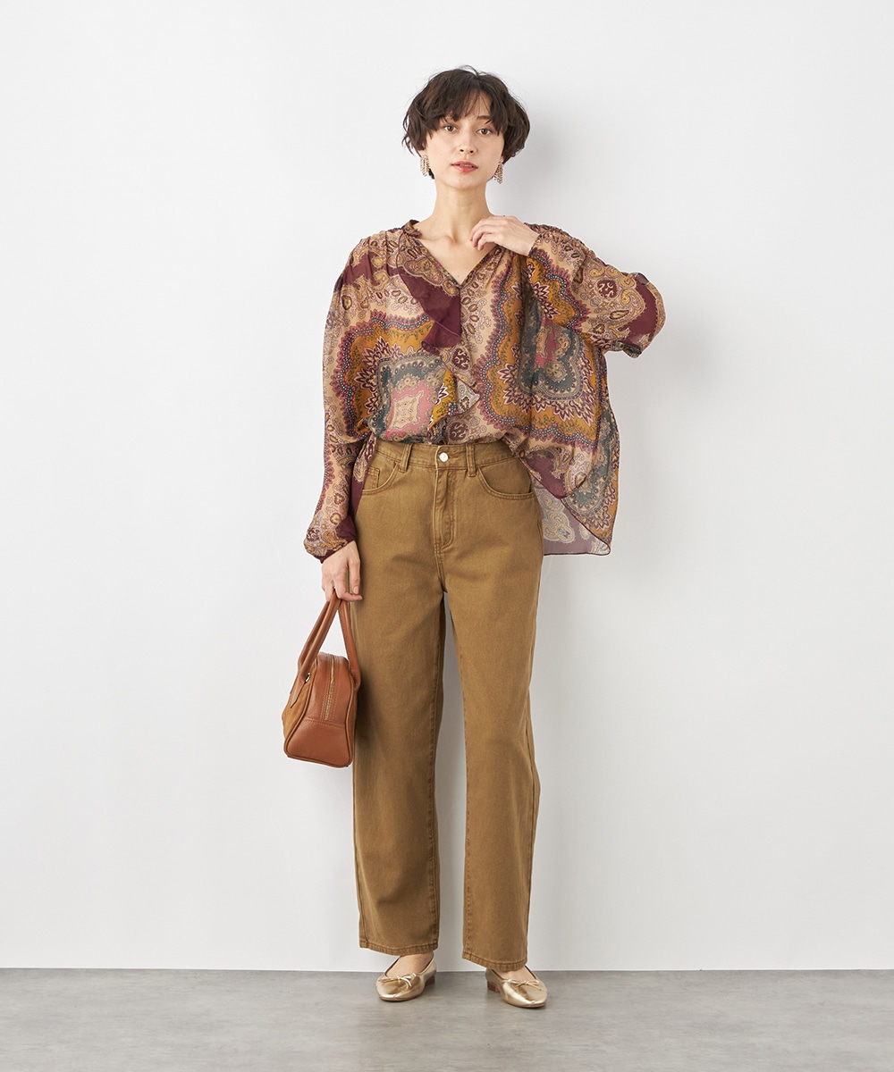 繊細なシアー感とフリルデザインでフェミニンさがアップしています。V字型のカッティングを施したネックと立ち襟でフェイスラインがすっきりと見えるのも魅力です。シルエットはゆったりとしてトレンドにマッチ。着丈は長すぎず、さまざまなボトムスとバランス良く合わせられます。