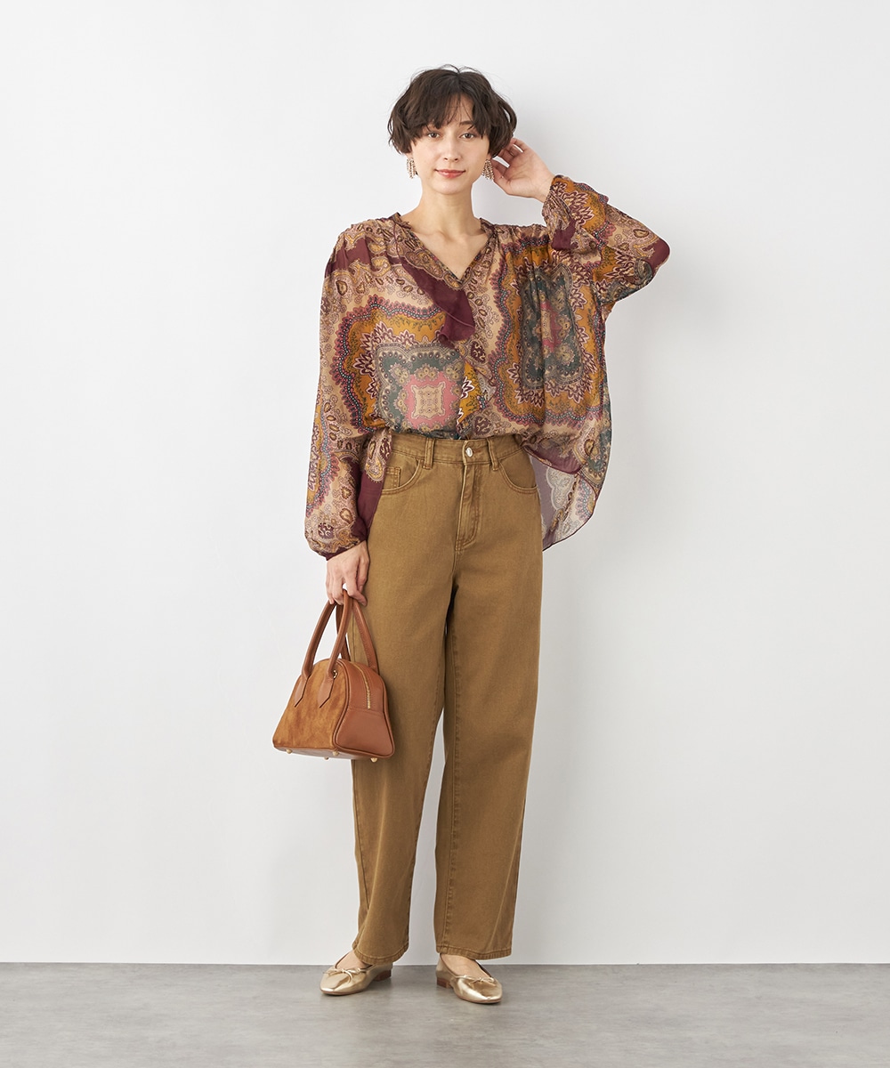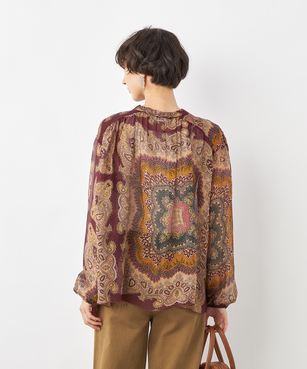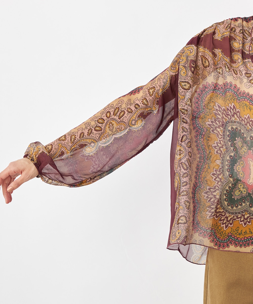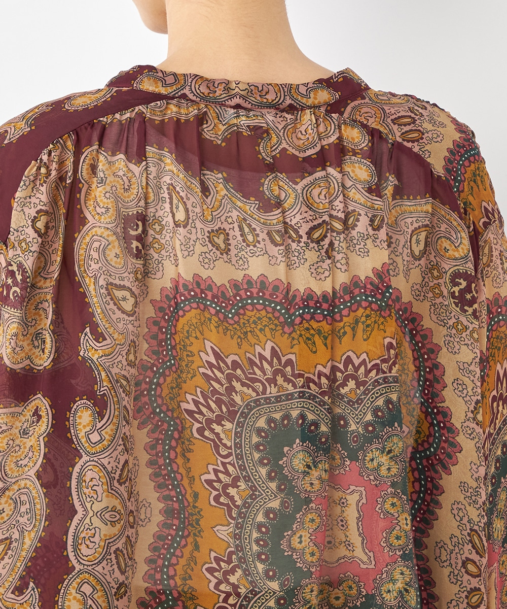 繊細なシアー感とフリルデザインでフェミニンさがアップしています。V字型のカッティングを施したネックと立ち襟でフェイスラインがすっきりと見えるのも魅力です。シルエットはゆったりとしてトレンドにマッチ。着丈は長すぎず、さまざまなボトムスとバランス良く合わせられます。