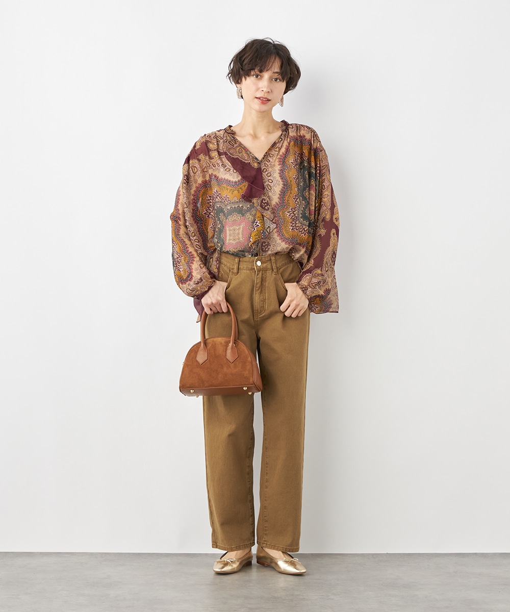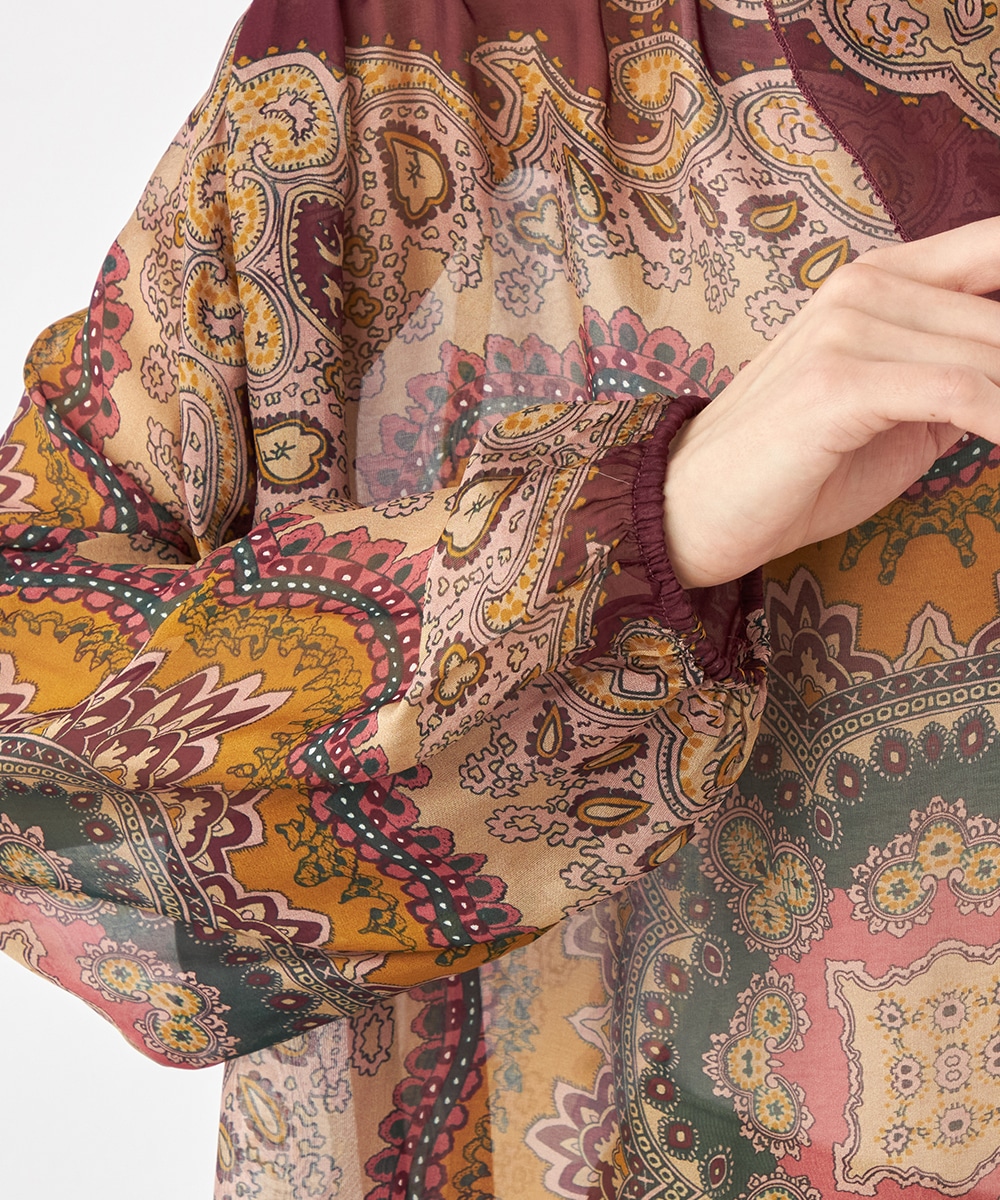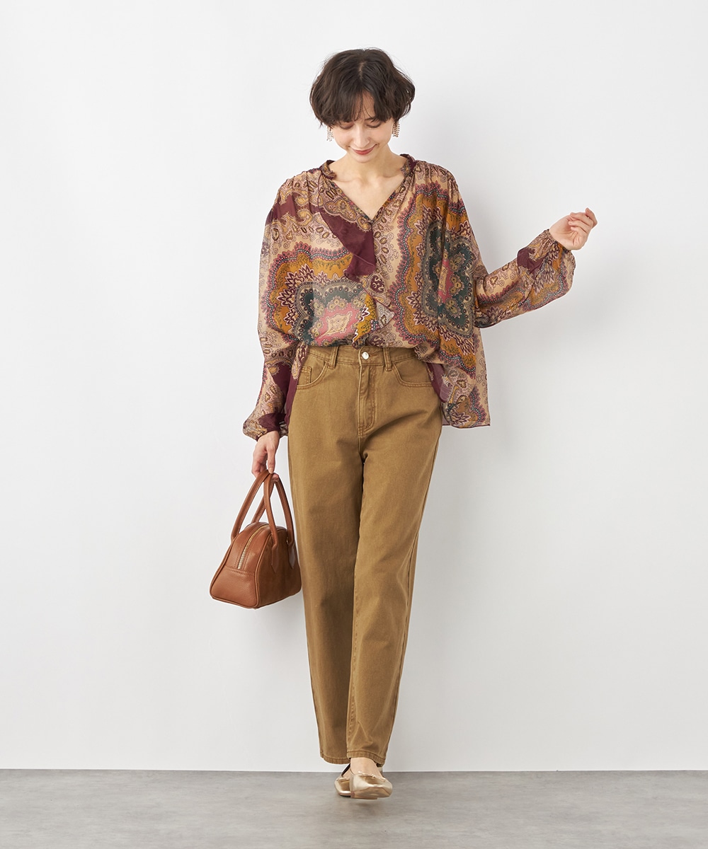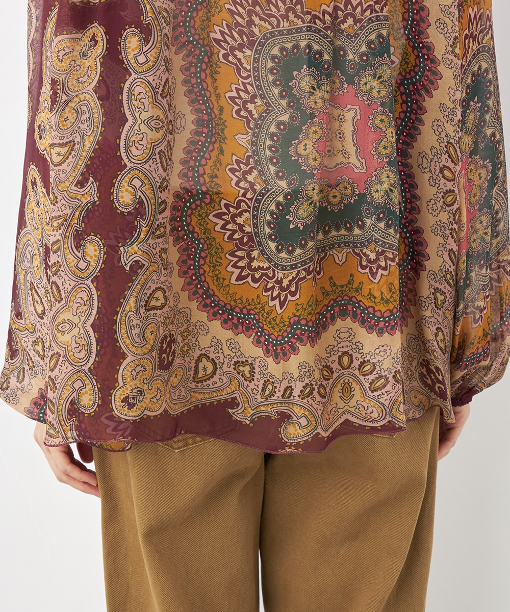繊細なシアー感とフリルデザインでフェミニンさがアップしています。V字型のカッティングを施したネックと立ち襟でフェイスラインがすっきりと見えるのも魅力です。シルエットはゆったりとしてトレンドにマッチ。着丈は長すぎず、さまざまなボトムスとバランス良く合わせられます。