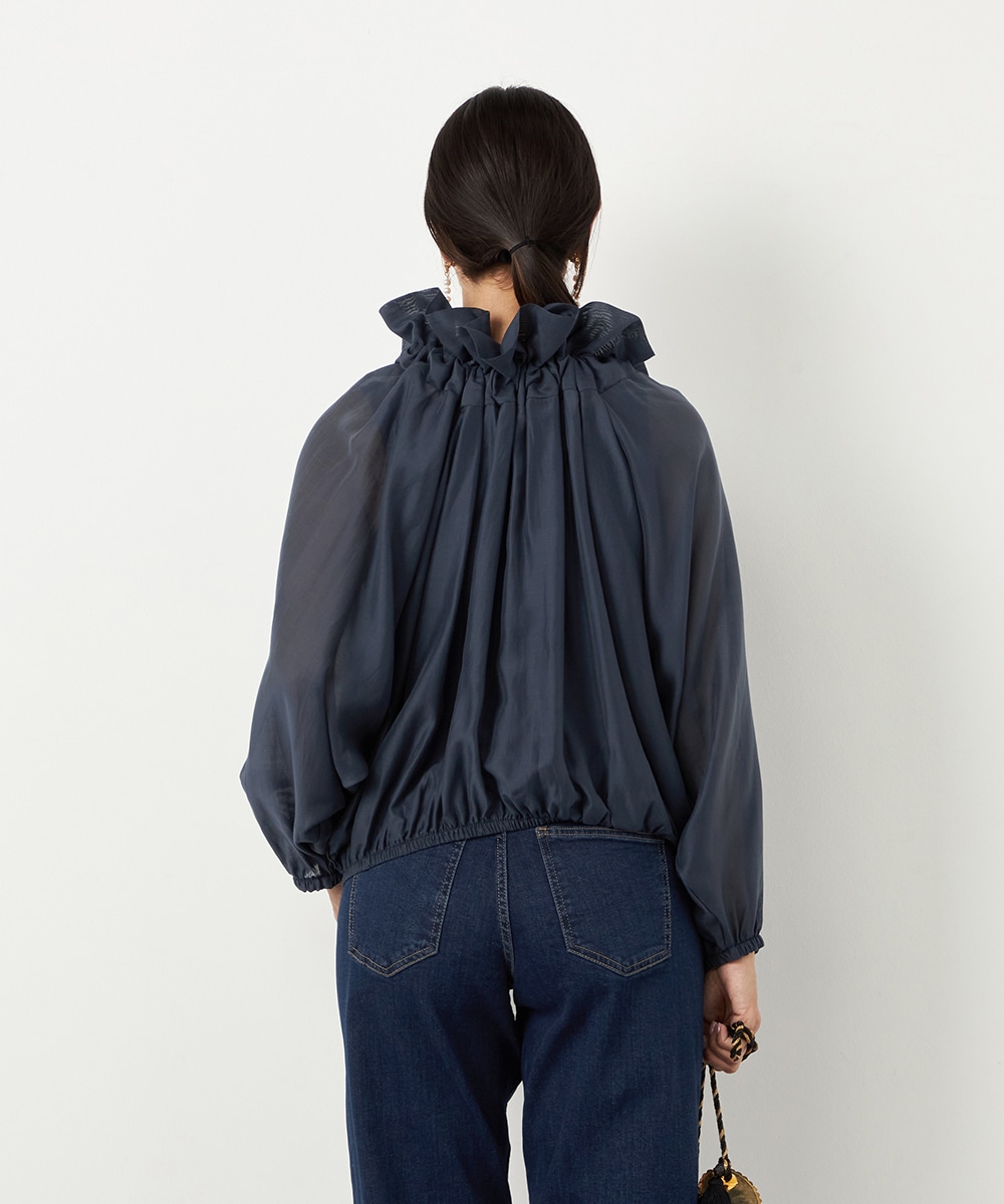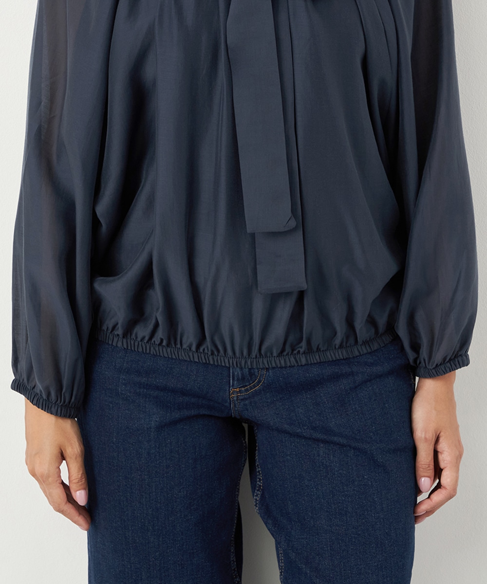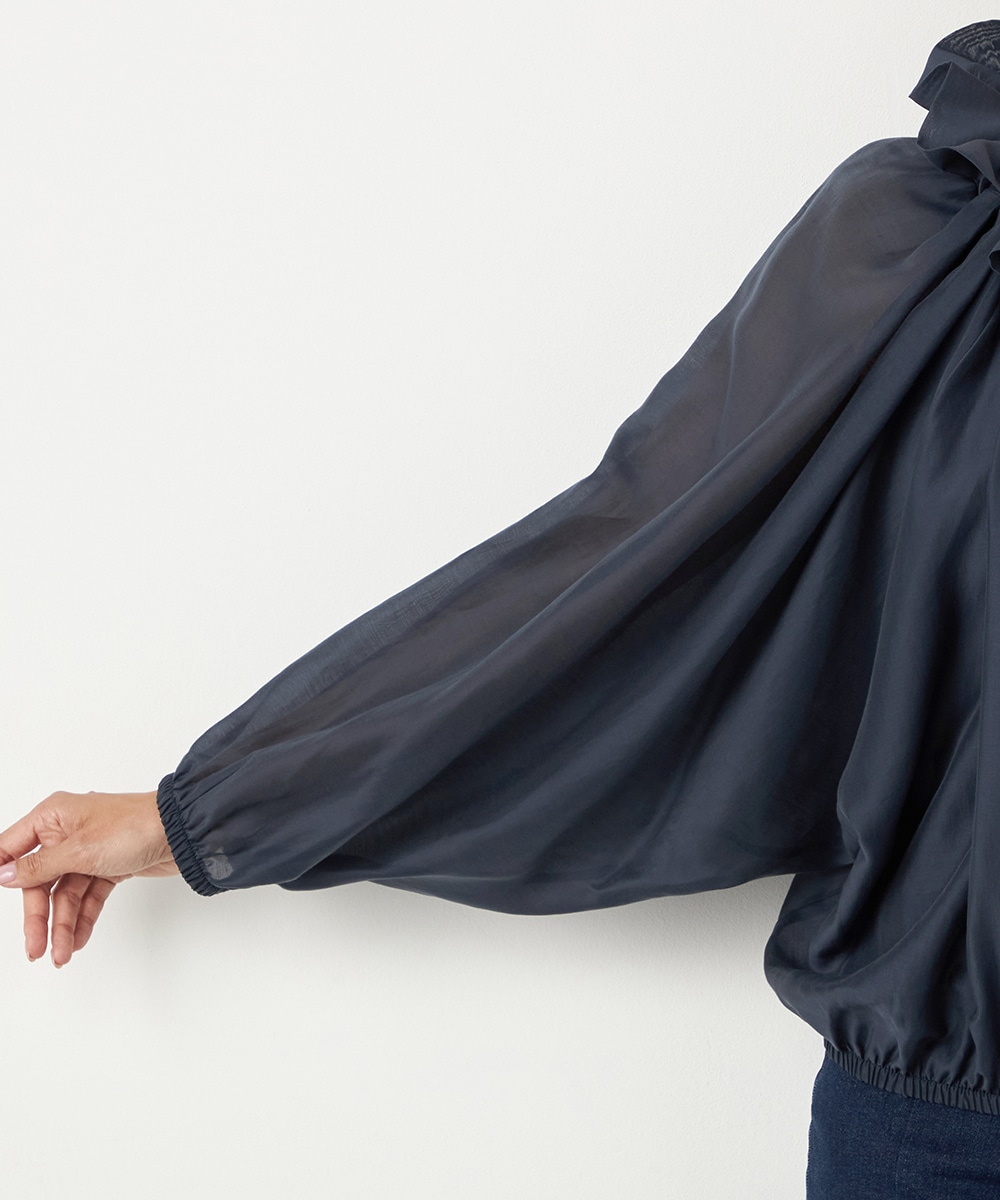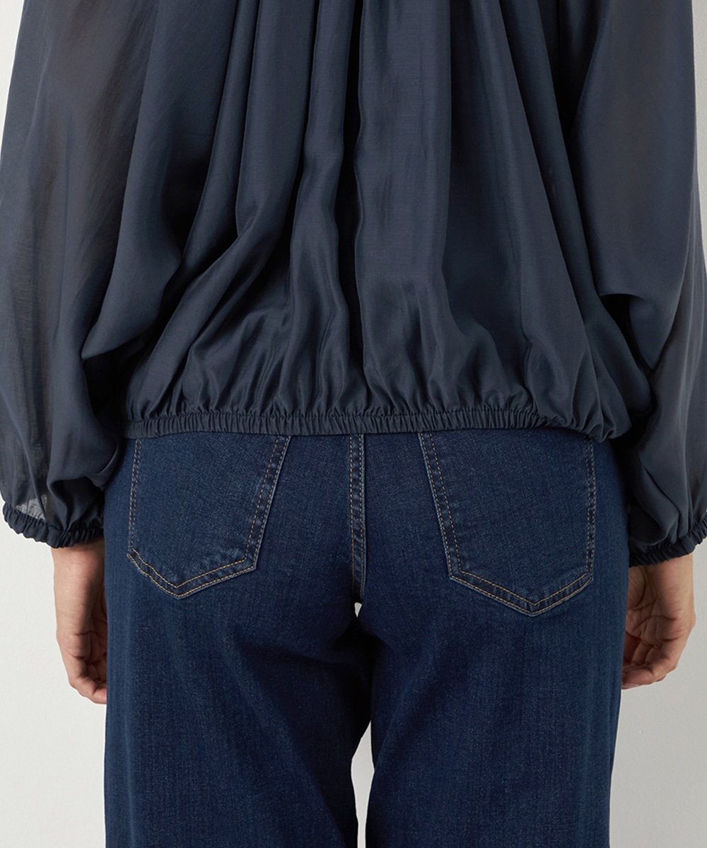光沢のあるシアー素材がトレンドにマッチします。ボリュームたっぷりのシルエットはコーディネートの決め手にもぴったりです。裾はゴムが入ってボディにほどよくフィットします。長すぎない着丈で合わせるボトムスを選ばず、幅広いアレンジを楽しめるのも魅力です。