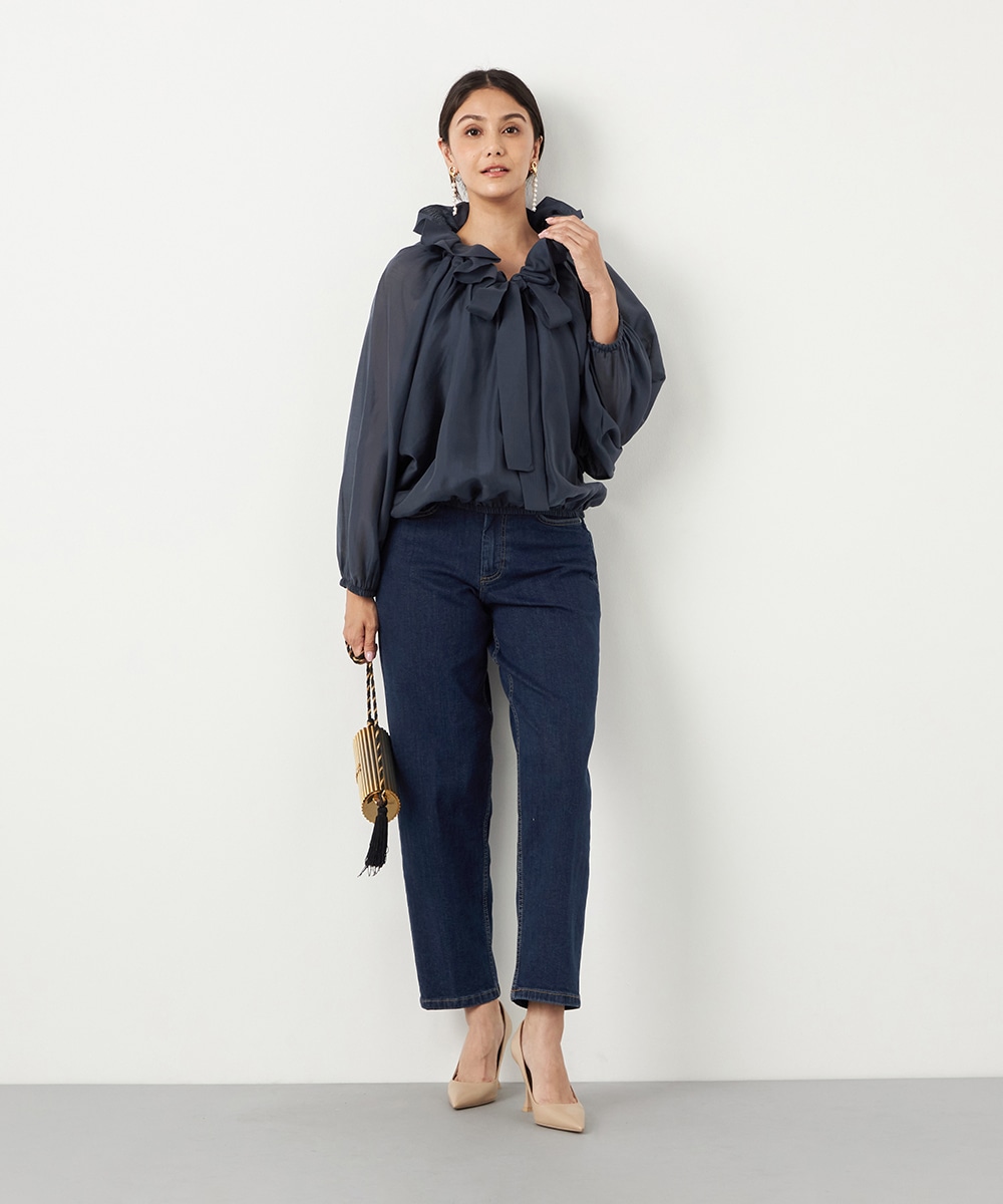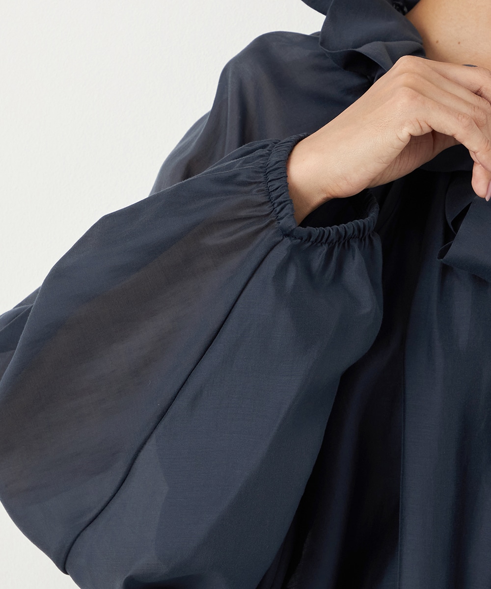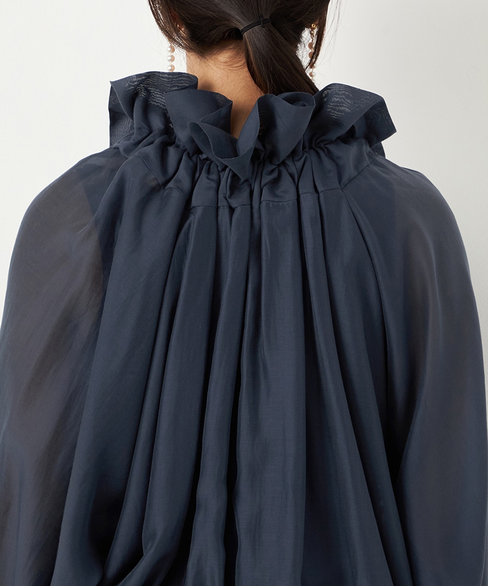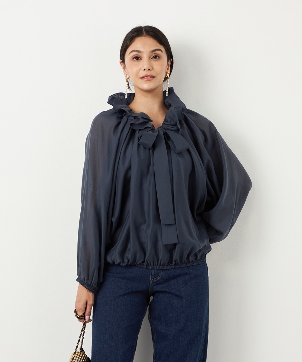 光沢のあるシアー素材がトレンドにマッチします。ボリュームたっぷりのシルエットはコーディネートの決め手にもぴったりです。裾はゴムが入ってボディにほどよくフィットします。長すぎない着丈で合わせるボトムスを選ばず、幅広いアレンジを楽しめるのも魅力です。