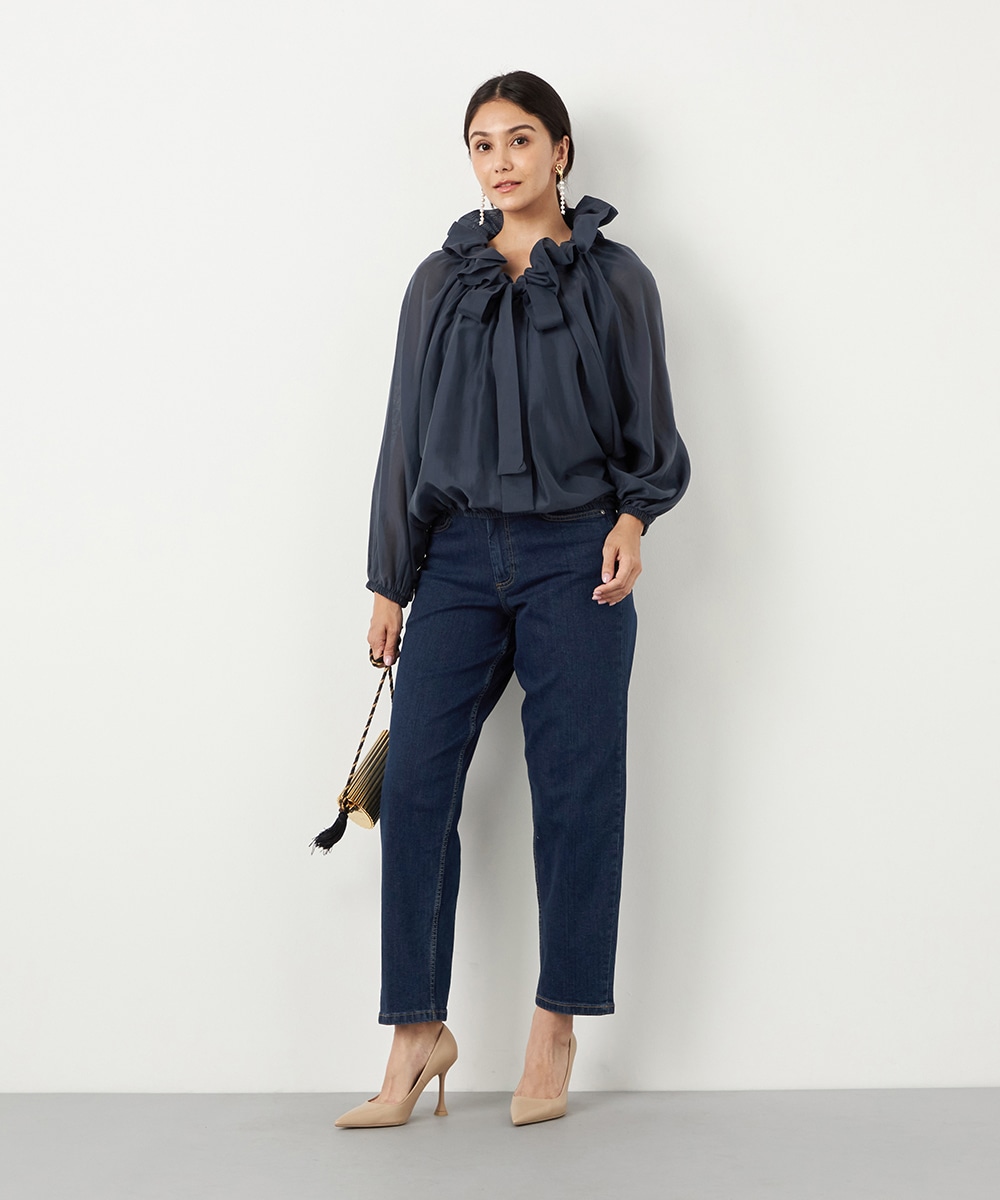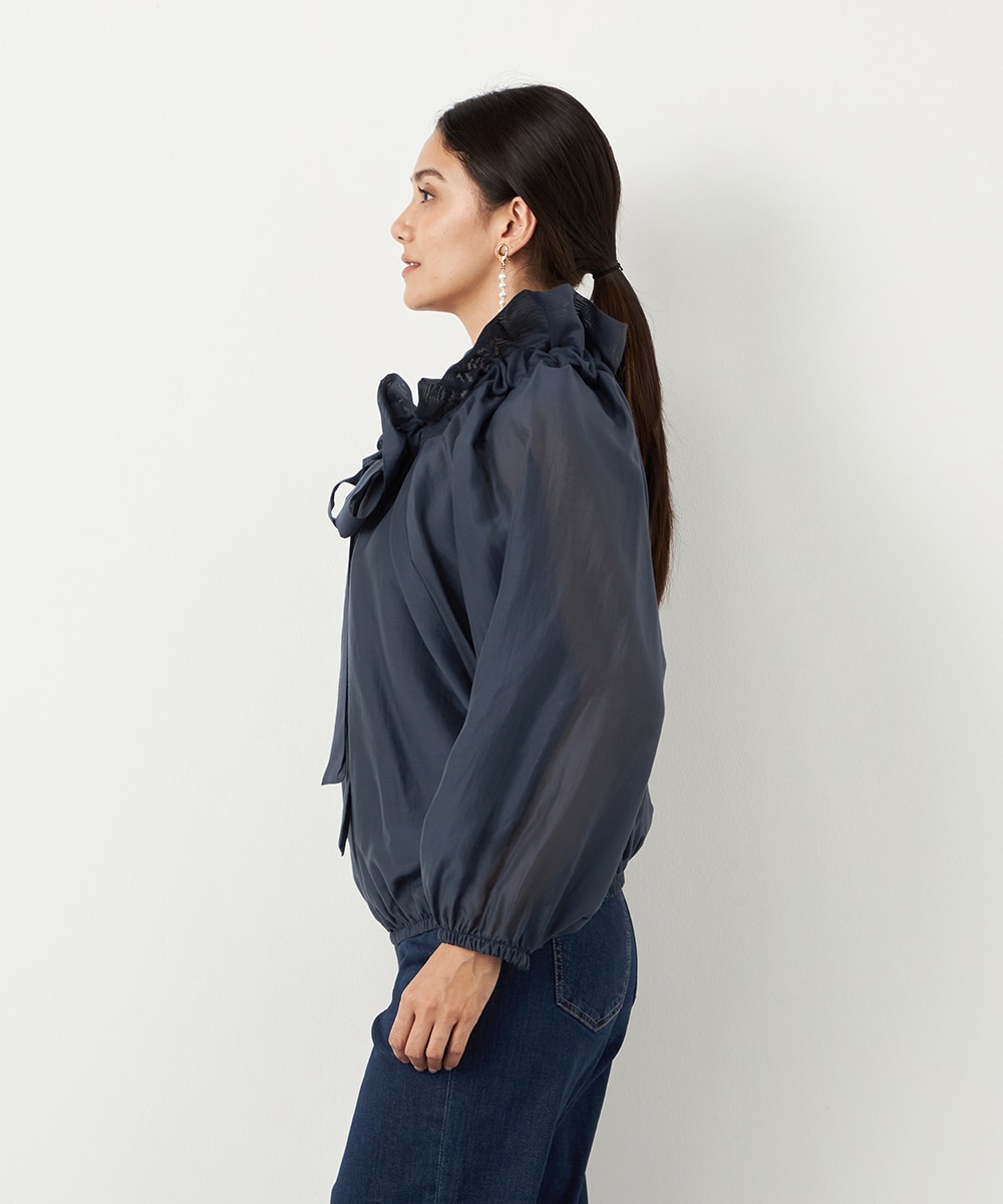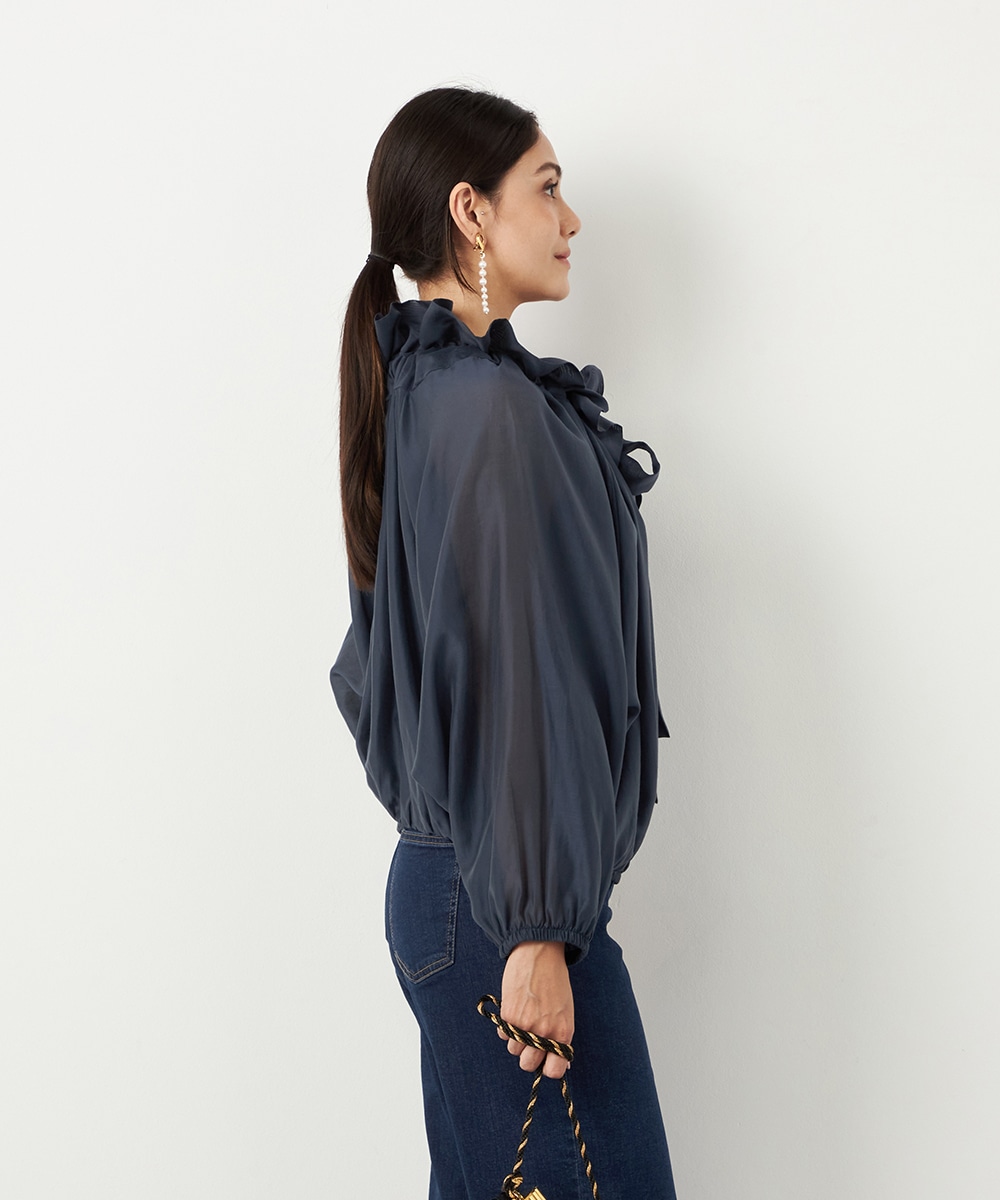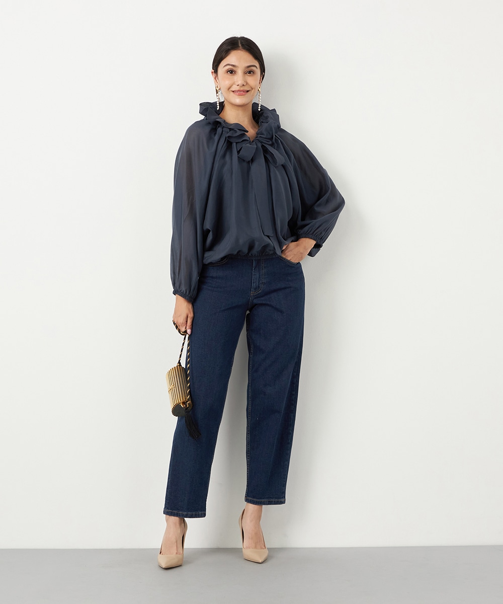 光沢のあるシアー素材がトレンドにマッチします。ボリュームたっぷりのシルエットはコーディネートの決め手にもぴったりです。裾はゴムが入ってボディにほどよくフィットします。長すぎない着丈で合わせるボトムスを選ばず、幅広いアレンジを楽しめるのも魅力です。