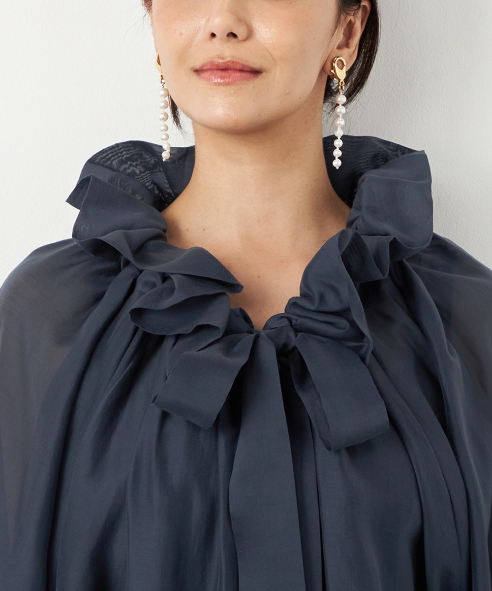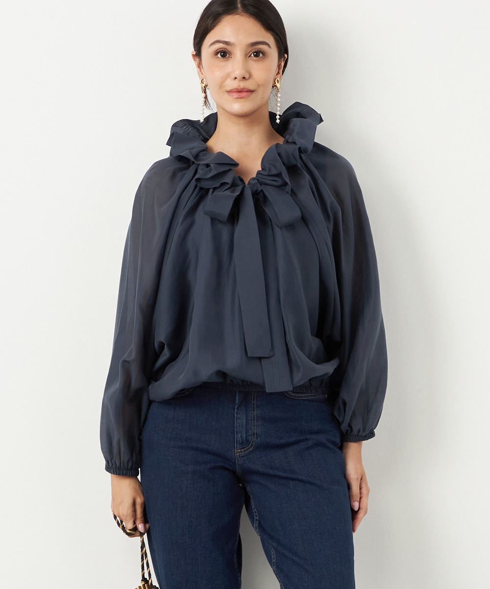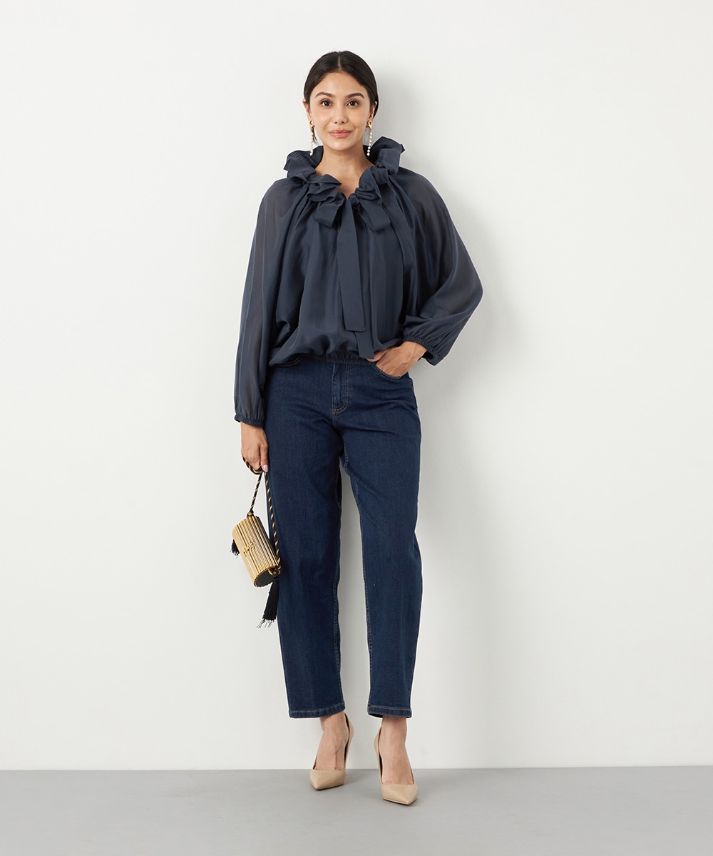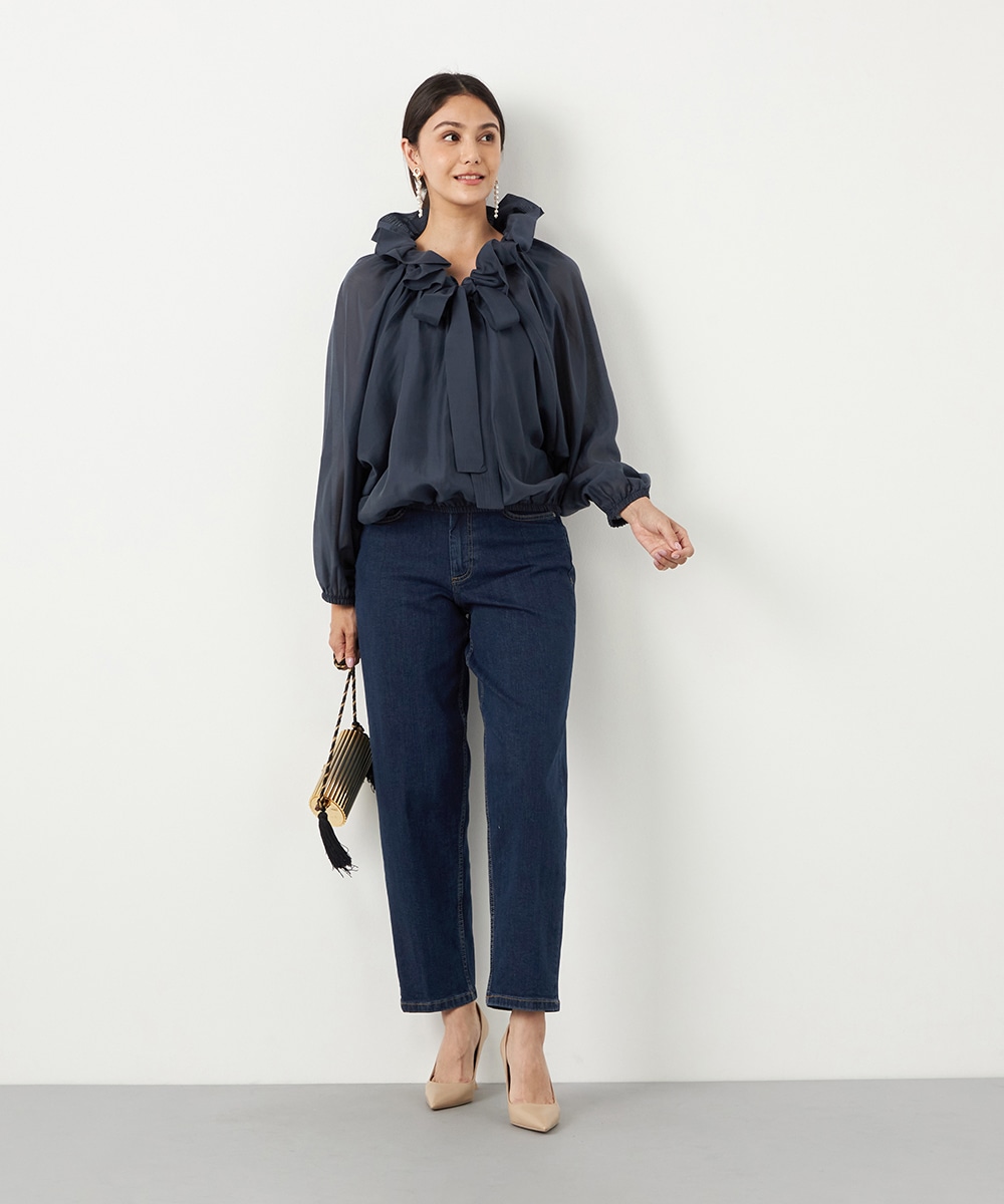 光沢のあるシアー素材がトレンドにマッチします。ボリュームたっぷりのシルエットはコーディネートの決め手にもぴったりです。裾はゴムが入ってボディにほどよくフィットします。長すぎない着丈で合わせるボトムスを選ばず、幅広いアレンジを楽しめるのも魅力です。